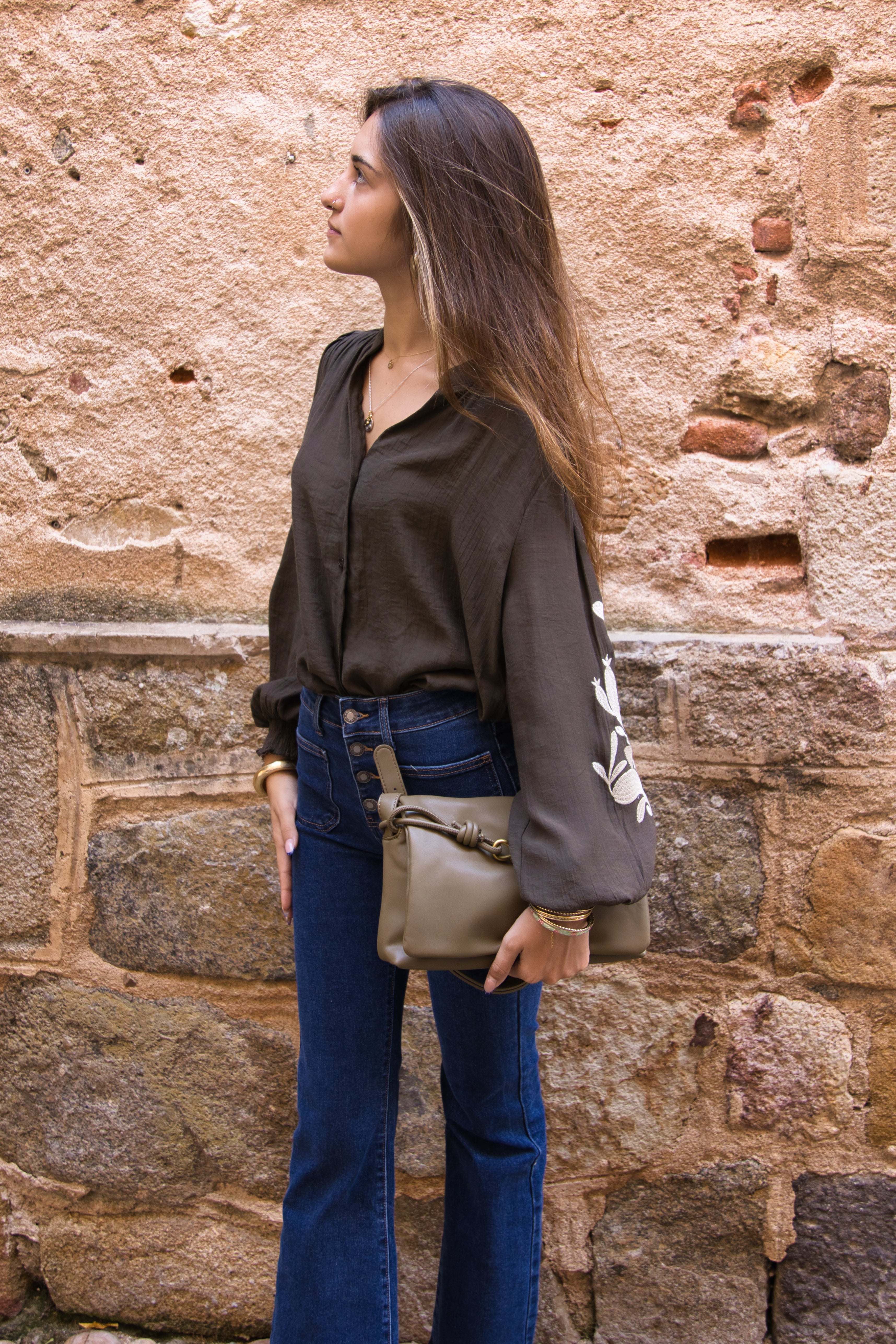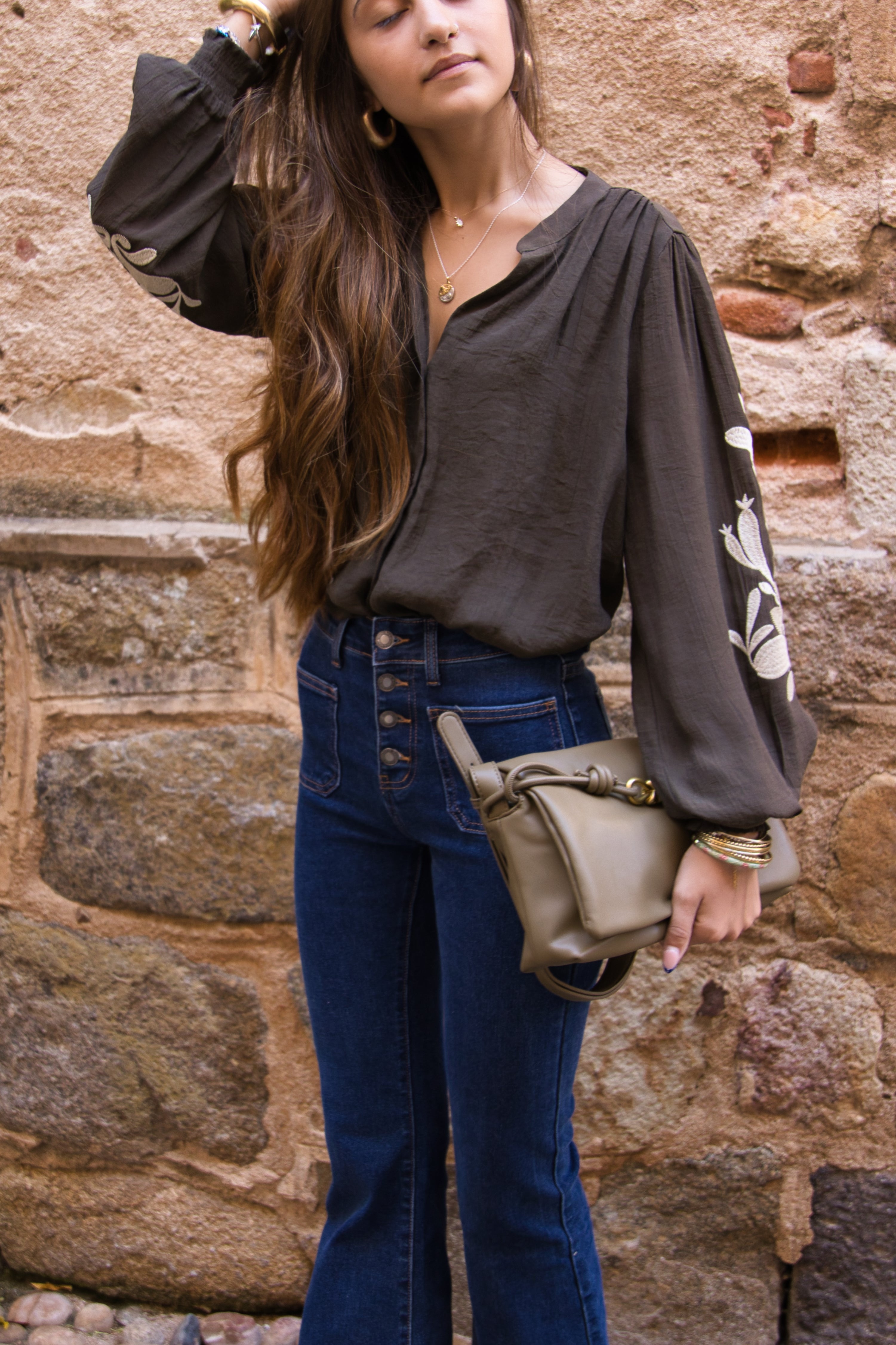 Blusa fluida con manga larga abullonada y bordado en contraste. Diseño con botones delanteros y corte relajado que aporta comodidad y estilo. Disponible en tallas S/M y L/XL.