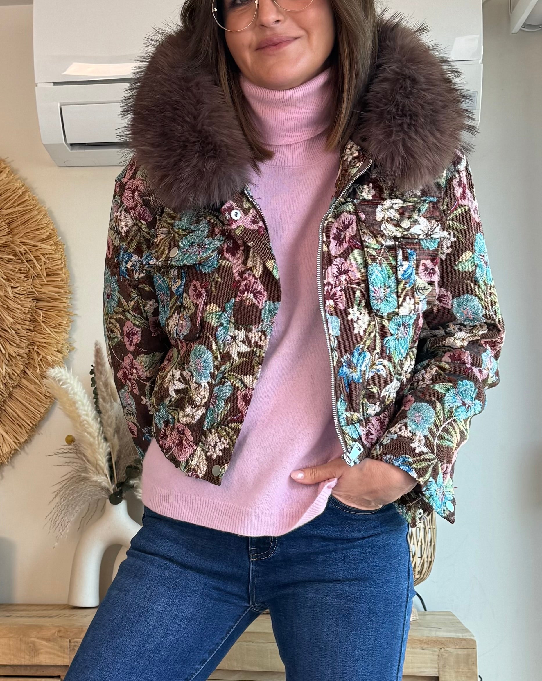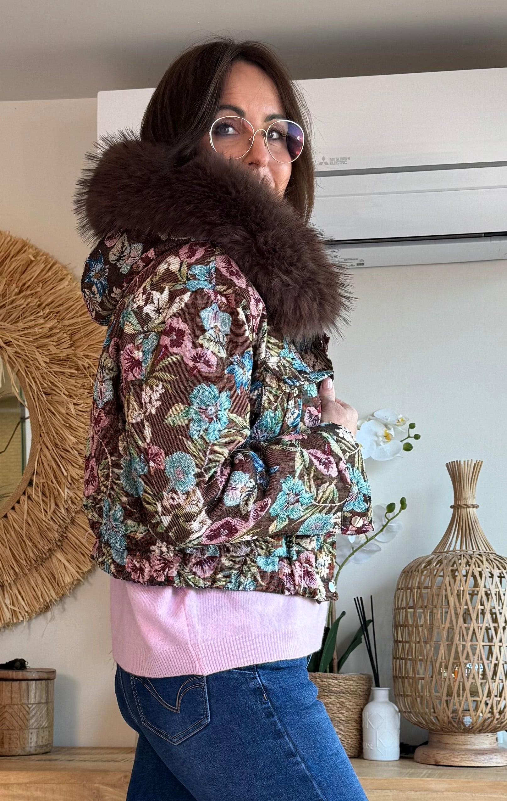 Chaqueta corta estilo jacquard con estampado floral en relieve. Capucha con pelo extraíble. Una prenda especial, calentita y con ese toque vintage chic que eleva cualquier look.Medidas: Talla S/M= 36/38/40 M/L=42/44