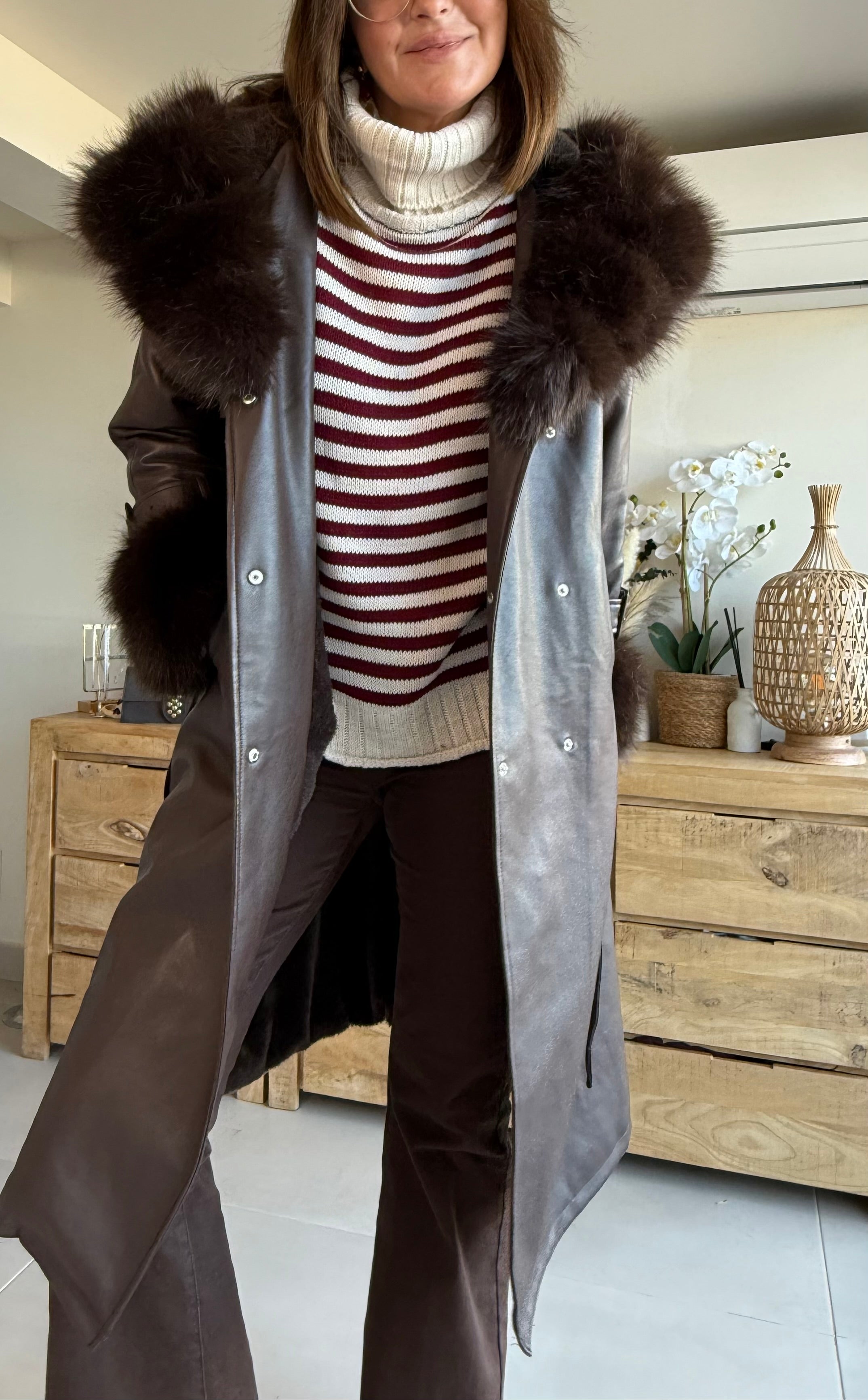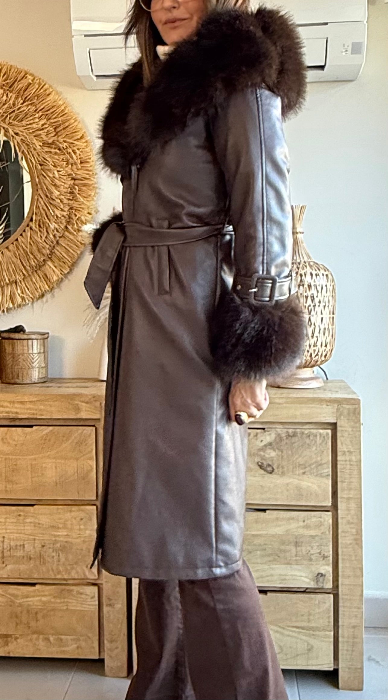 Este abrigo Luxe Capucha Fur – Brown Edition está confeccionado en piel vegana de alta calidad con un tacto suave, resistente y muy sofisticado.