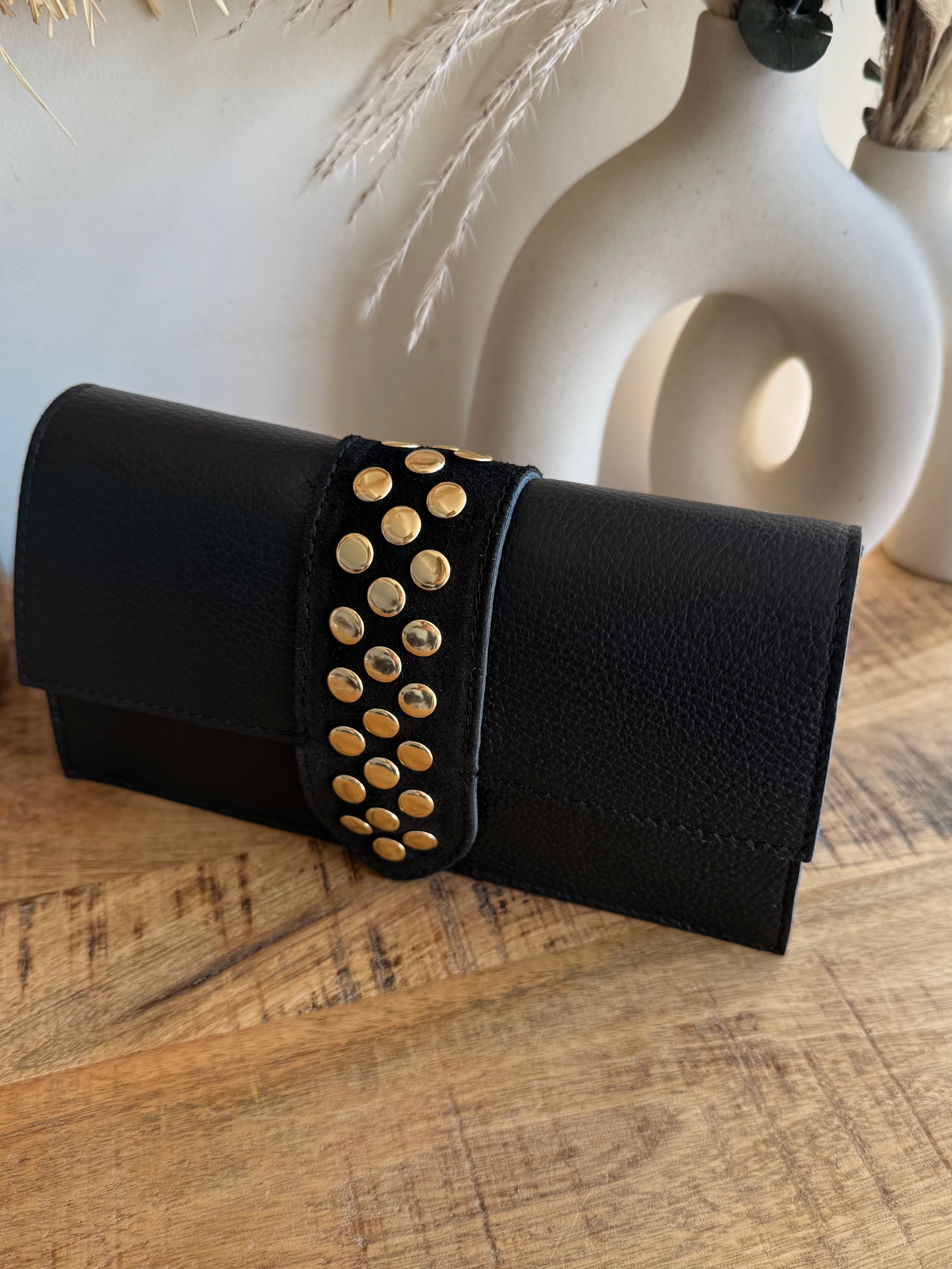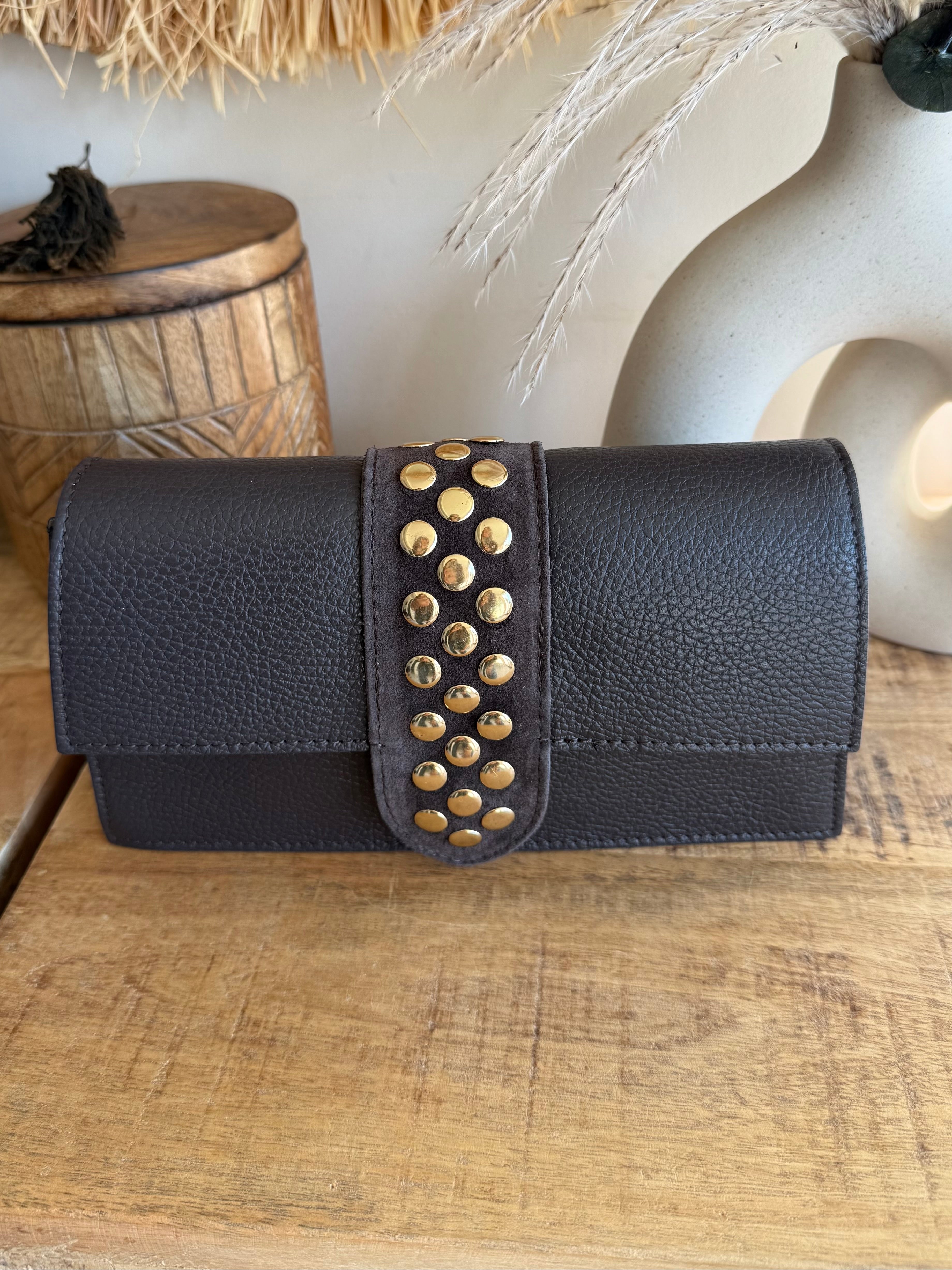 Bolso bandolera de piel auténtica con detalle de tachuelas doradas en la solapa, que aporta un toque moderno y sofisticado. Su tamaño compacto y práctico lo convierte en el accesorio perfecto para tu día a día o para salir con estilo.
