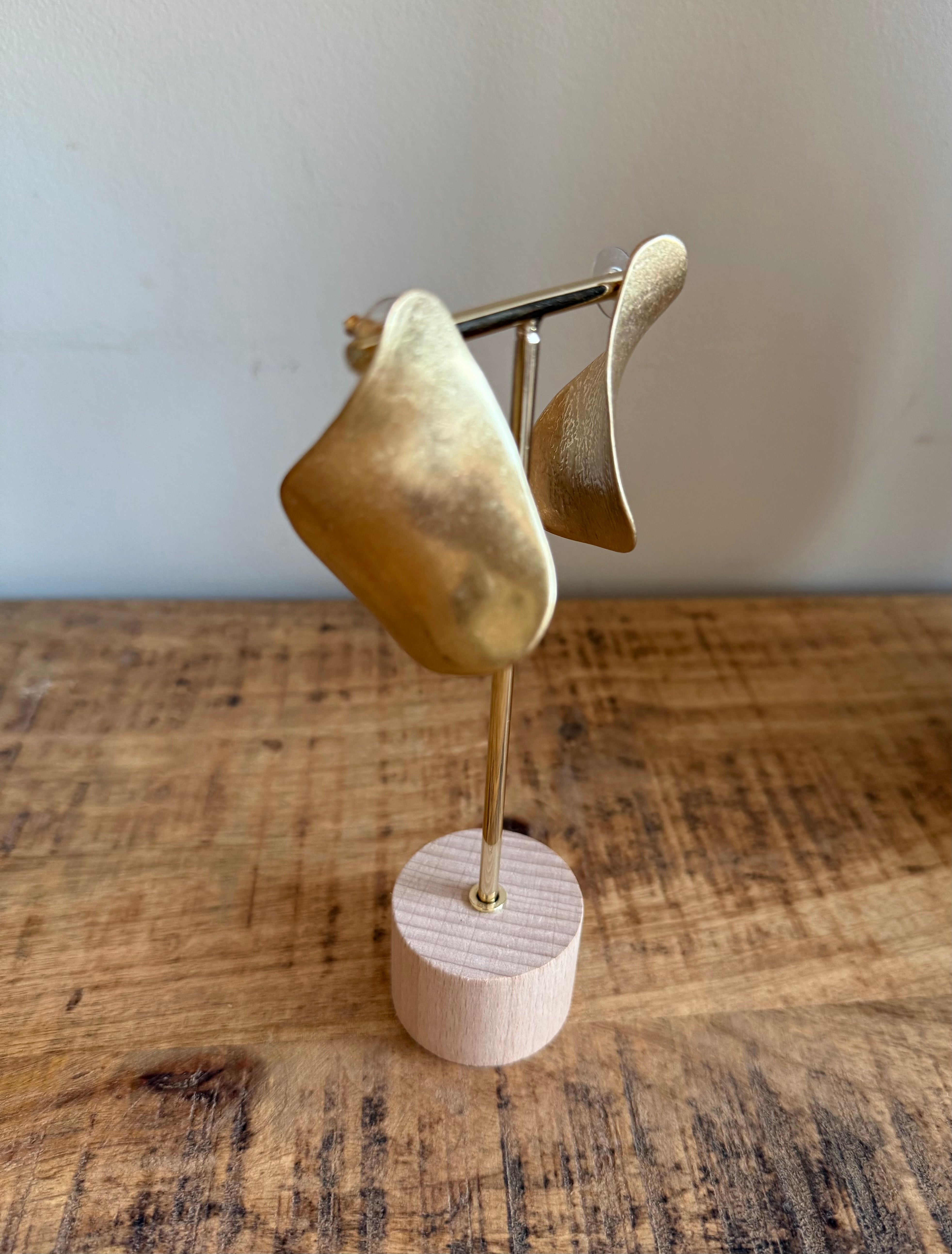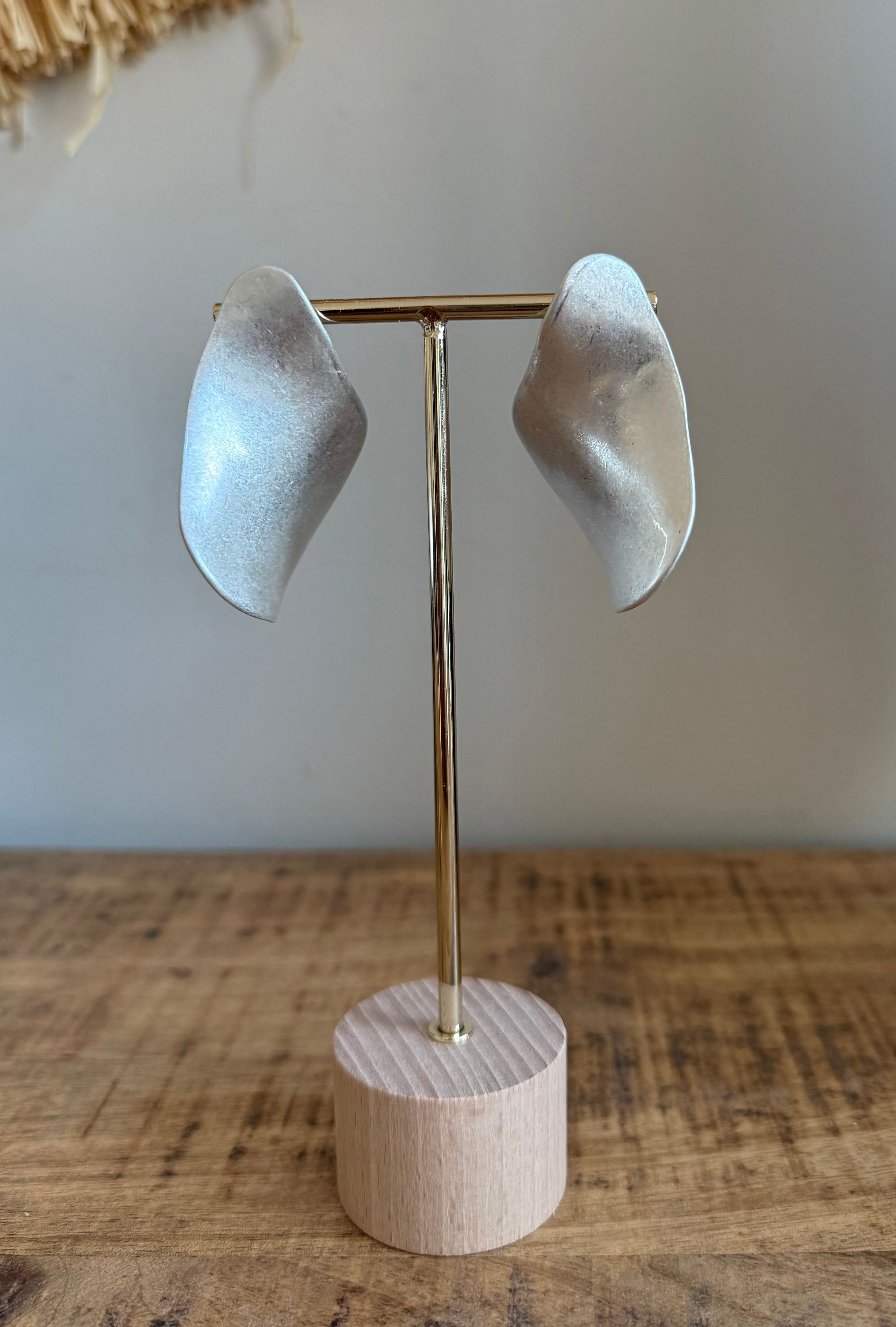 Pendientes de diseño orgánico con acabado mate, inspirados en el movimiento natural de las olas. Su forma curva y elegante aporta un aire sofisticado y moderno, convirtiéndolos en la pieza perfecta para elevar cualquier look. Disponibles en dorado y plateado, son ligeros y muy cómodos de llevar.