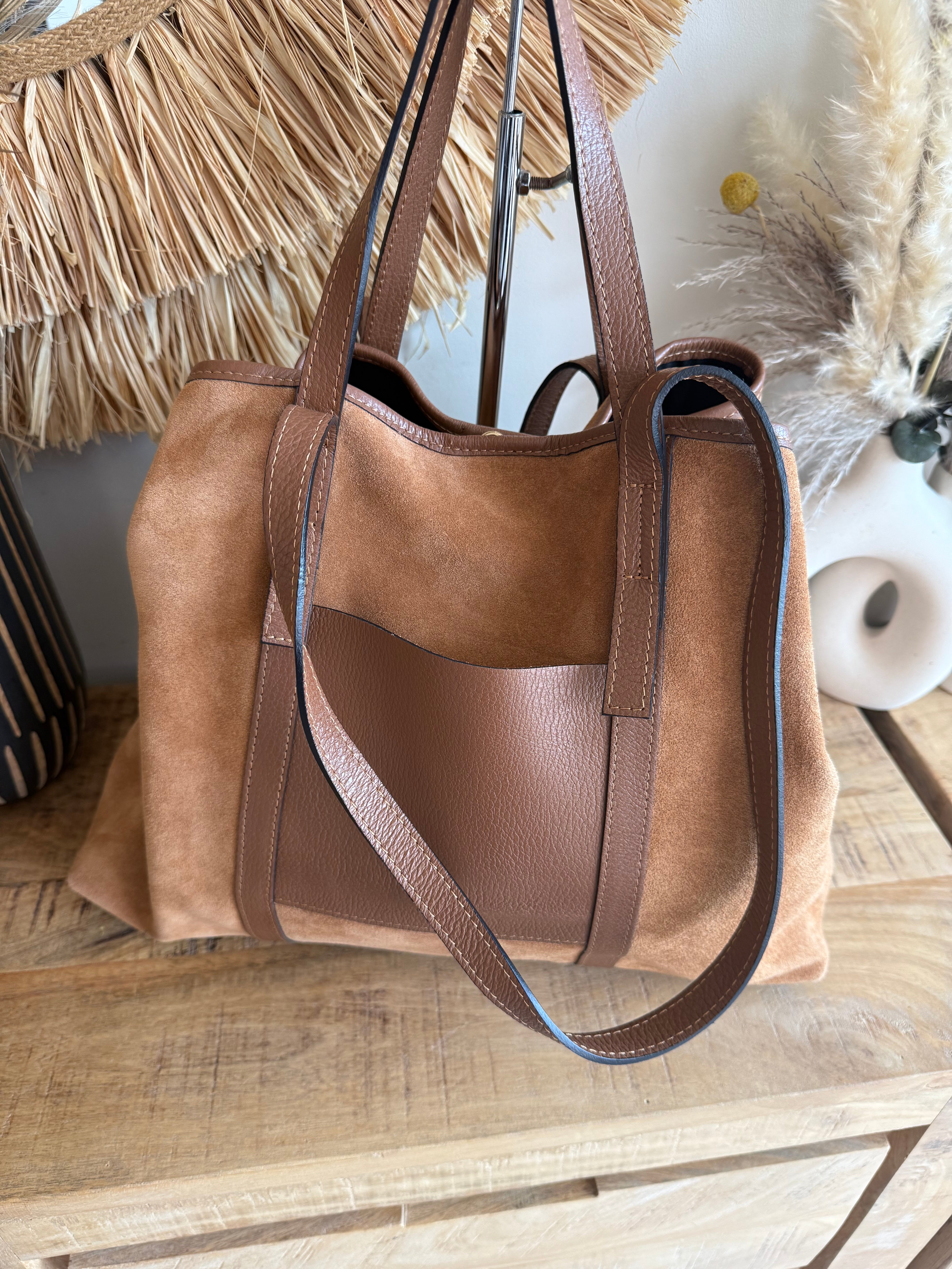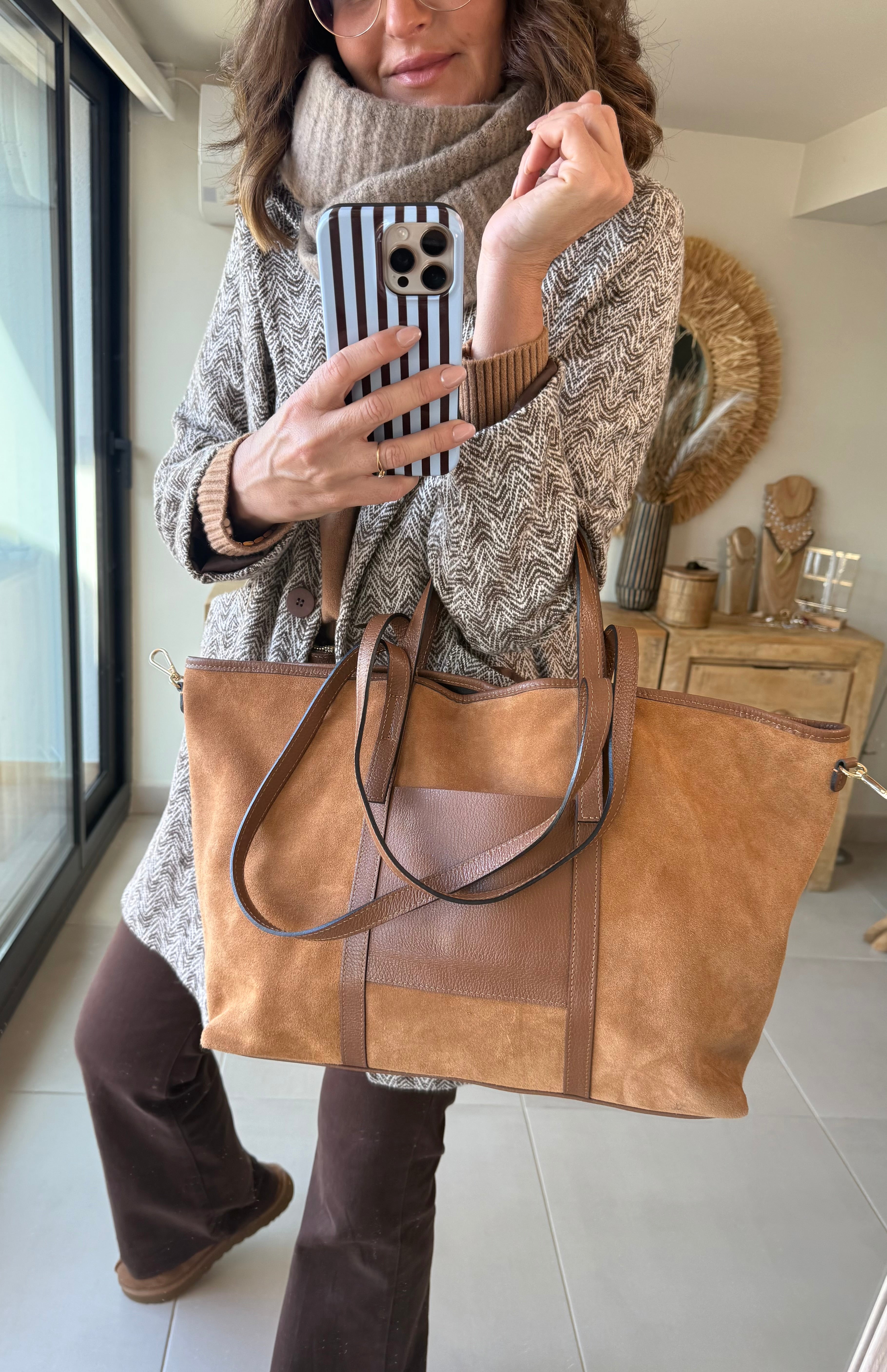 El Shopping Bag Verona es ese bolso todoterreno que combina estilo y funcionalidad. Fabricado en piel vuelta suave con detalles en piel lisa, tiene un diseño amplio, ligero y muy cómodo de llevar. Puedes usarlo muy abierto para un look relajado o cerrarlo con sus ganchos laterales, que mantienen el bolso recogido y seguro sin necesidad de cremallera.