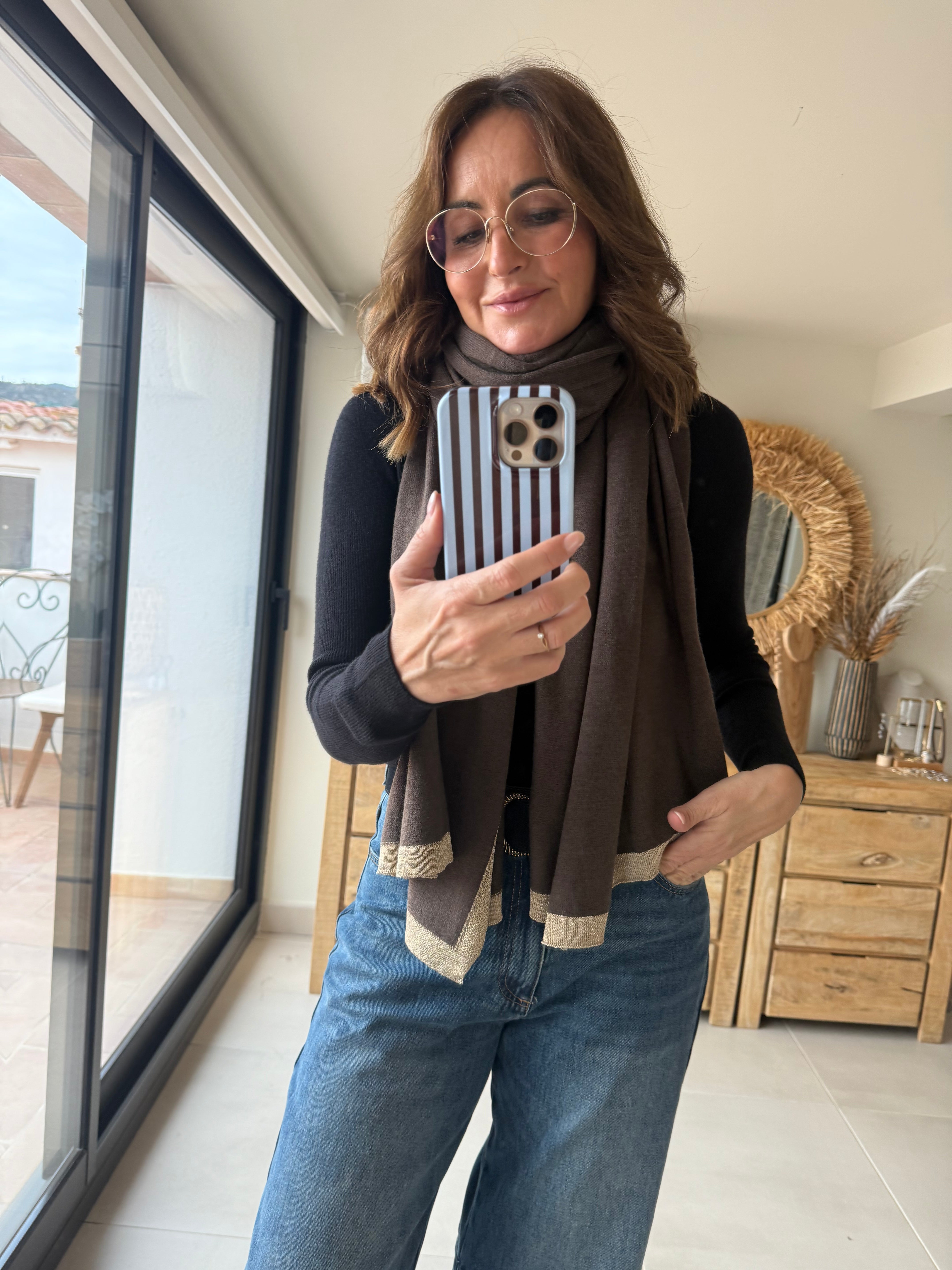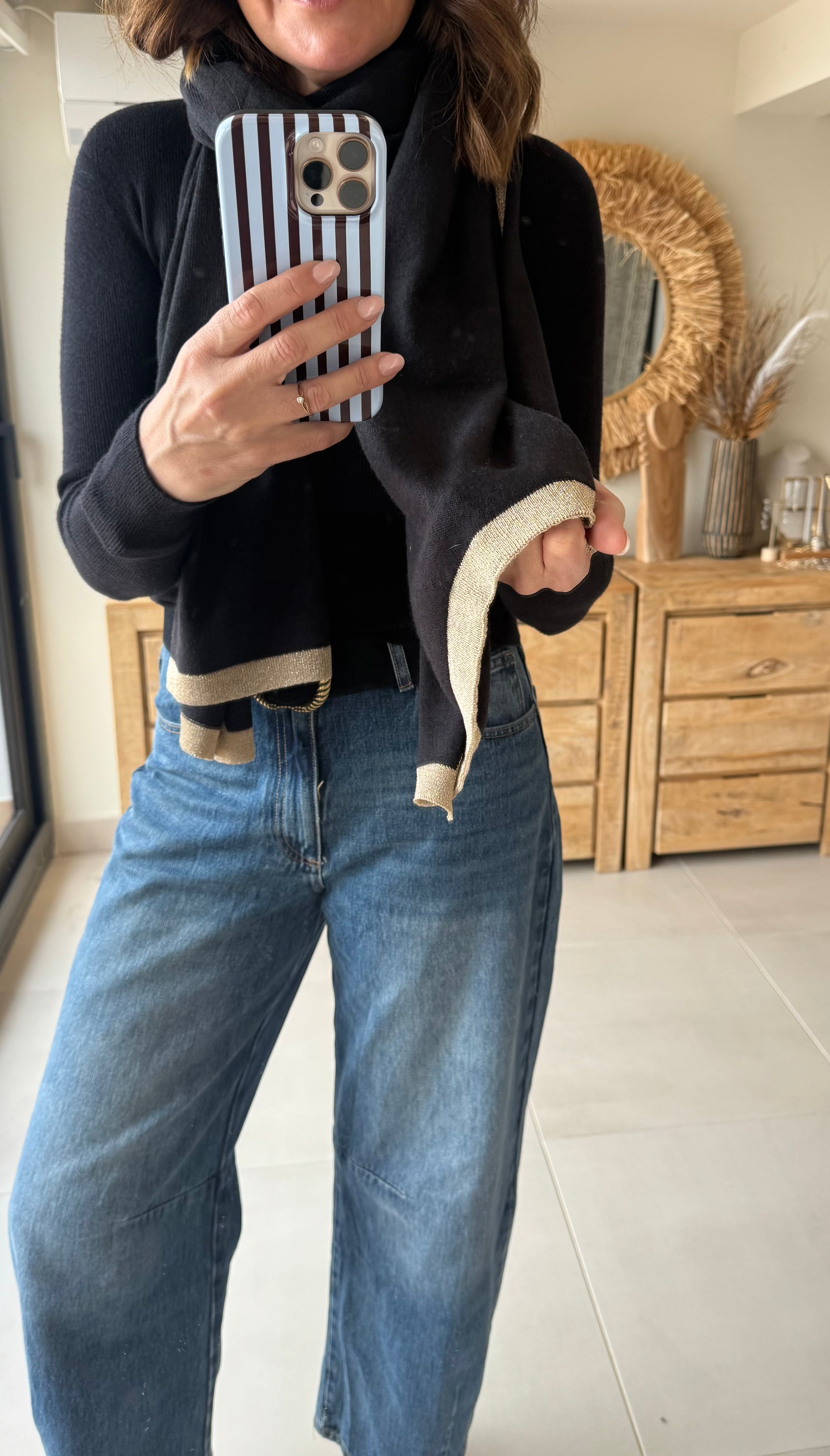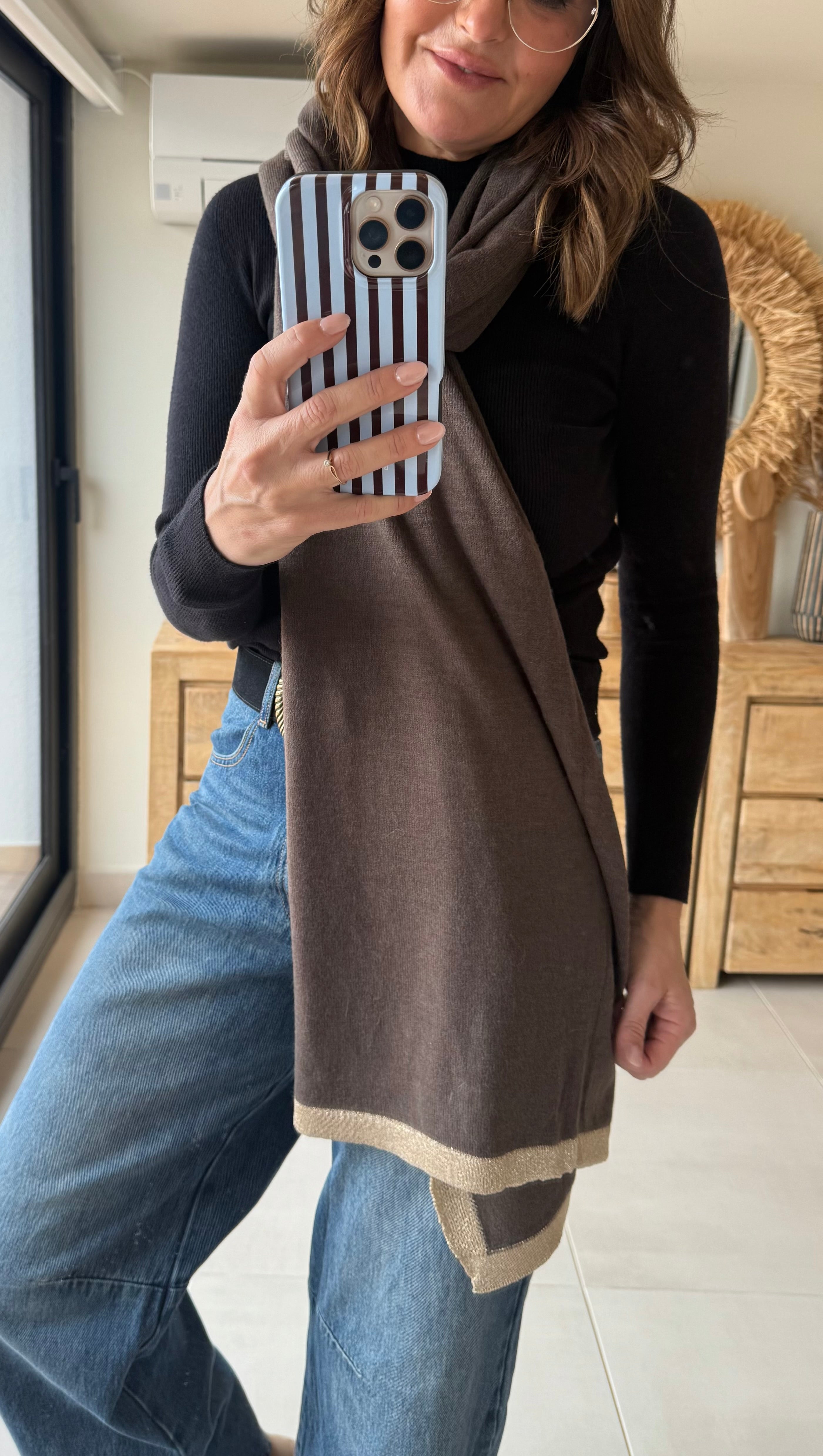 Bufanda súper suave y ligera, confeccionada en 70% viscosa y 30% lana. Tiene un tacto gustoso, no pesa nada y abriga lo justo sin agobiar. El detalle del ribete dorado le da un punto sofisticado que queda ideal tanto para looks casual como para vestir.