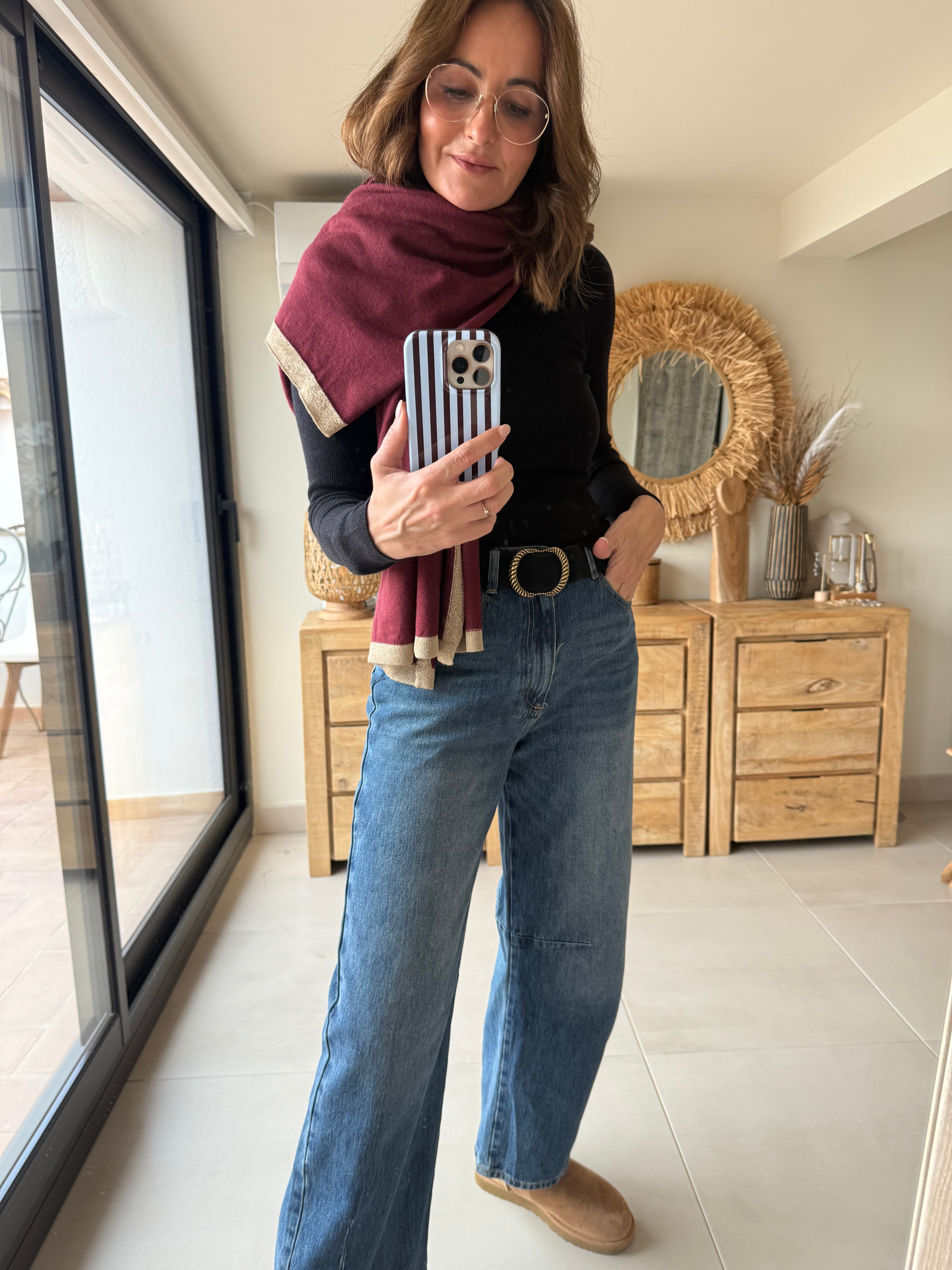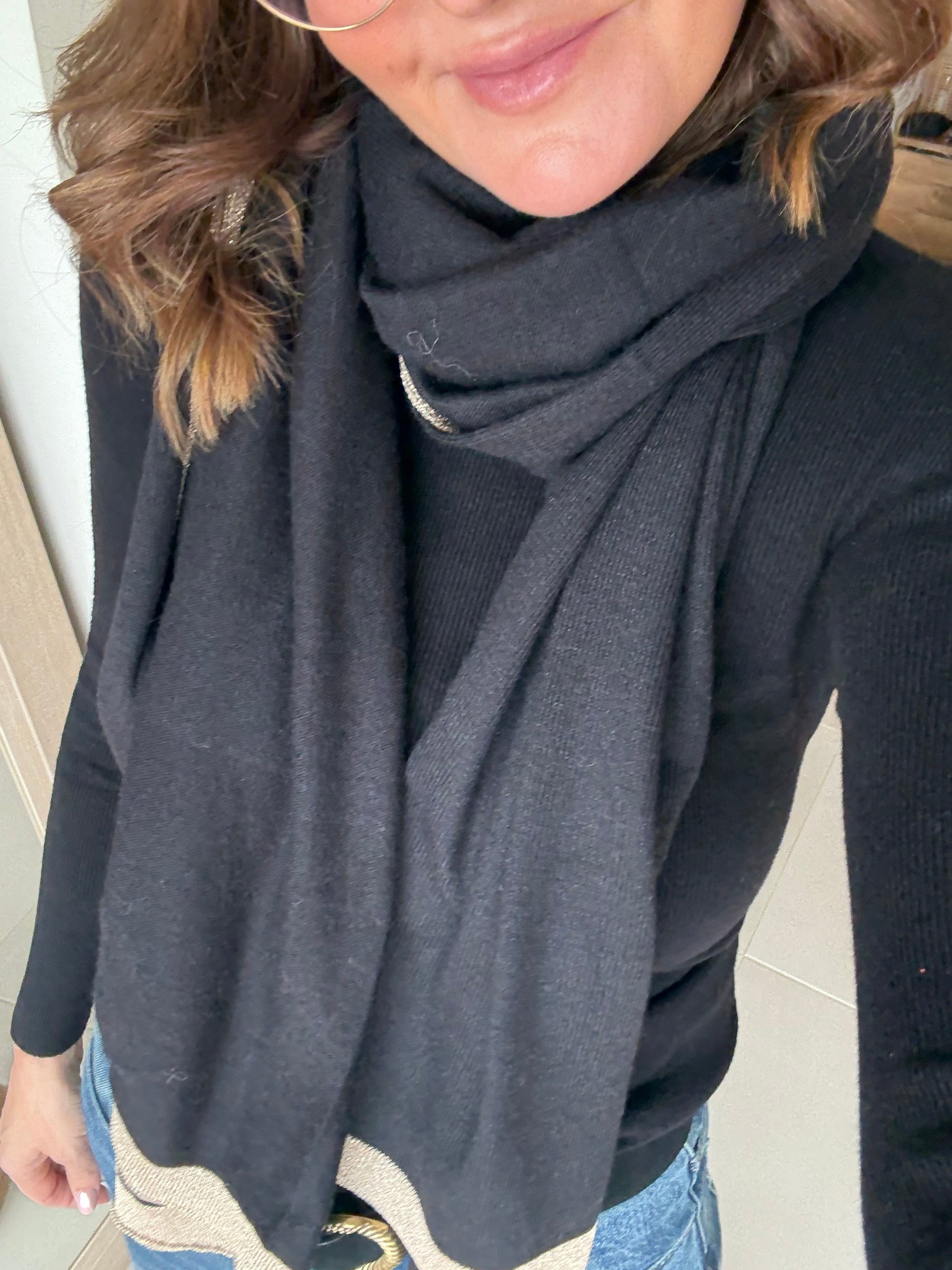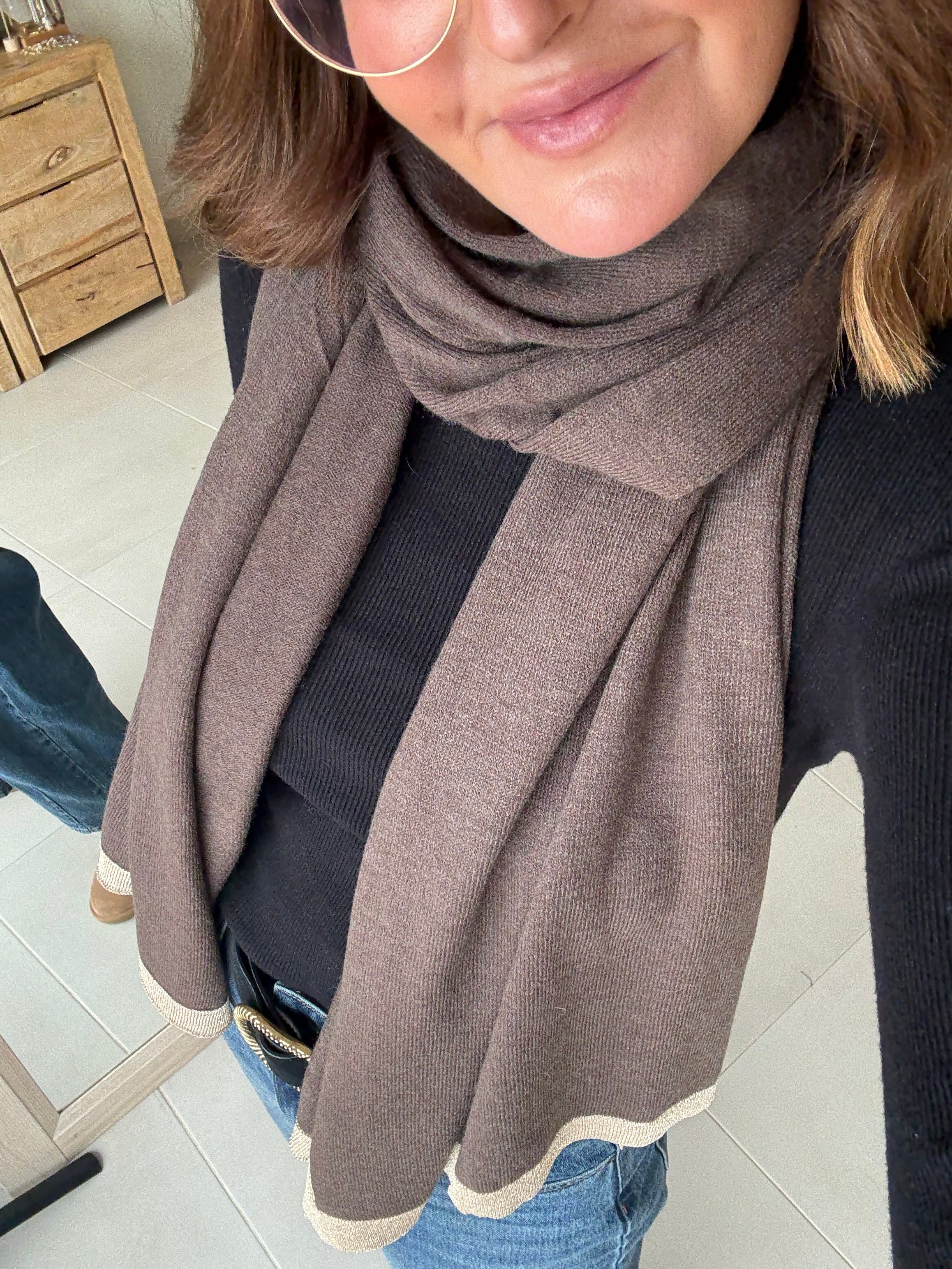 Bufanda súper suave y ligera, confeccionada en 70% viscosa y 30% lana. Tiene un tacto gustoso, no pesa nada y abriga lo justo sin agobiar. El detalle del ribete dorado le da un punto sofisticado que queda ideal tanto para looks casual como para vestir.