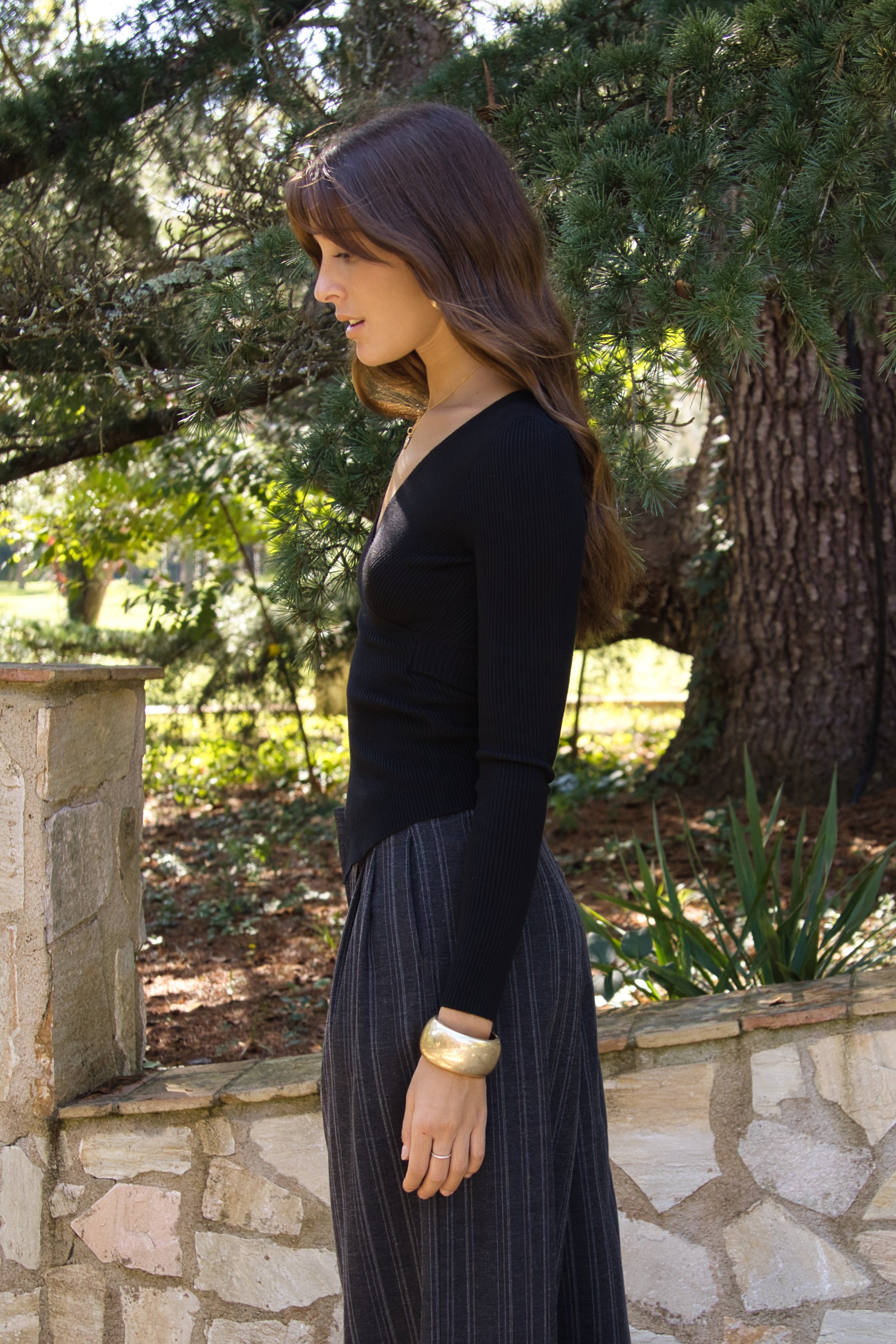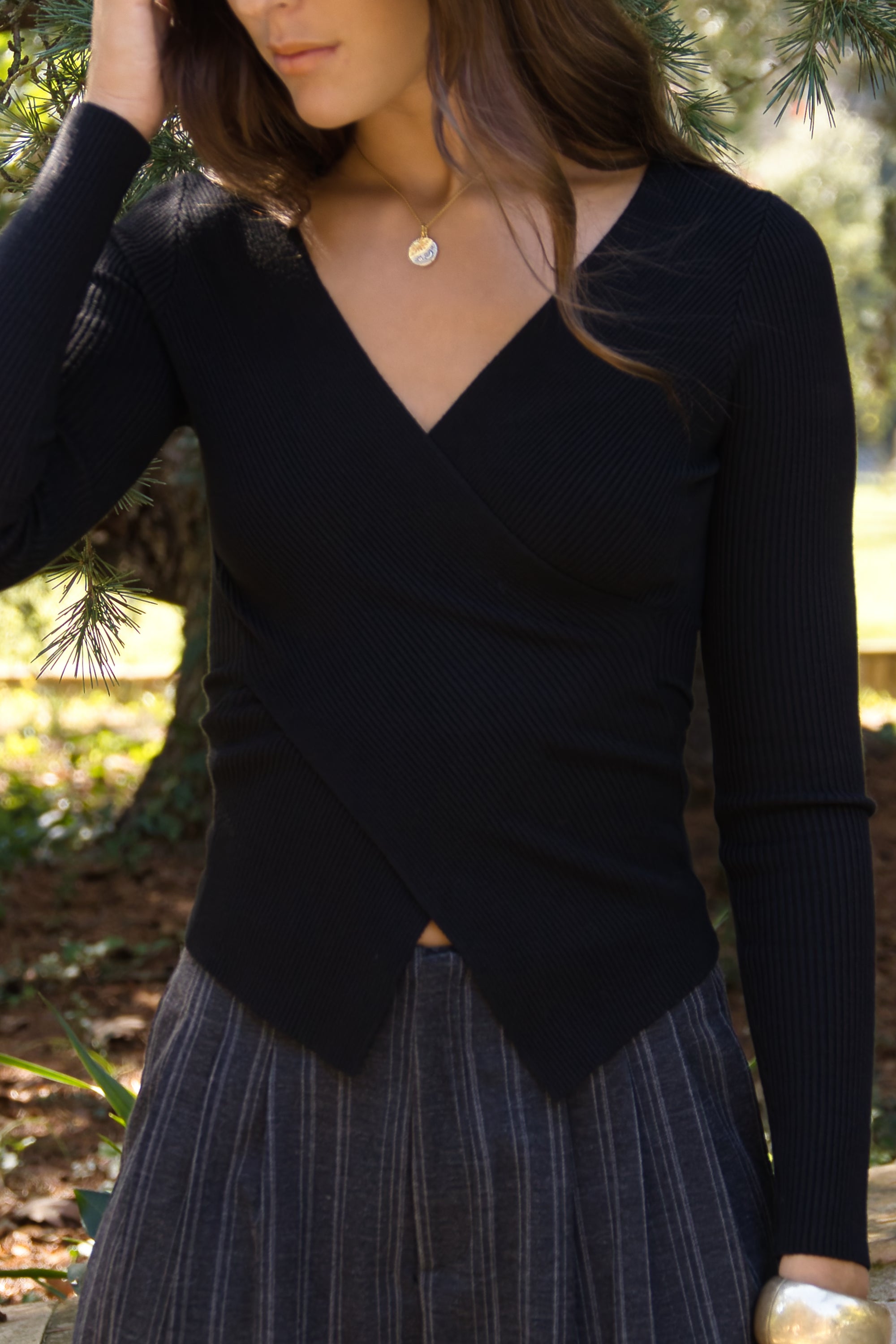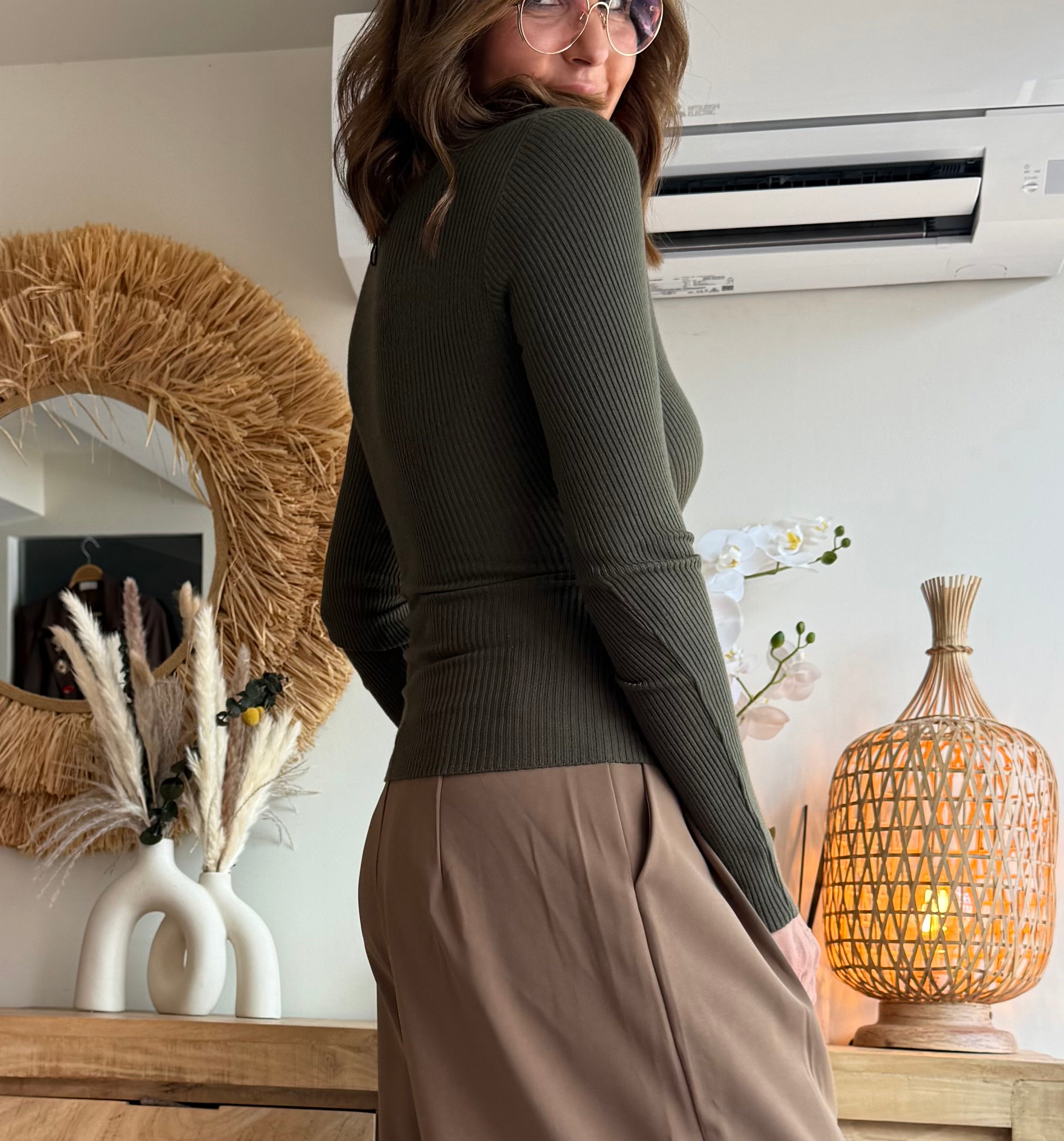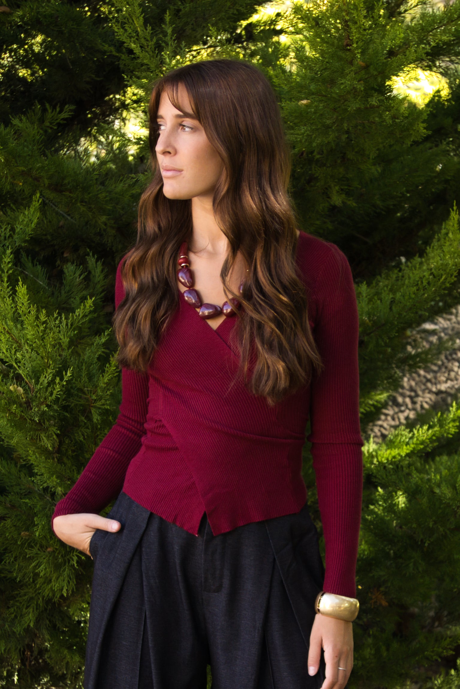 Un básico con estilo. Este jersey cruzado realza la figura con su corte entallado y escote en pico, perfecto para combinar con pantalones de tiro alto o faldas. Su diseño cruzado crea un efecto visual muy favorecedor que estiliza la cintura y aporta un toque sofisticado y femenino.