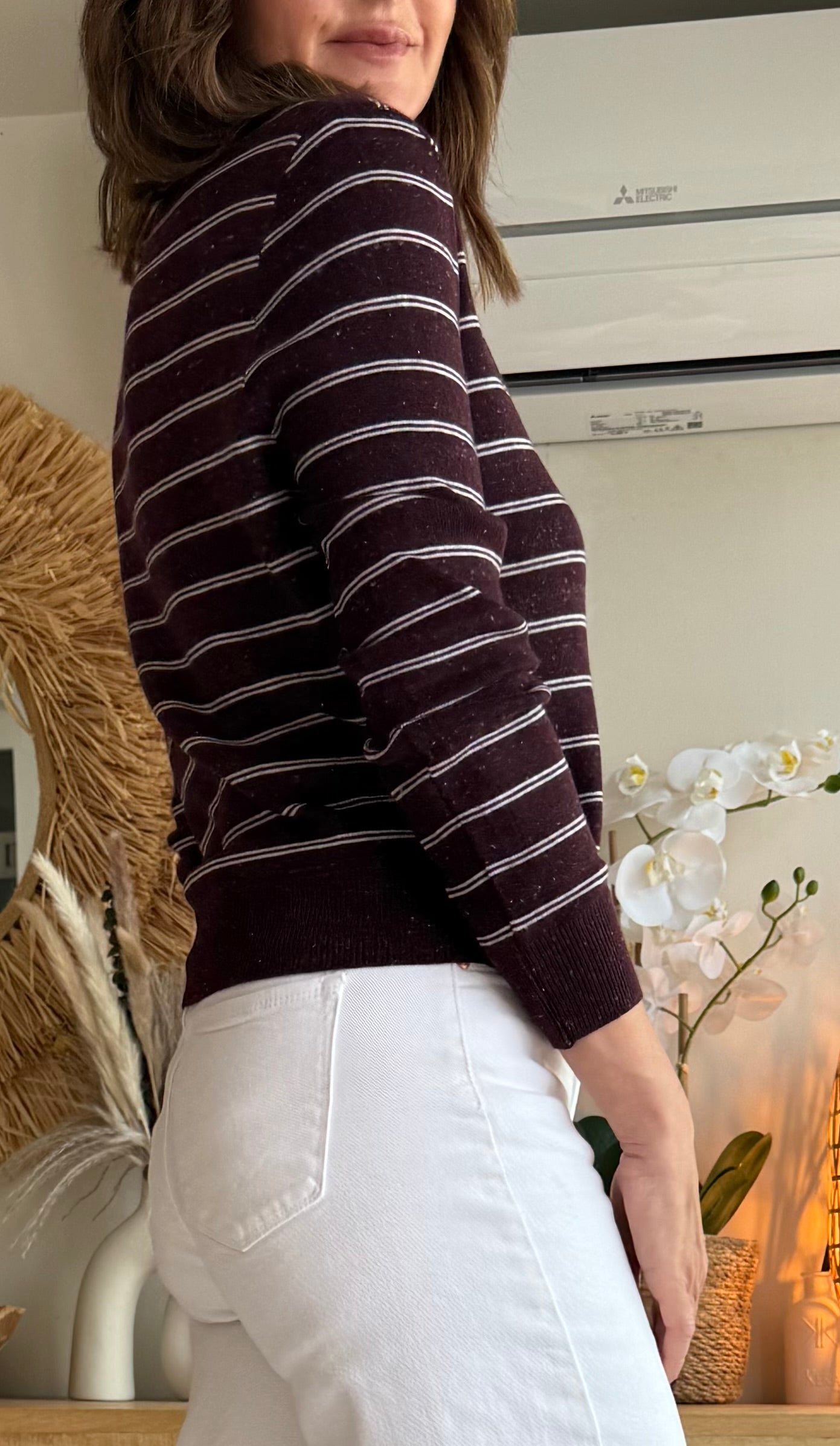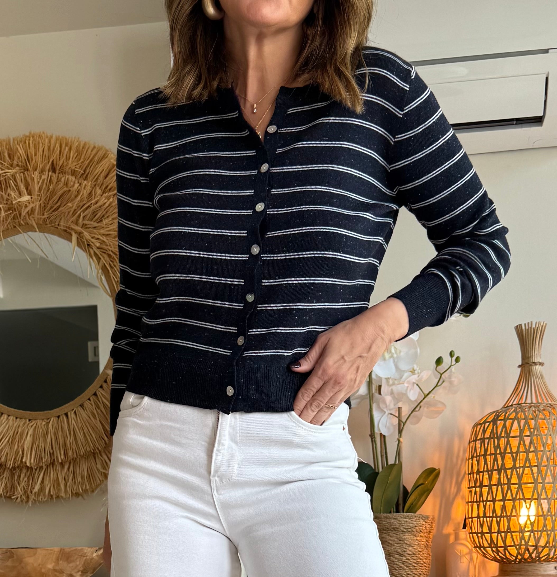 Cárdigan de punto fino con botones delanteros y estampado de rayas horizontales. Su tacto suave y ligero lo hace perfecto para entretiempo. El diseño entallado favorece la figura sin ajustar demasiado, y se puede llevar cerrado o abierto sobre una camiseta o blusa.