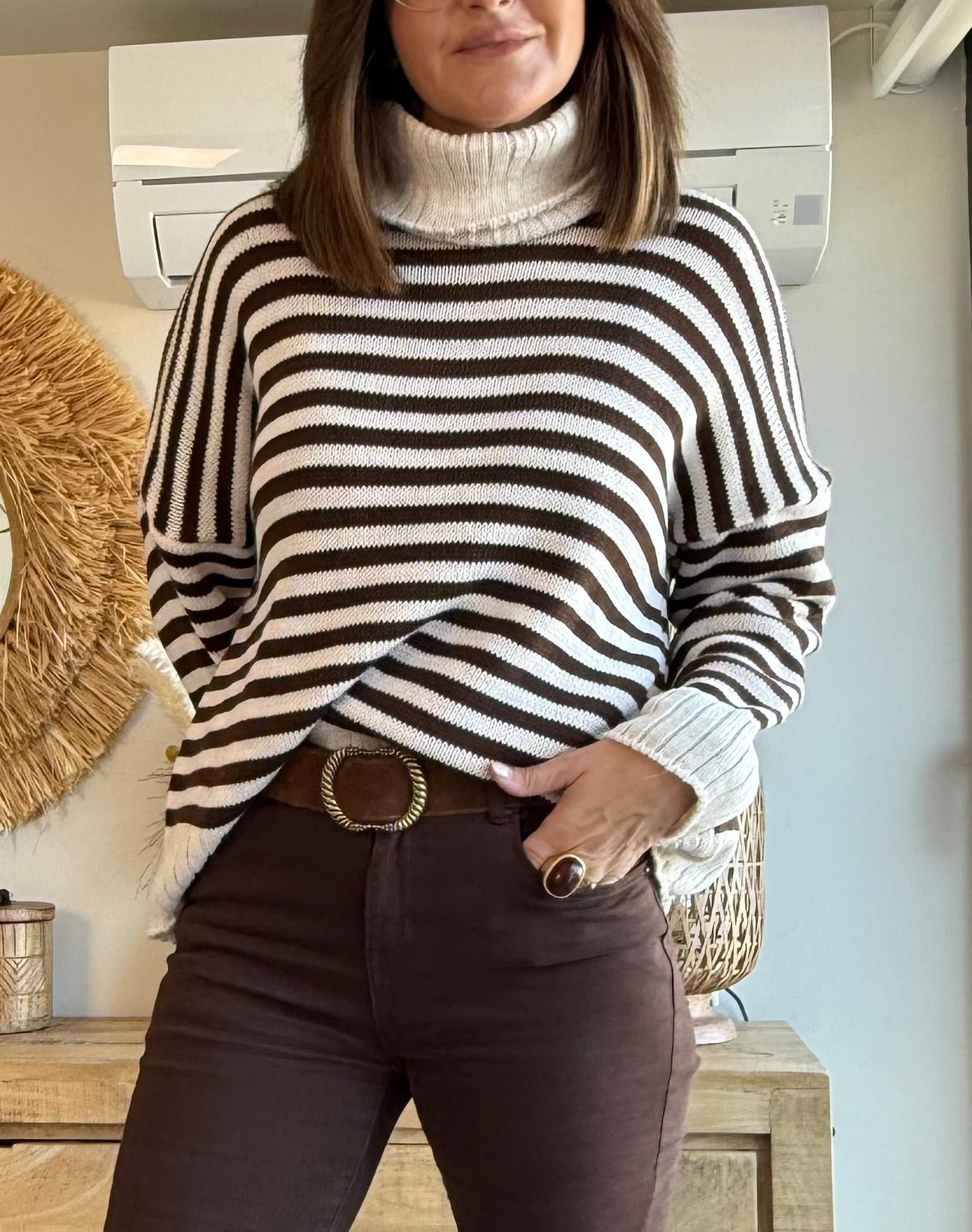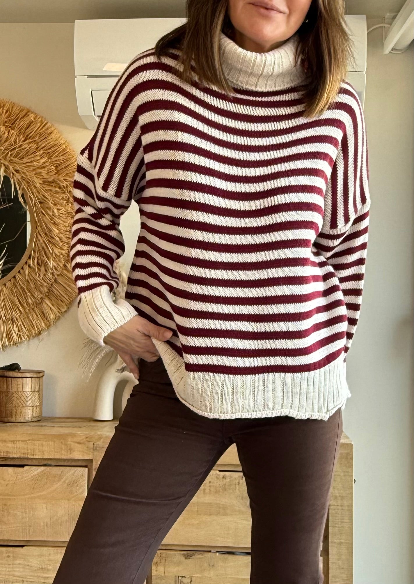 Jersey de rayas con cuello alto suave, corte relajado y tejido gustoso. Muy cómodo, calentito y favorecedor.