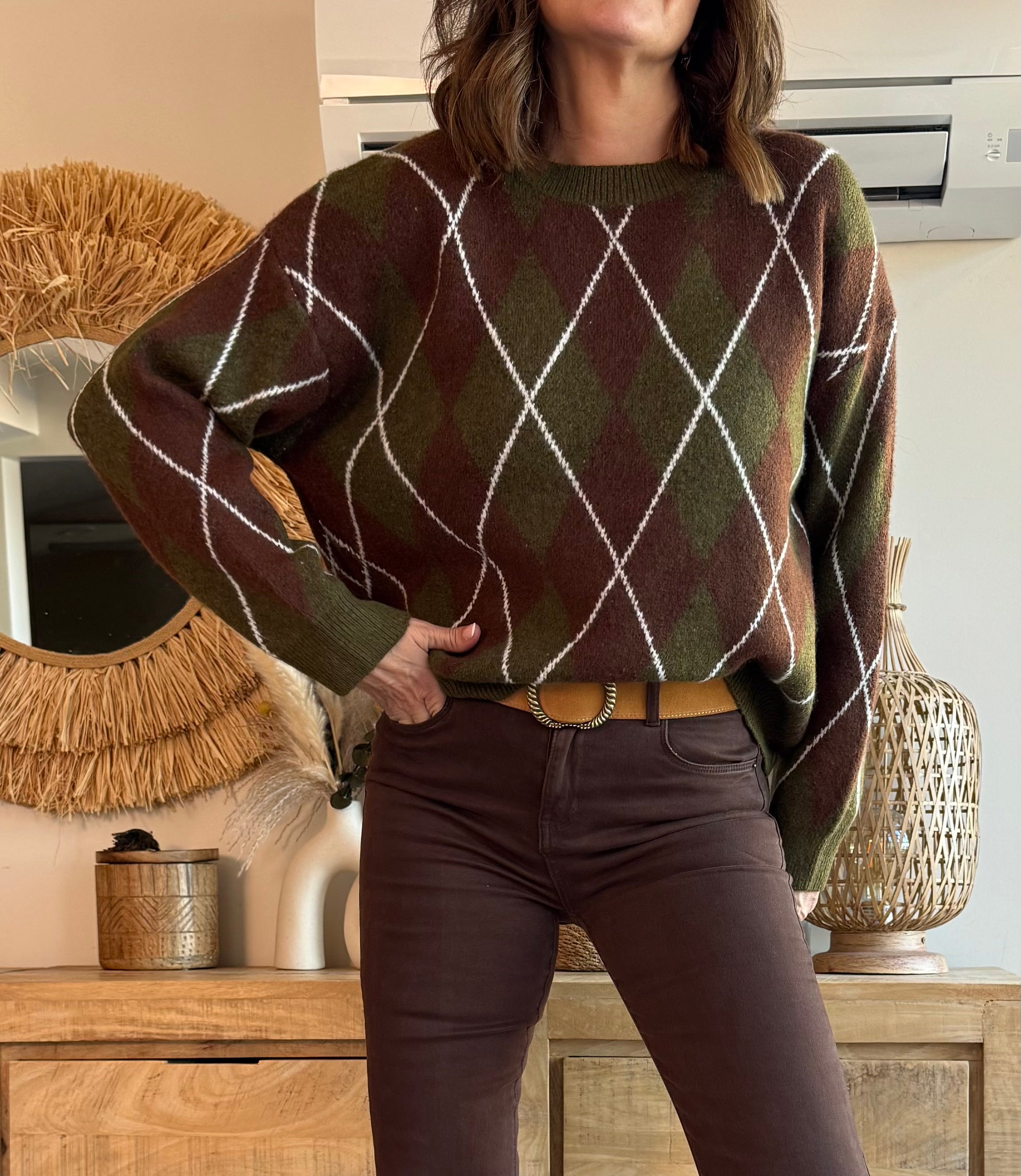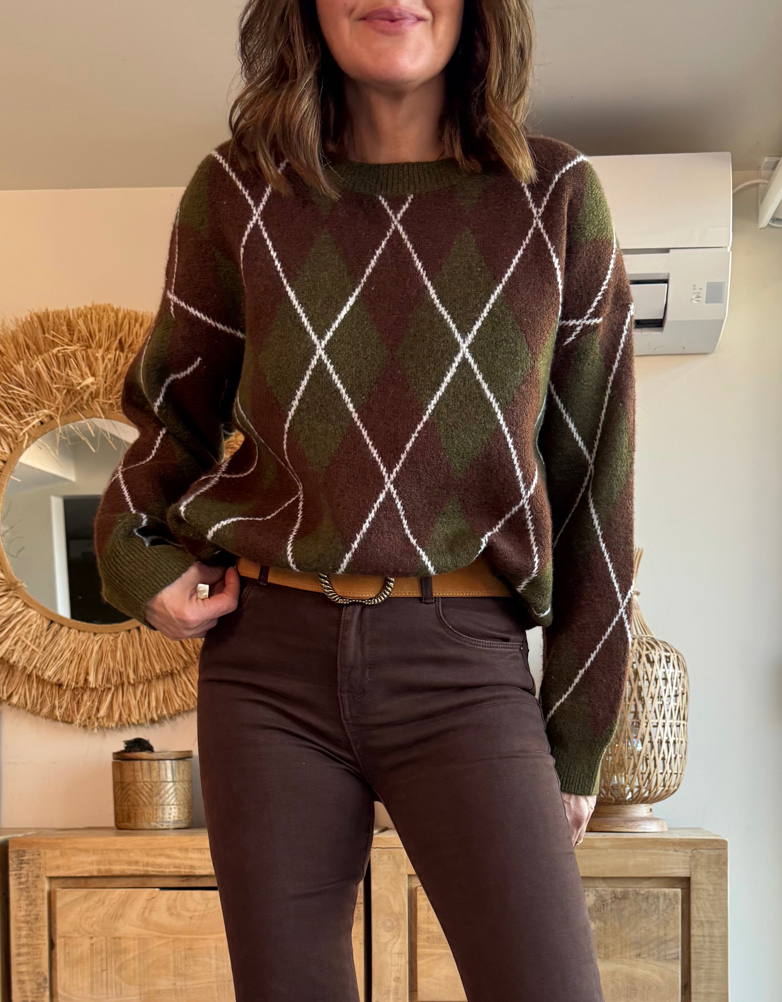 Jersey de punto suave con dibujo argyle clásico, disponible en dos combinaciones preciosas: tonos marrones con verde y tonos beige con marrón. Es de esos jerséis que quedan súper favorecedores, muy calentitos y con un tacto agradable.