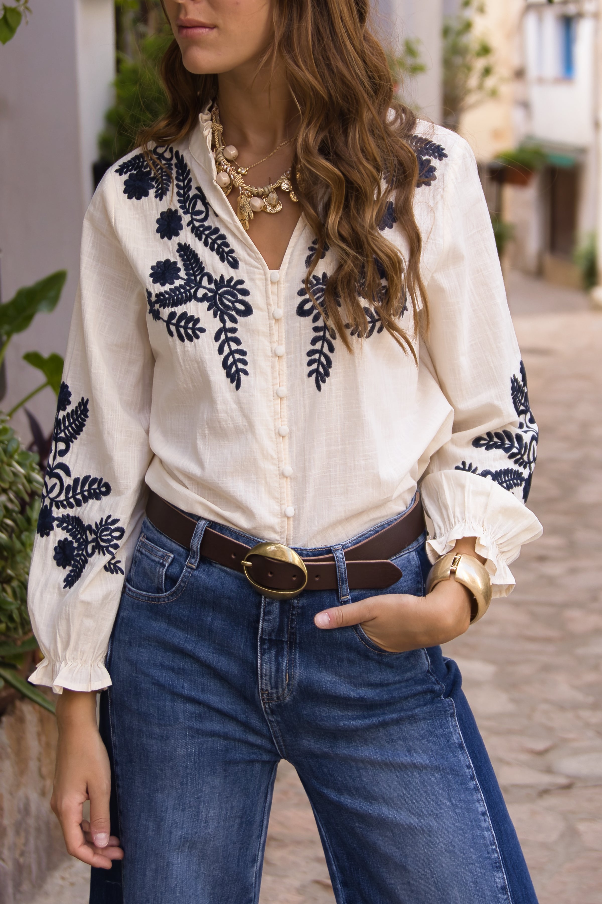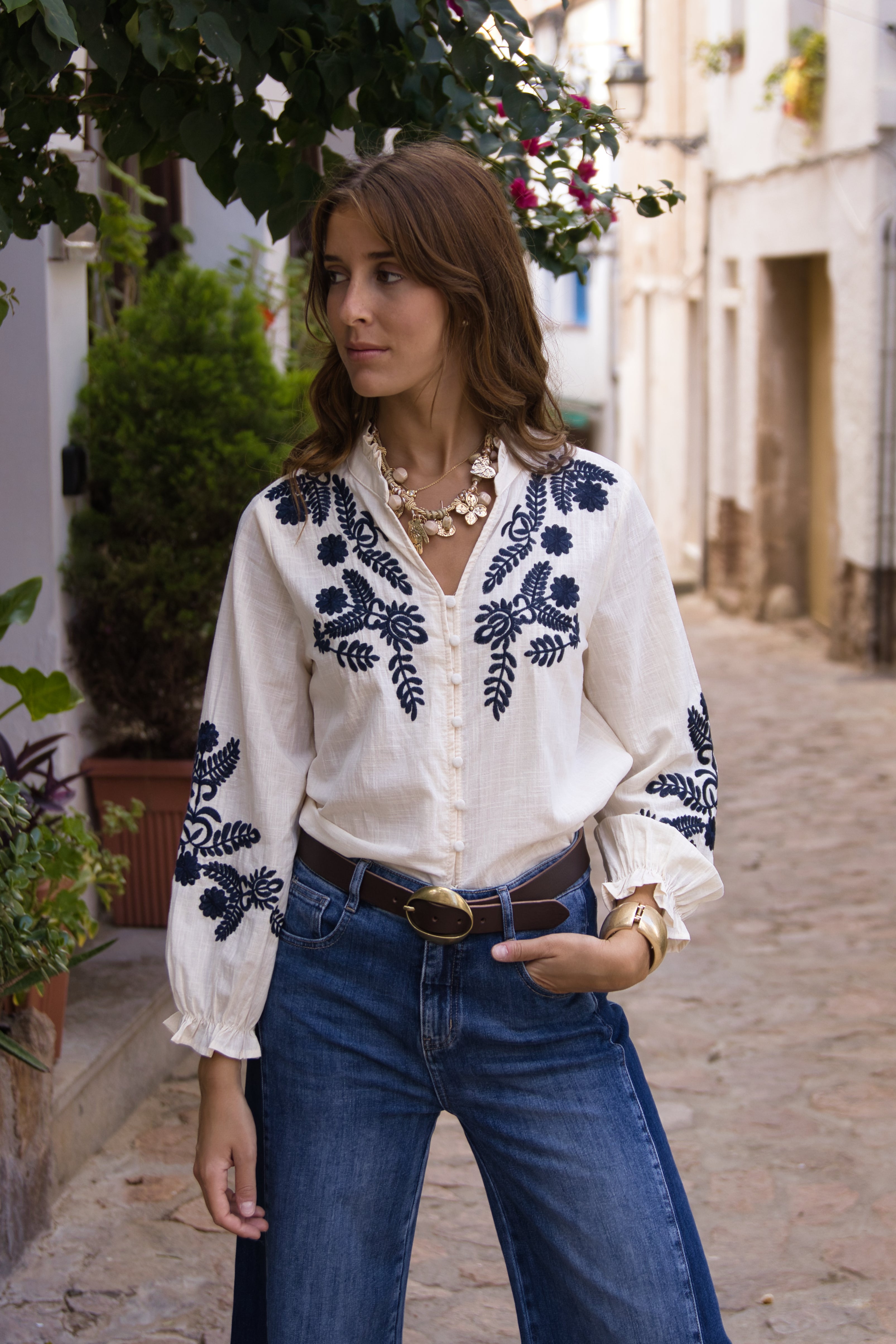 Blusa de algodón con bordados florales en contraste, un diseño que combina el estilo boho con un toque elegante y artesanal.
