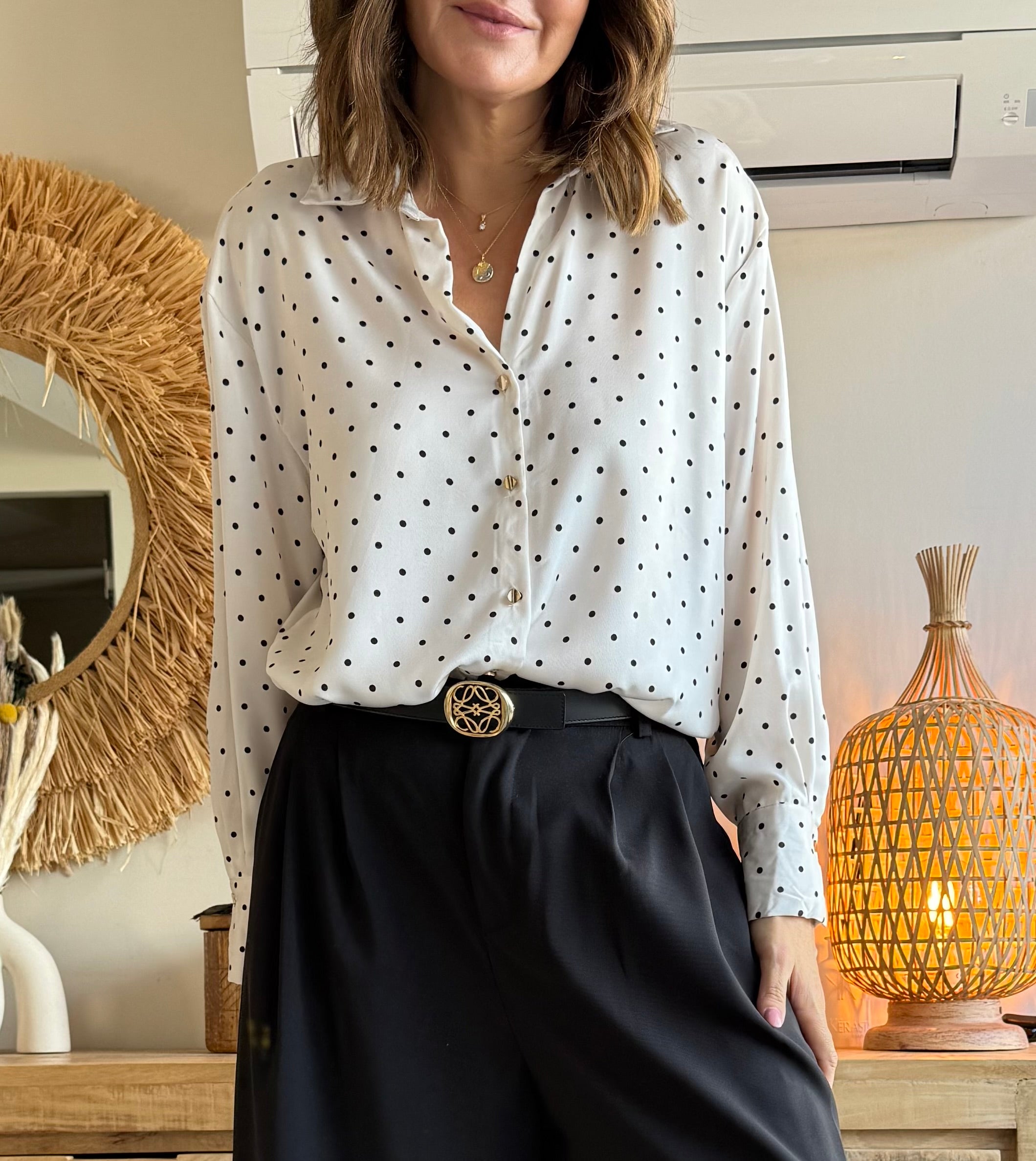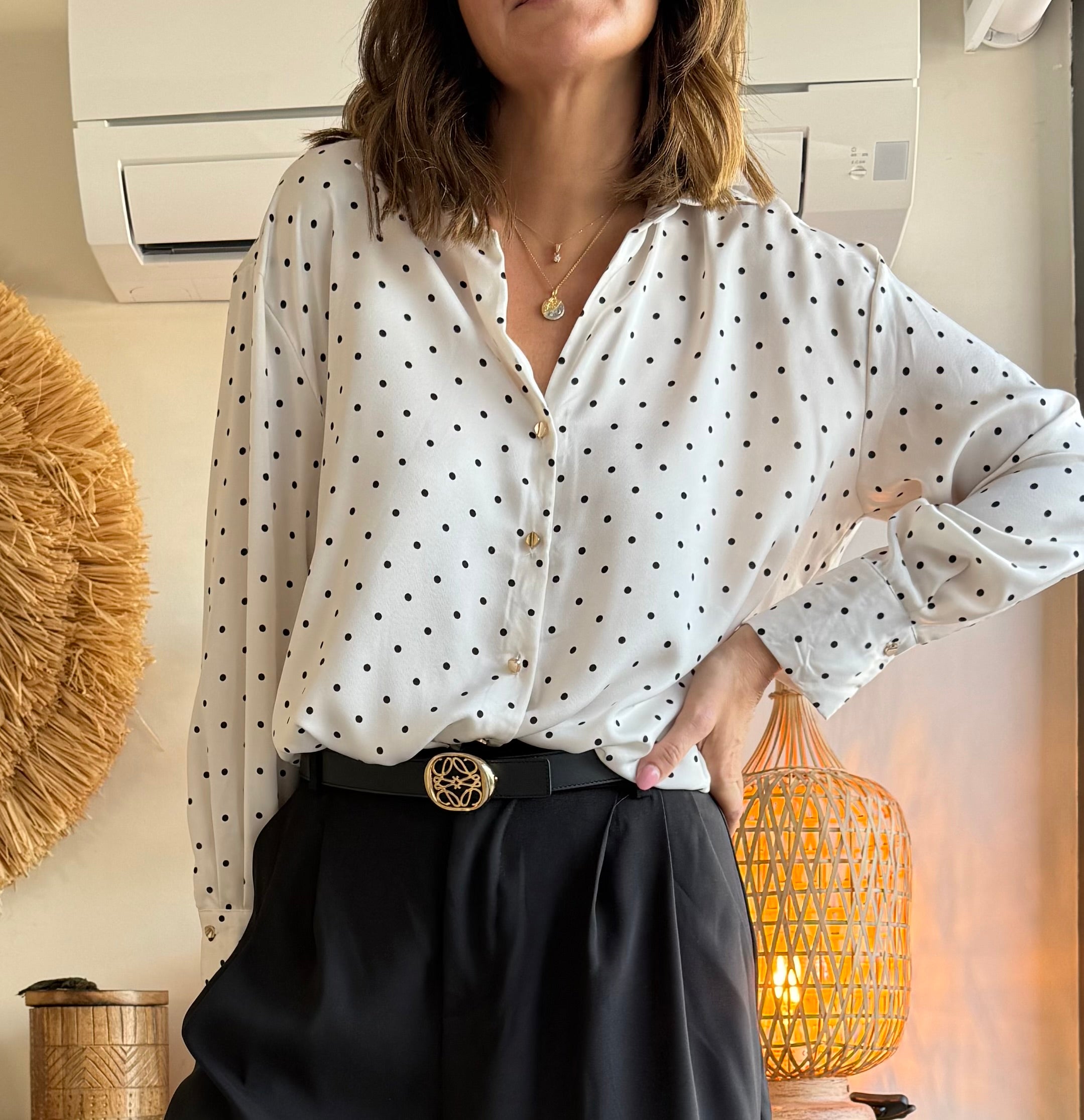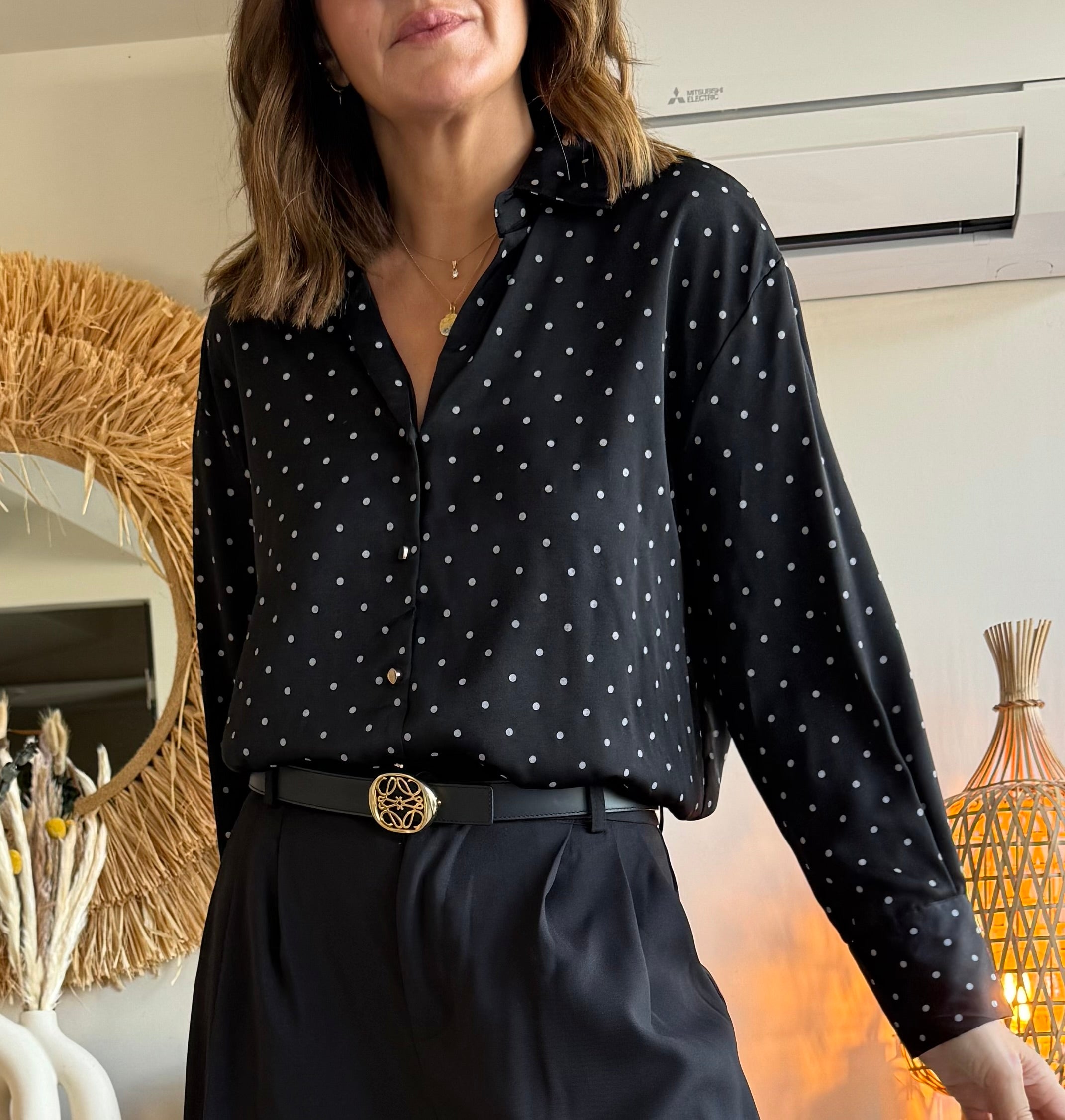 Blusa fluida con estampado de lunares, confeccionada en un tejido de caída espectacular, muy suave y gustoso al tacto (65% poliéster, 35% rayón). Su diseño clásico con cuello camisero y botones frontales aporta un aire elegante y versátil, ideal para combinar tanto en looks de oficina como en outfits más casuales. Disponible en blanco con lunares negros y en negro con lunares blancos.