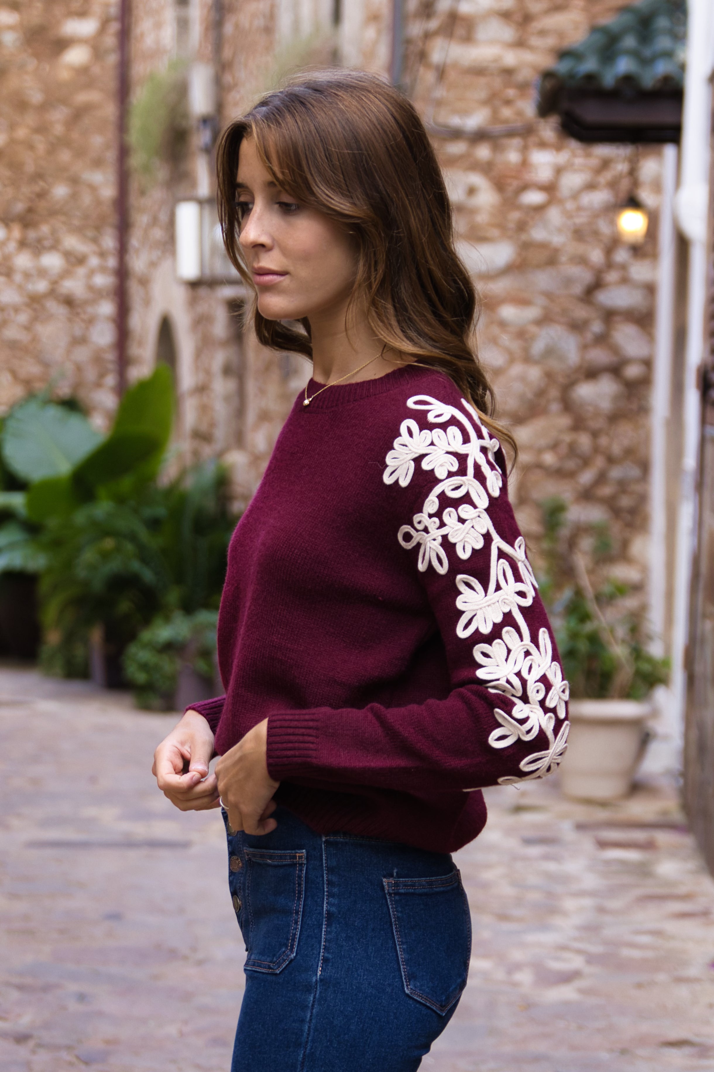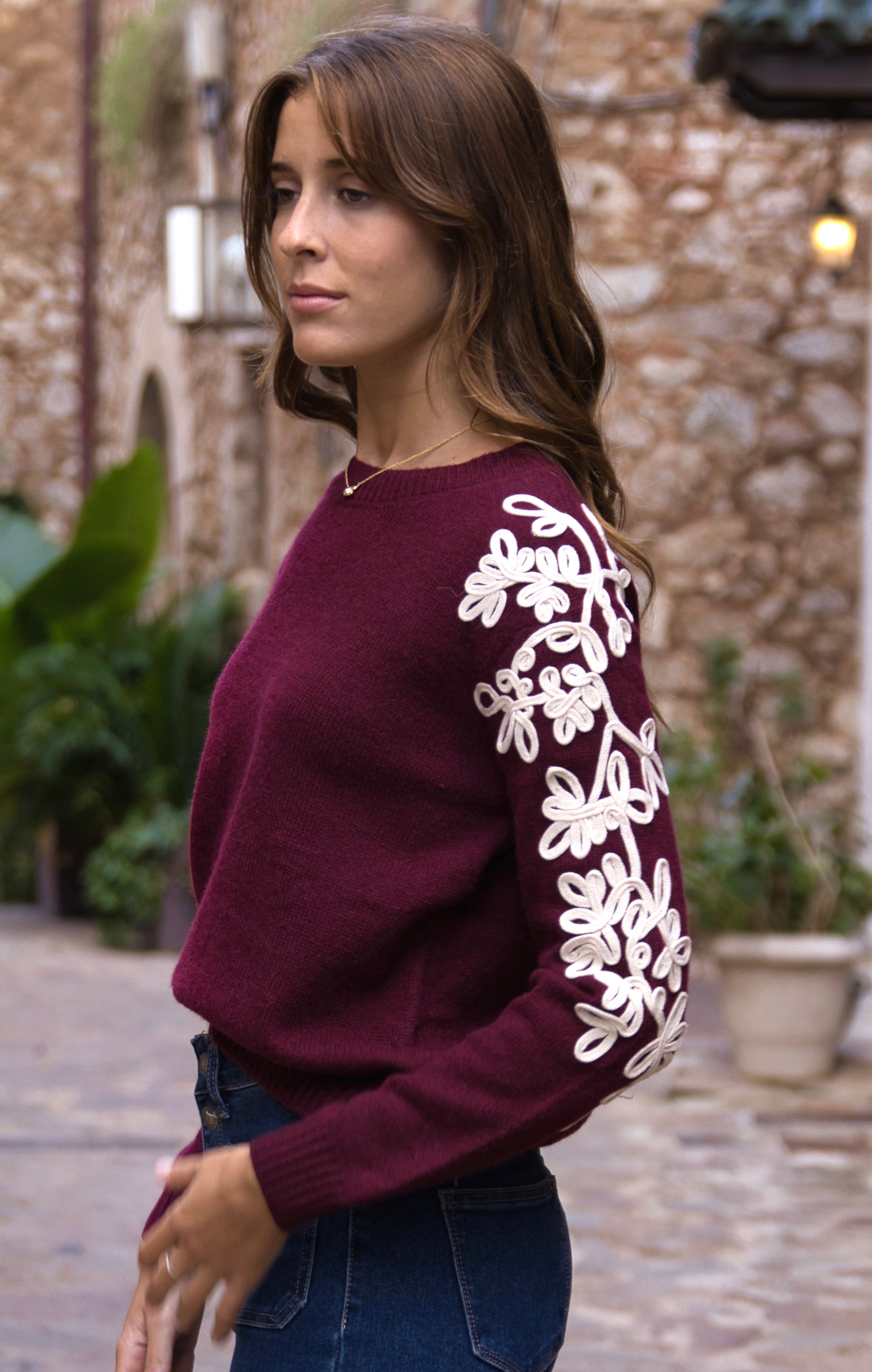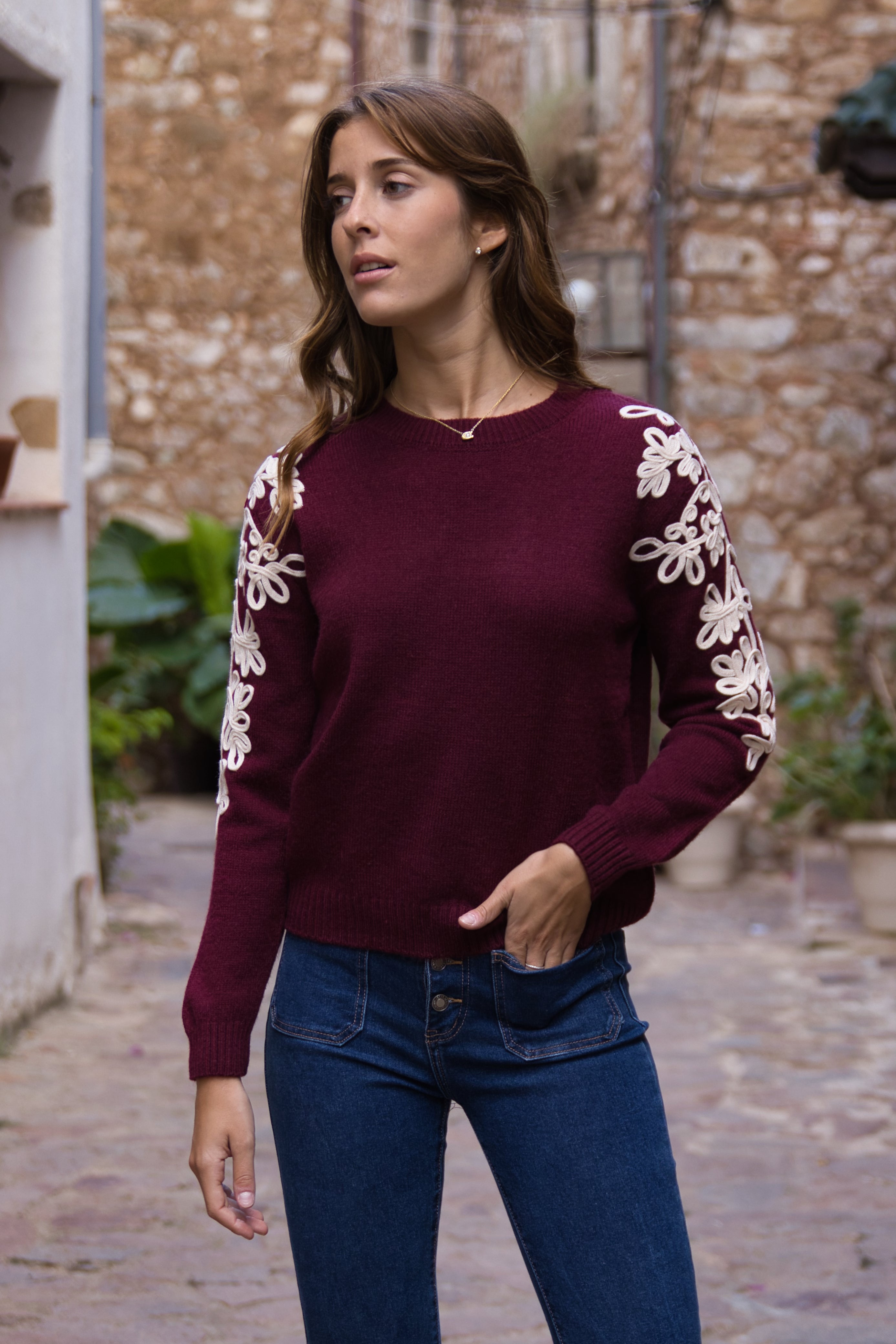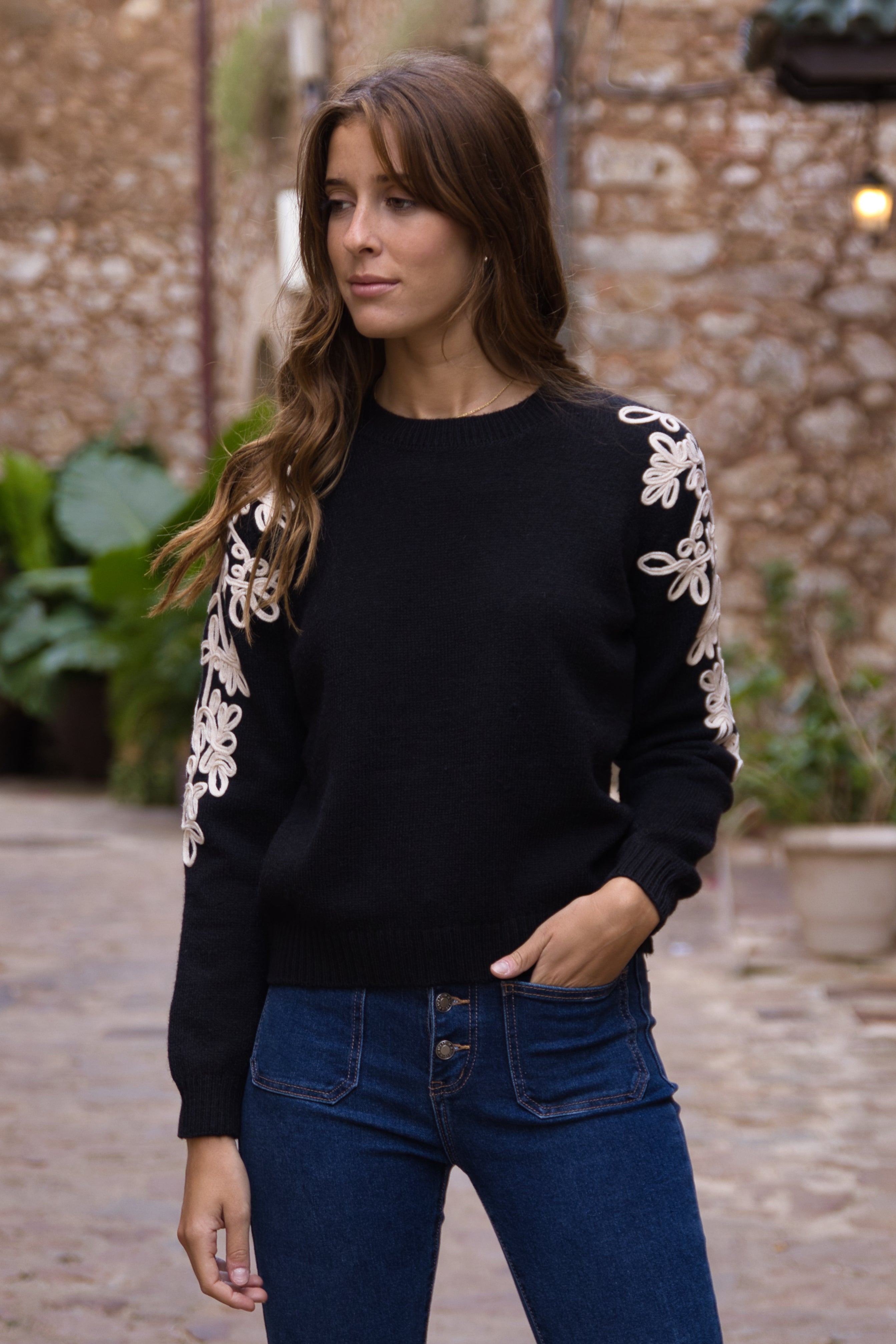 ersey de punto suave con detalle de flores bordadas en relieve a lo largo de las mangas, que aportan un toque femenino y especial. Su diseño de cuello redondo y corte recto lo convierte en una prenda cómoda y elegante, ideal para dar estilo a tus looks de diario.