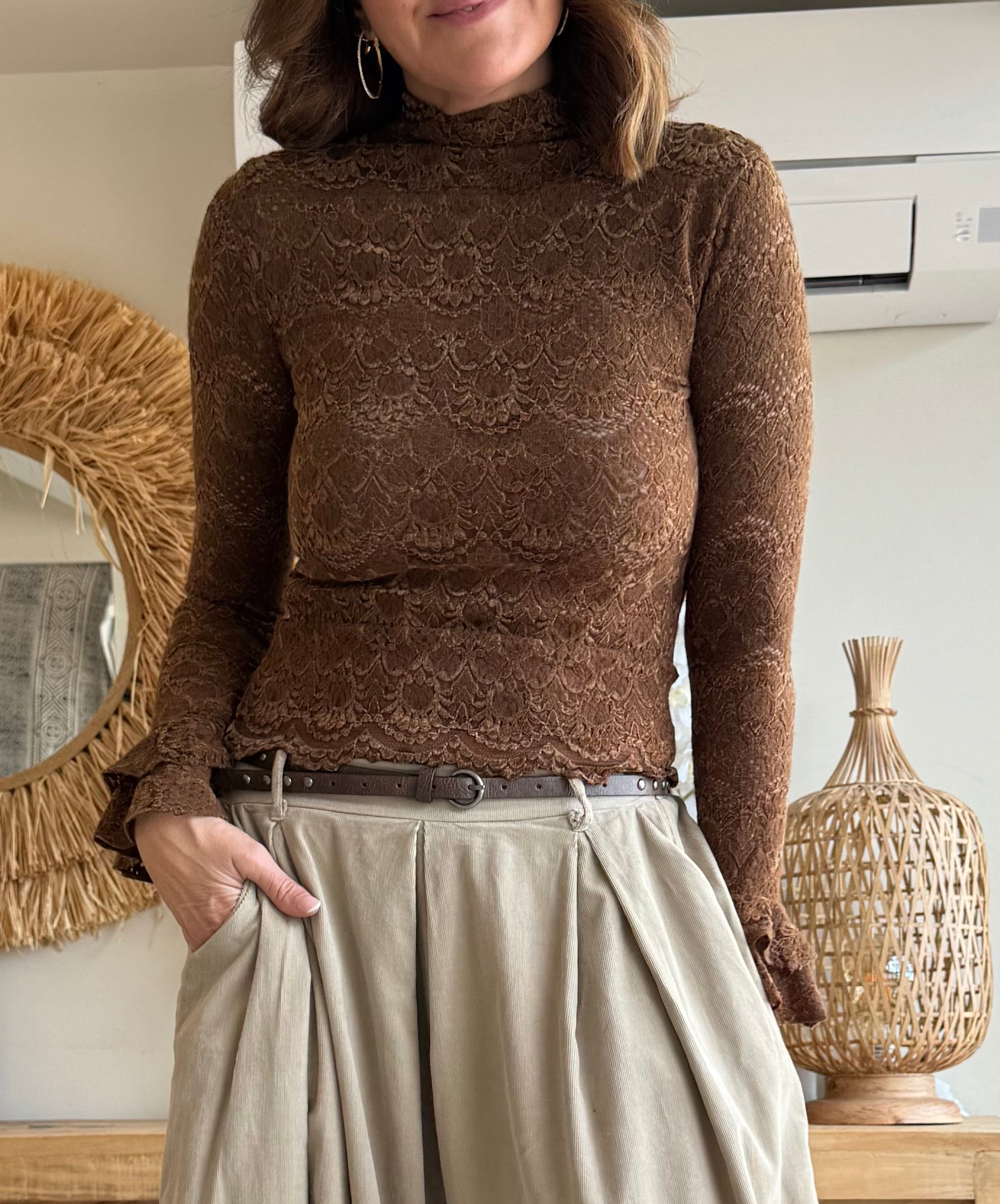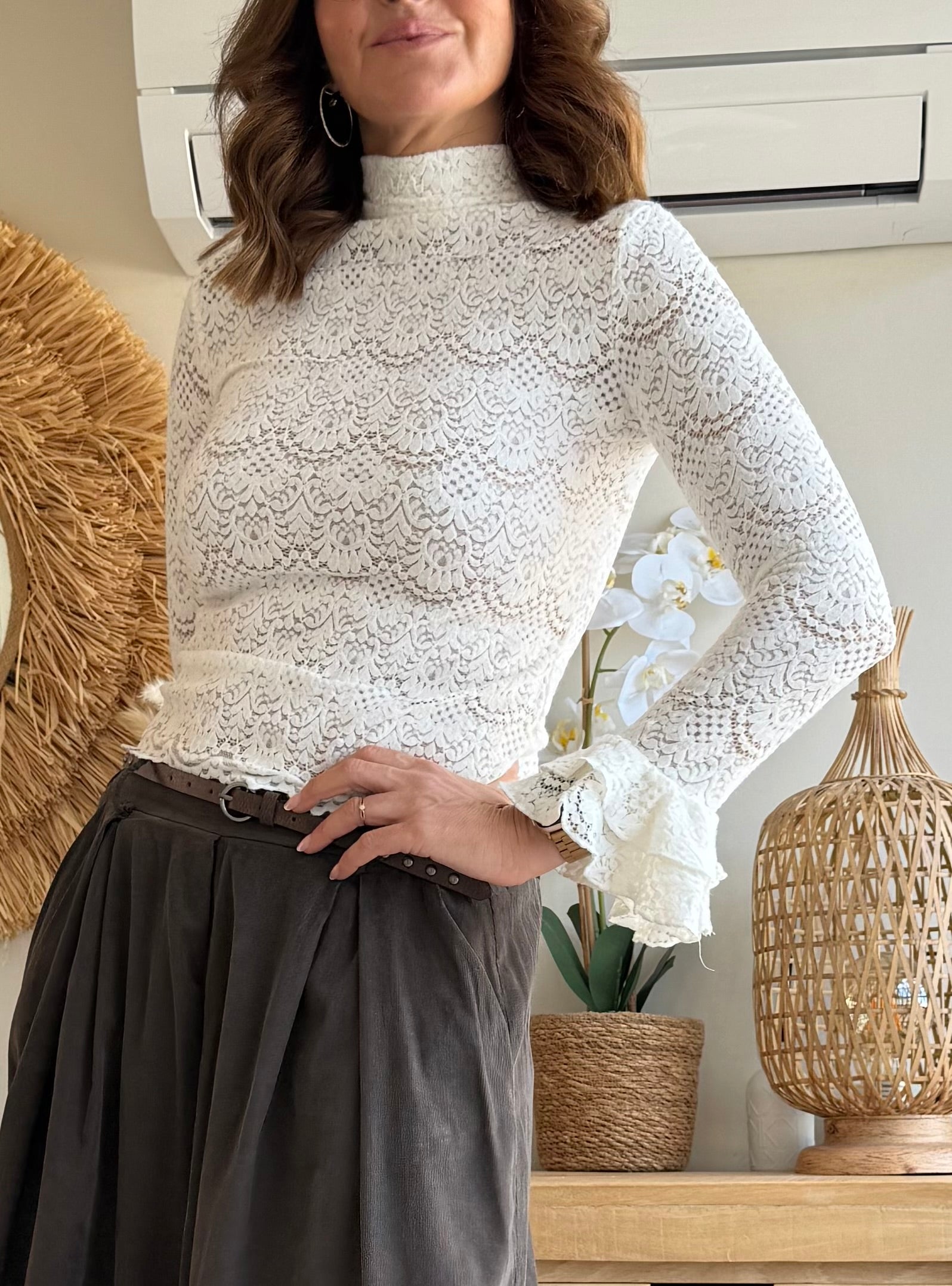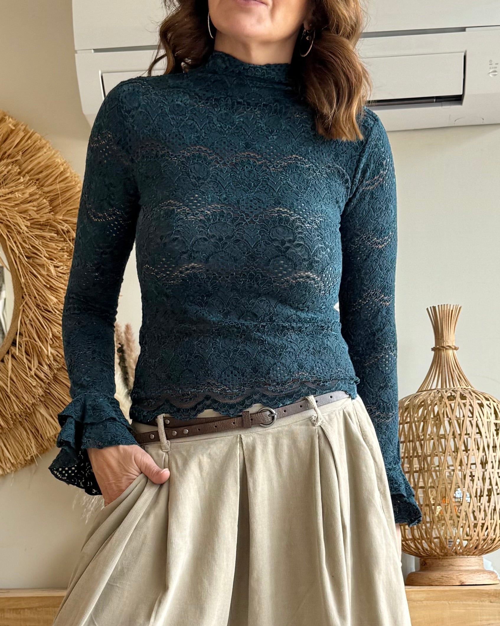 La textura de encaje es preciosa, femenina y muy favorecedora, con cuello alto suave y remates ondulados en puños y bajo que le dan un toque súper delicado. Es talla única, y gracias a su elasticidad real se ajusta perfectamente desde la talla 36 hasta la 42.