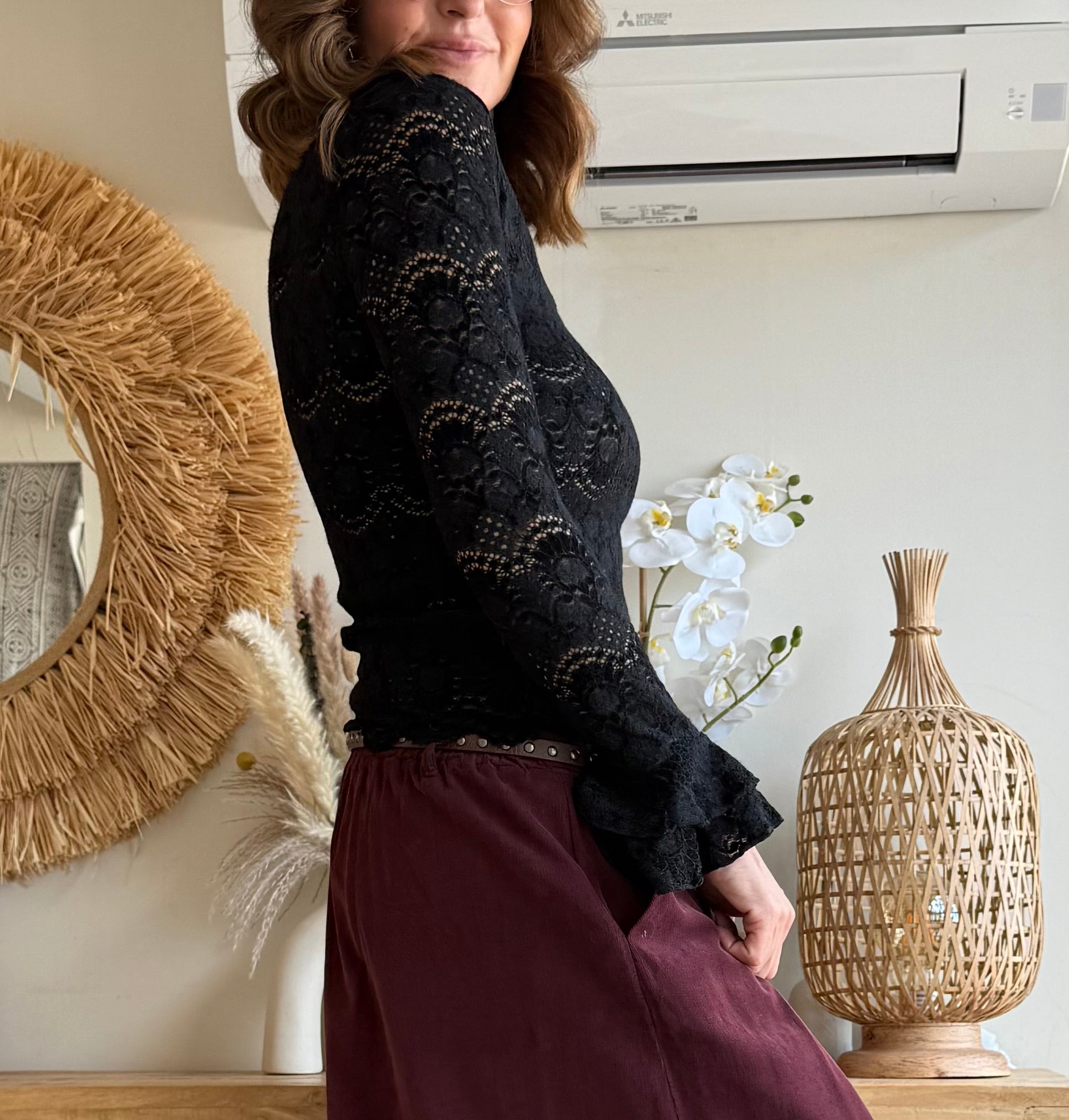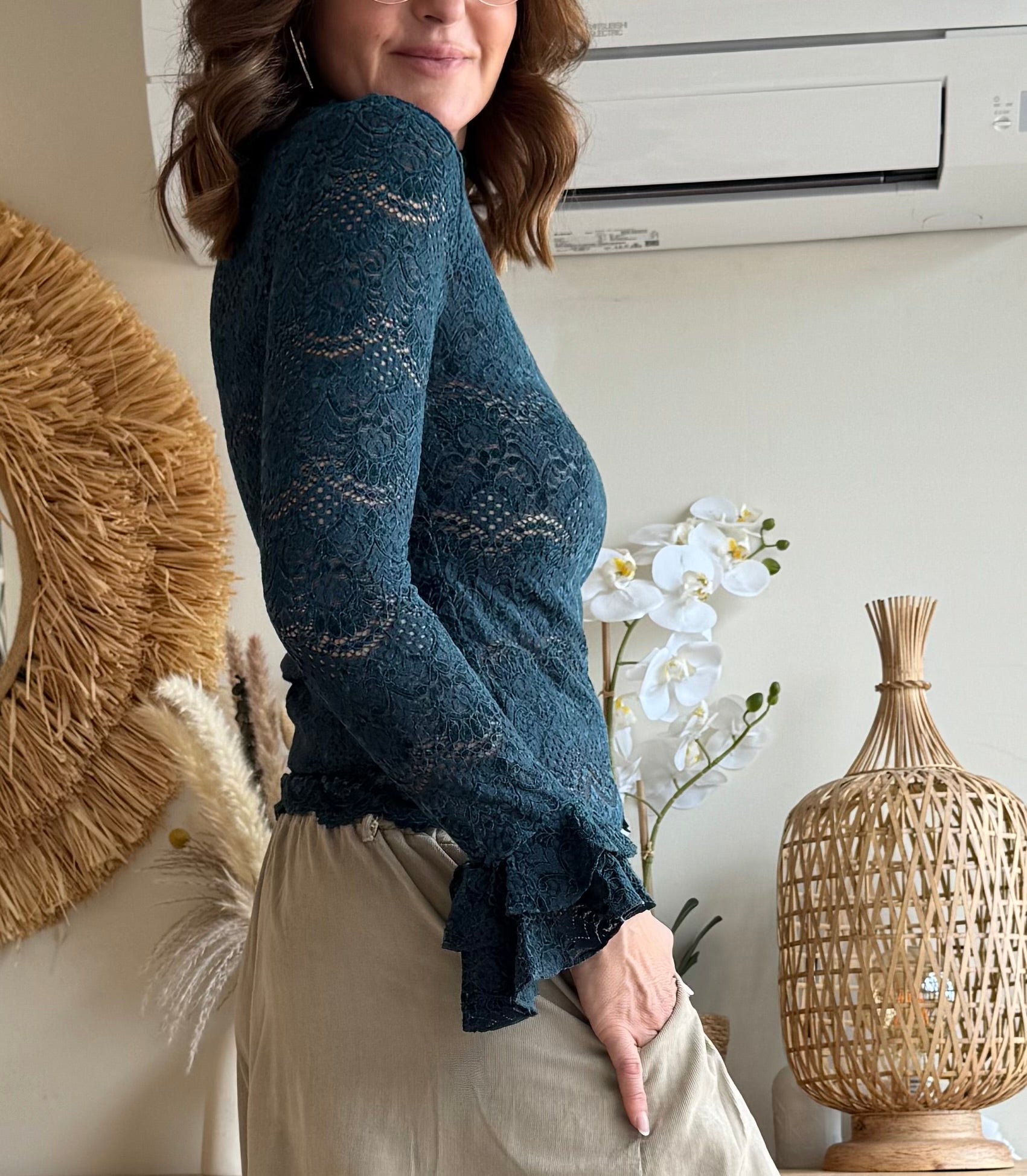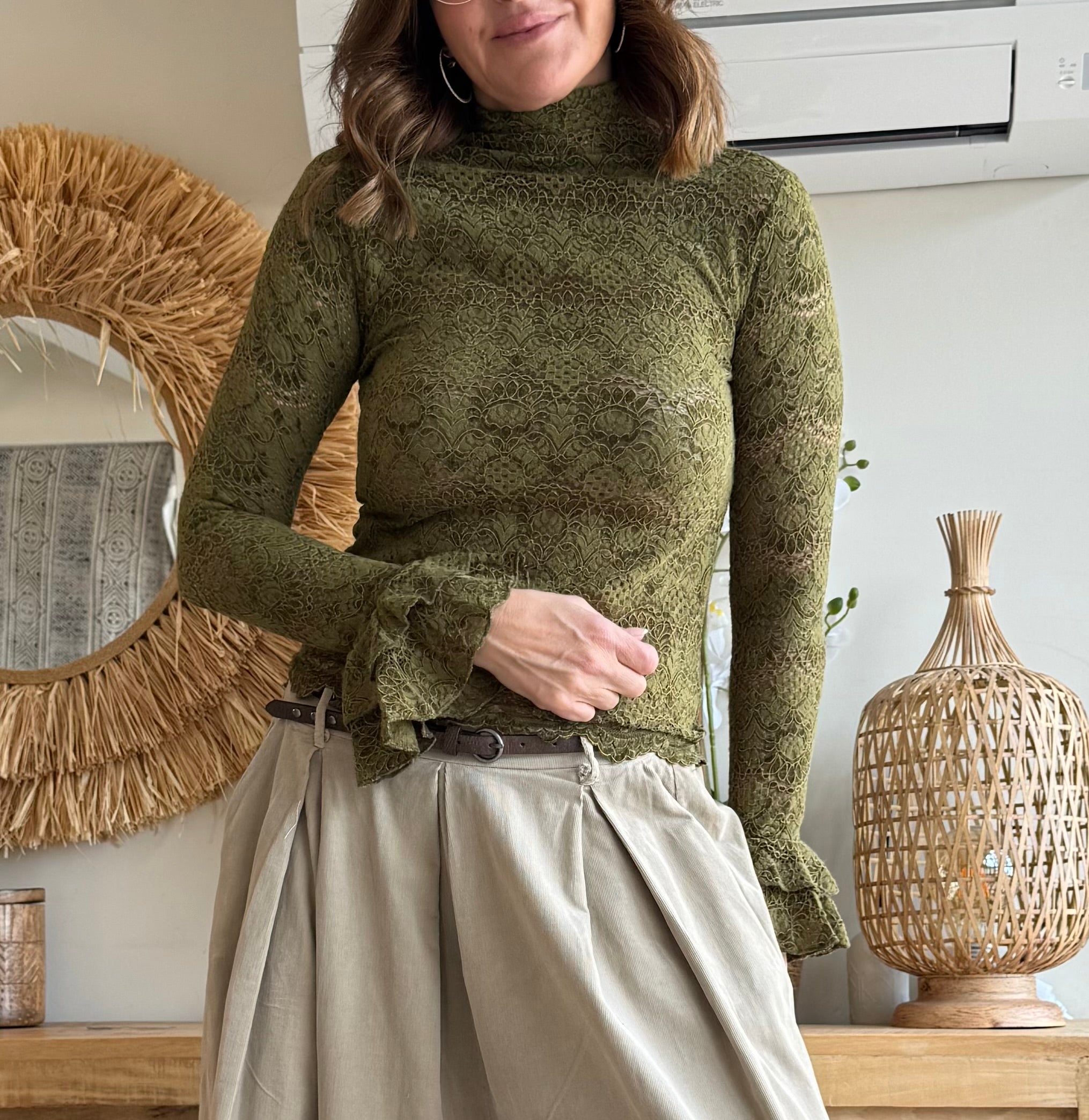 La textura de encaje es preciosa, femenina y muy favorecedora, con cuello alto suave y remates ondulados en puños y bajo que le dan un toque súper delicado. Es talla única, y gracias a su elasticidad real se ajusta perfectamente desde la talla 36 hasta la 42.