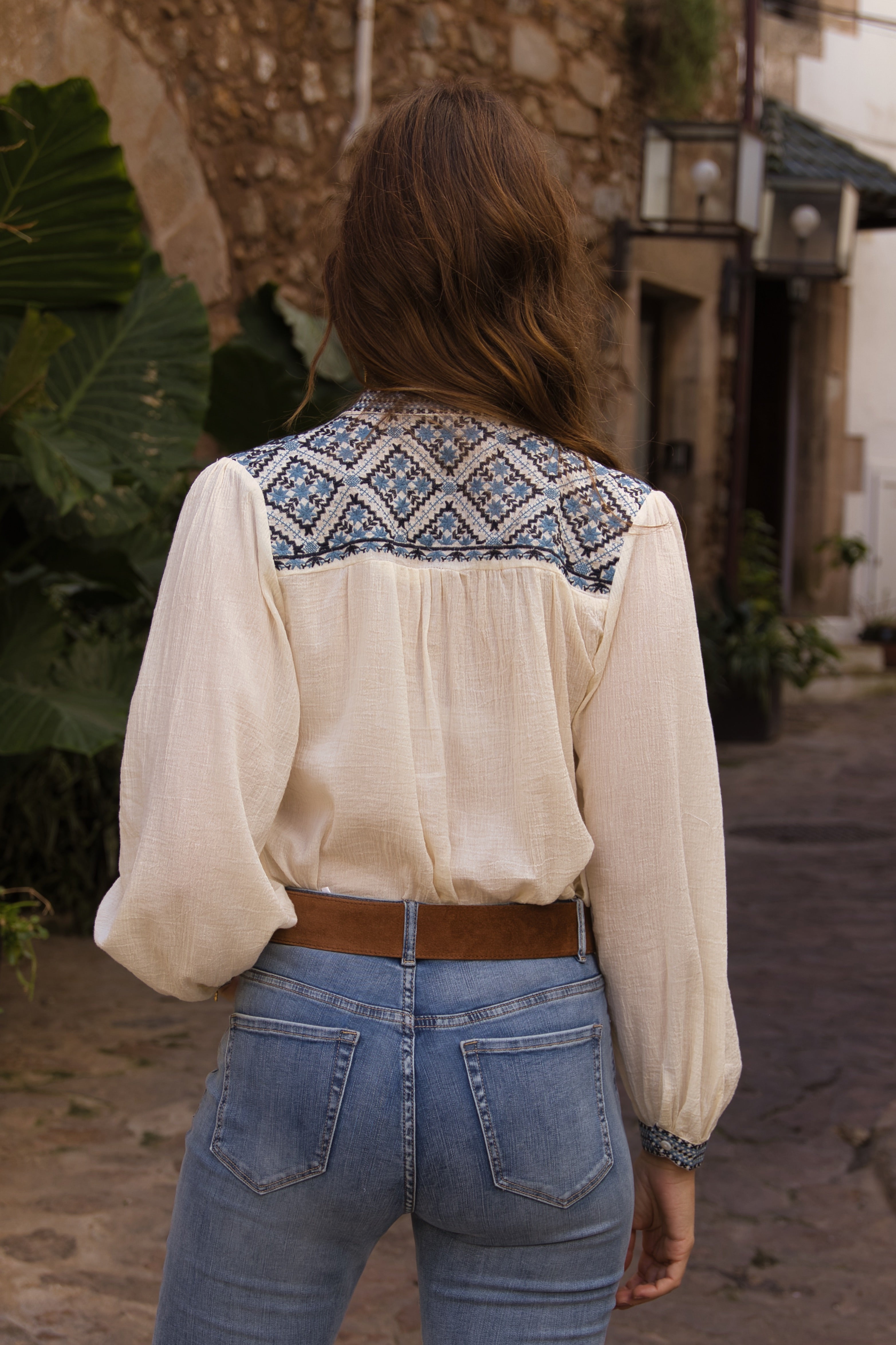 Blusa de 100% algodón, ligera y muy cómoda. Diseñada con un delicado bordado de inspiración étnica en tonos azules en la parte delantera, puños y espalda que le aporta un toque especial y artesanal.