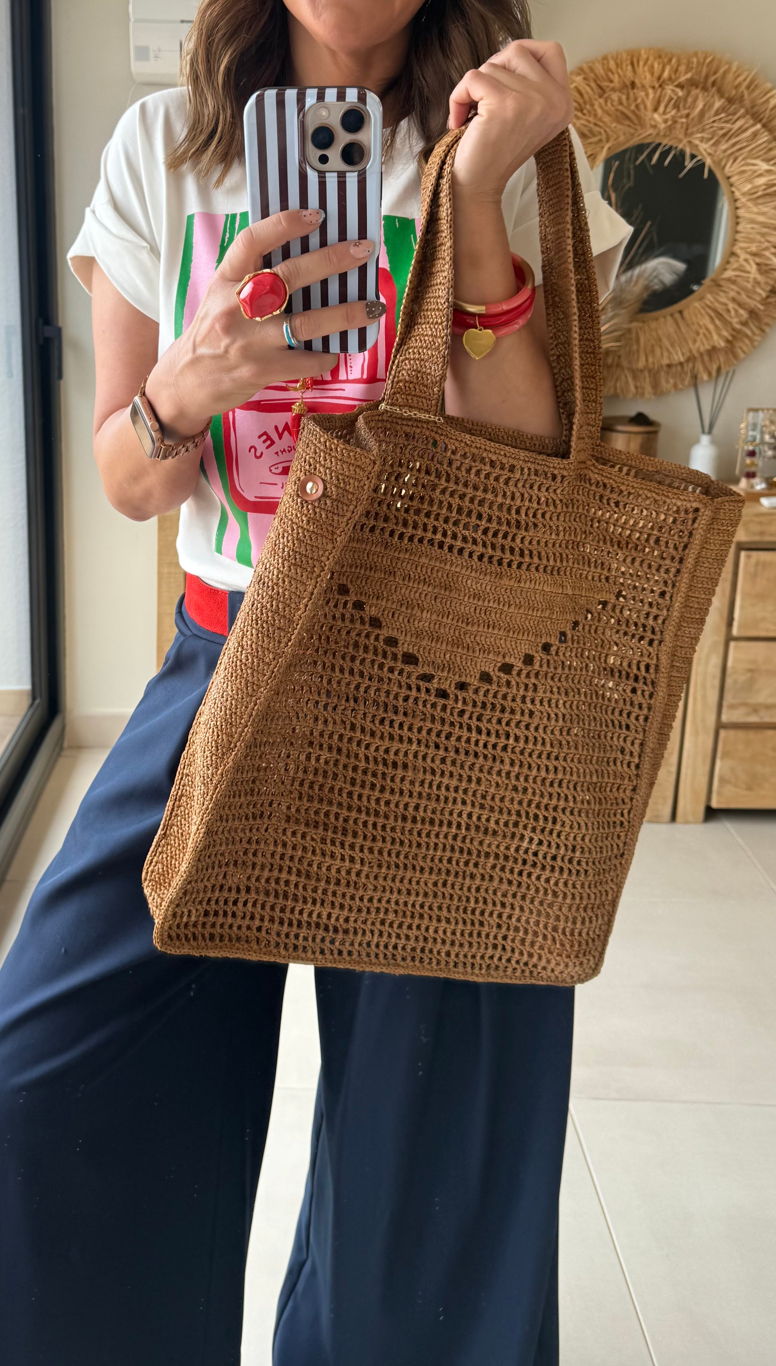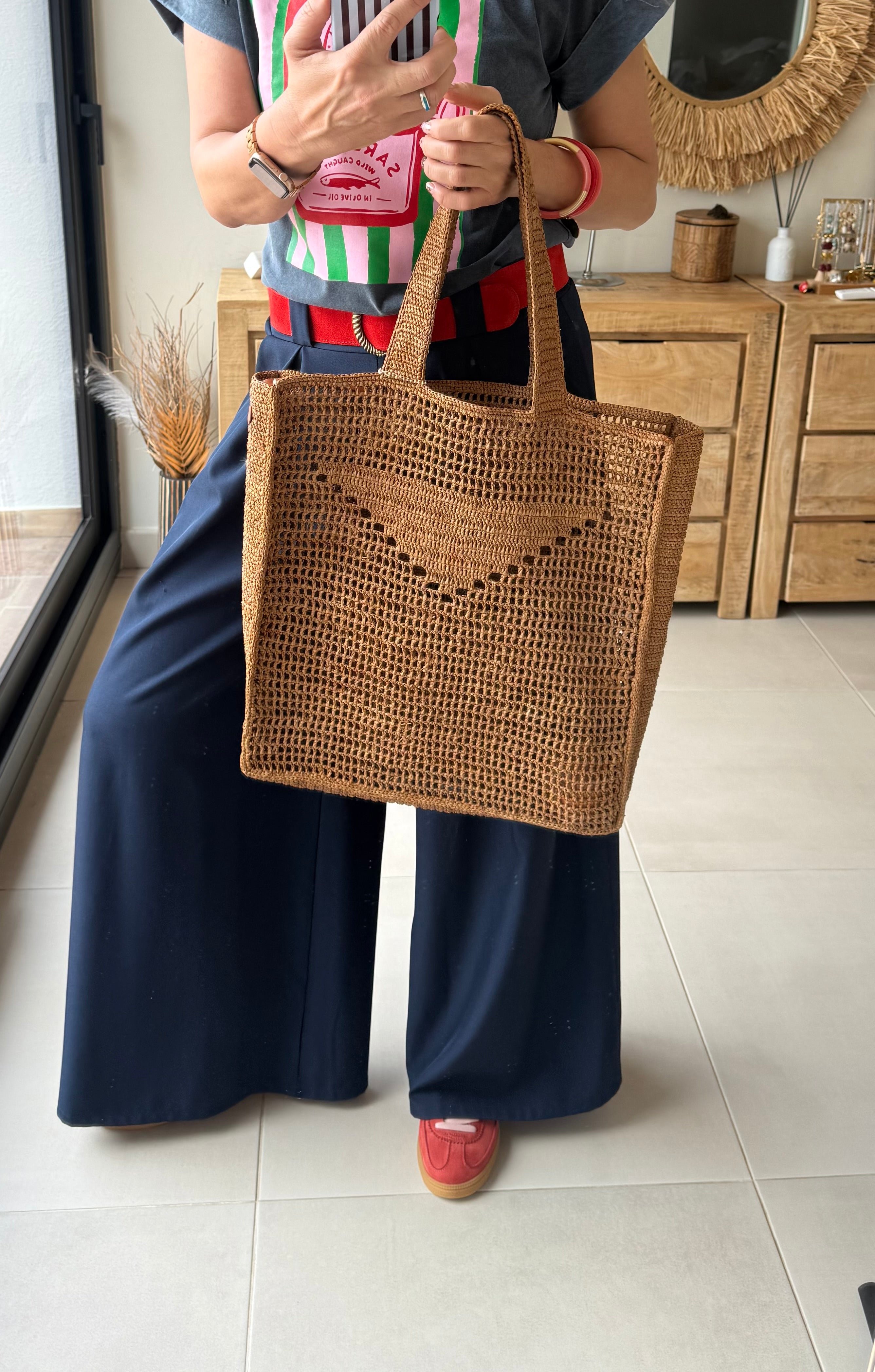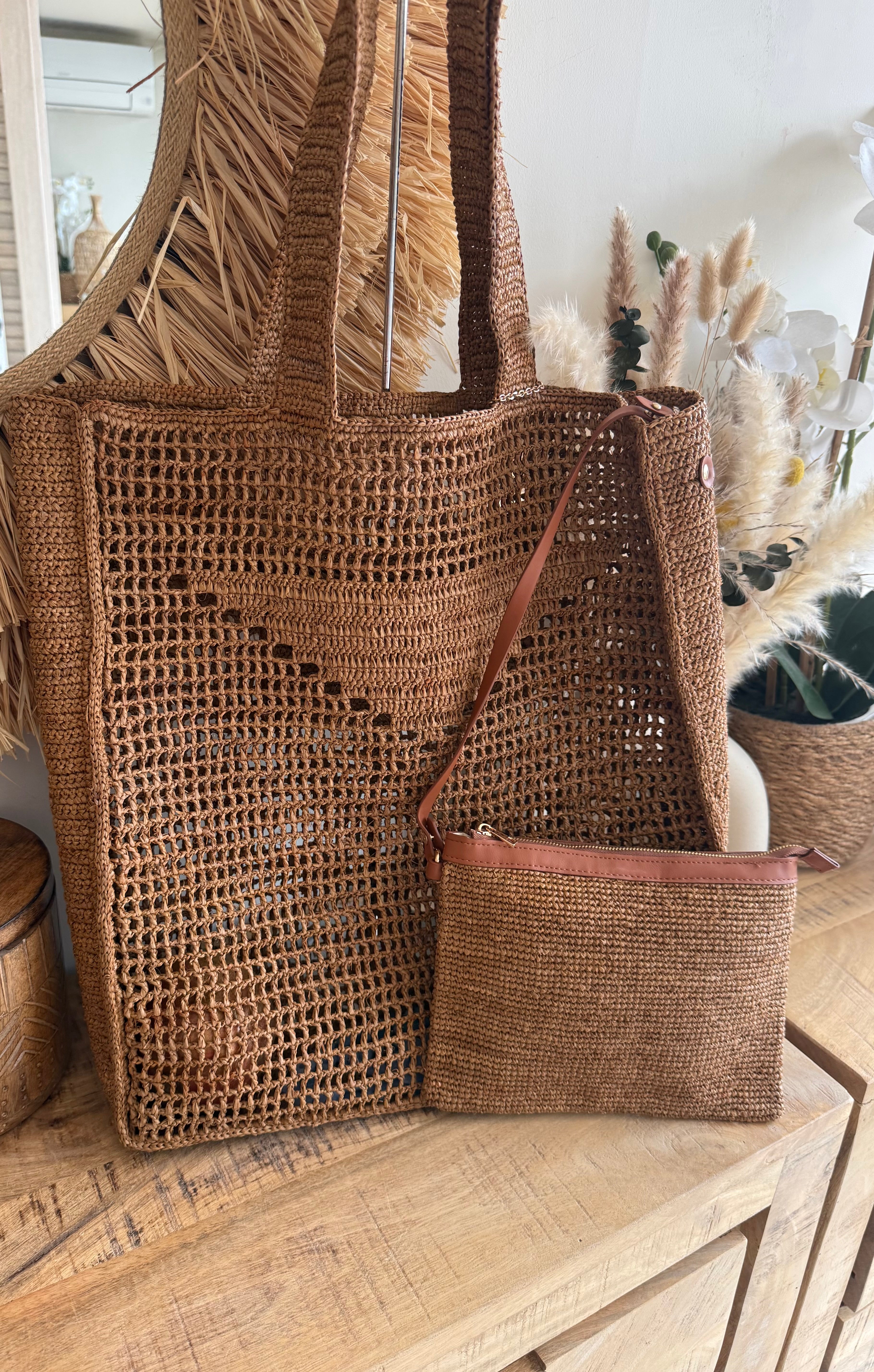 Bolso grande de rafia natural tejido a mano, con diseño calado y asas amplias muy cómodas. Incluye un bolsito interior con cremallera y tira de piel para llevarlo también por separado.