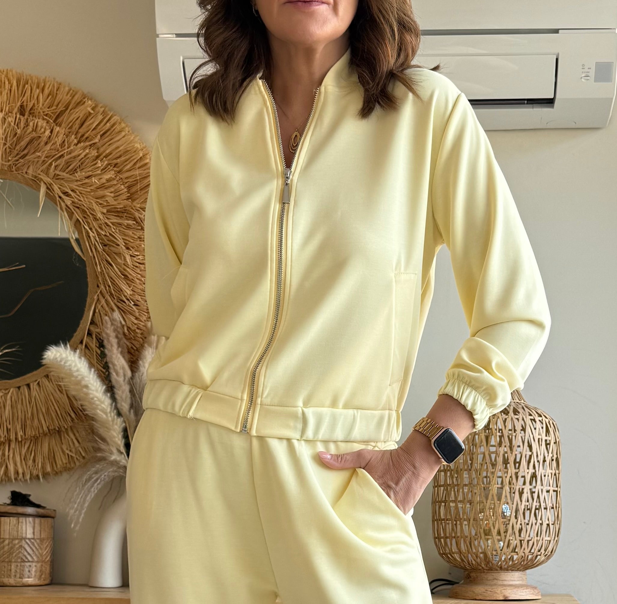 Diseño minimal con cierre frontal de cremallera metálica, bolsillos laterales y acabado elástico en bajo y puños para un ajuste cómodo sin marcar.