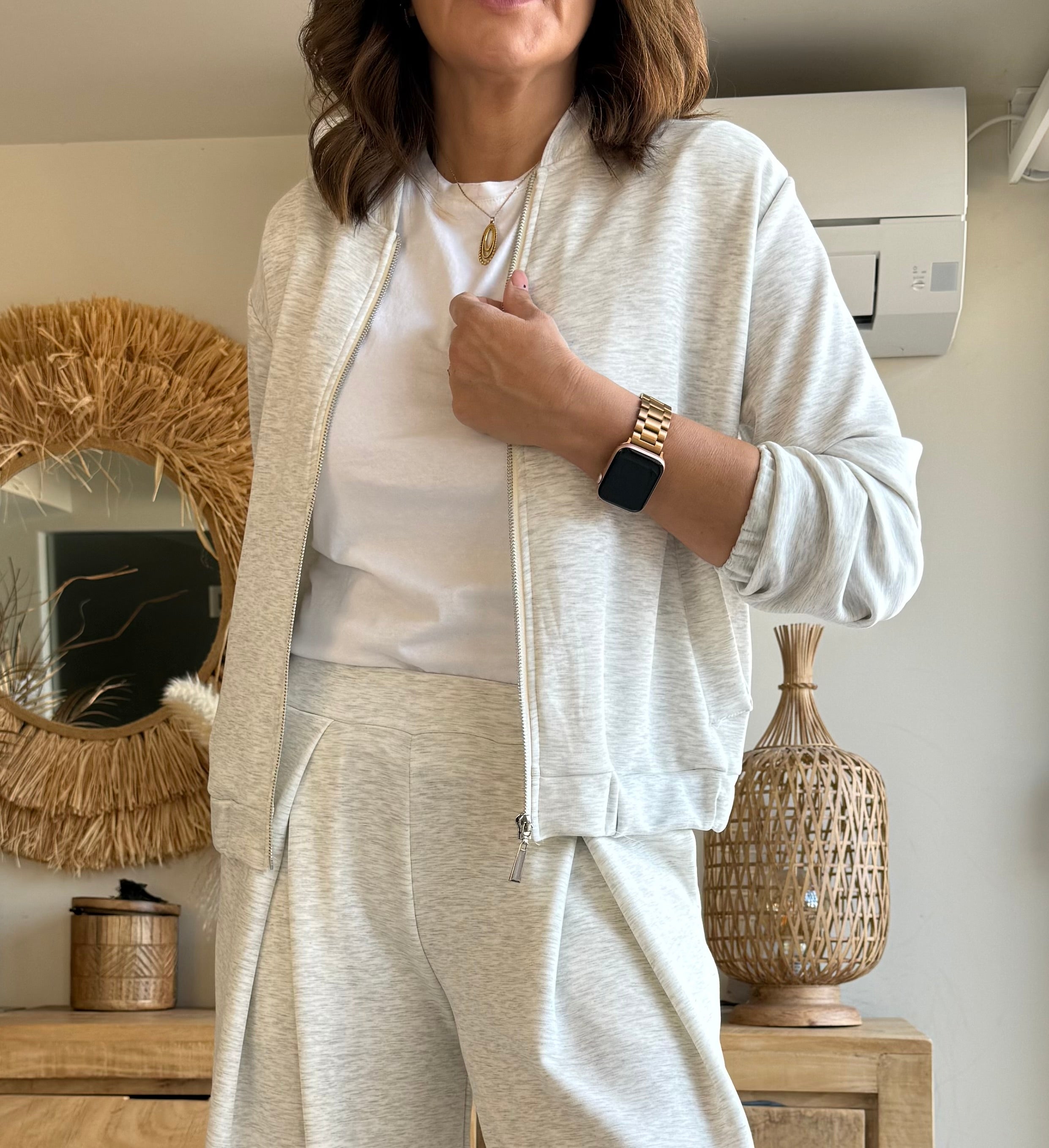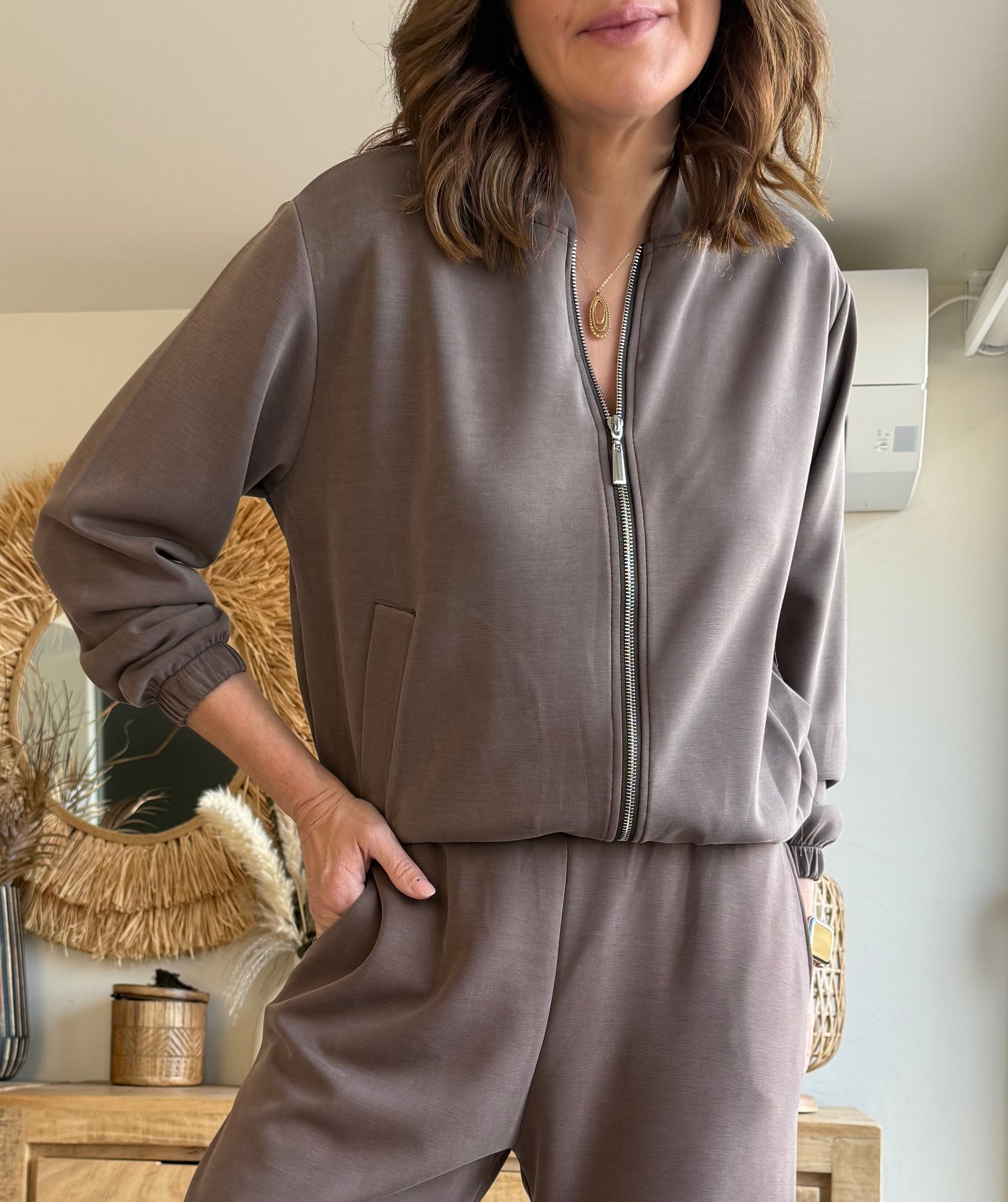 Chaqueta tipo bomber confeccionada en tejido ultra suave efecto punto liso, con caída fluida y tacto muy agradable.