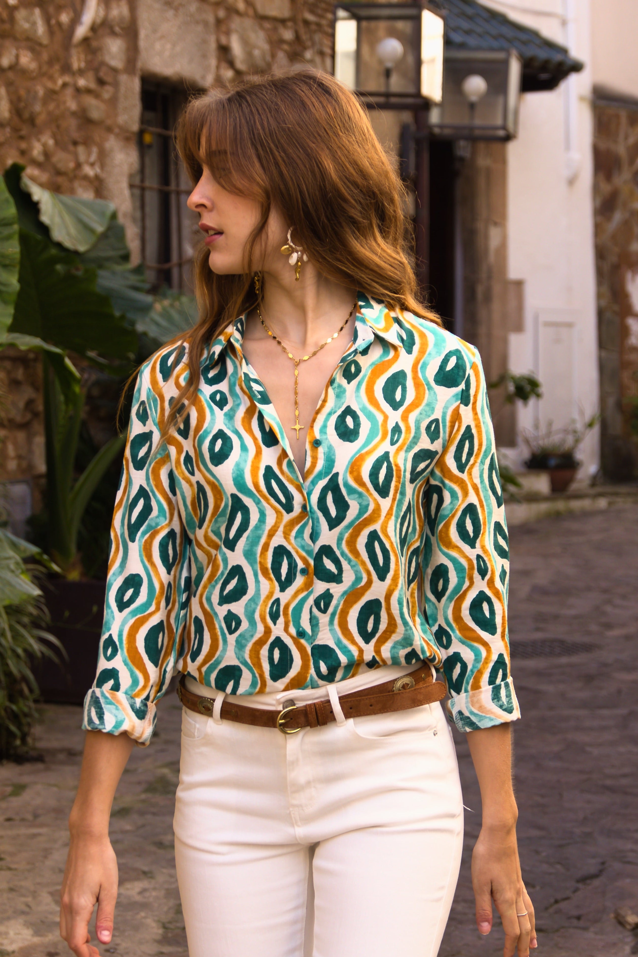 Camisa estampada con motivo ikat en tonos verde, teja y crudo. Diseño fresco y muy favorecedor que aporta luz al rostro y eleva cualquier look.