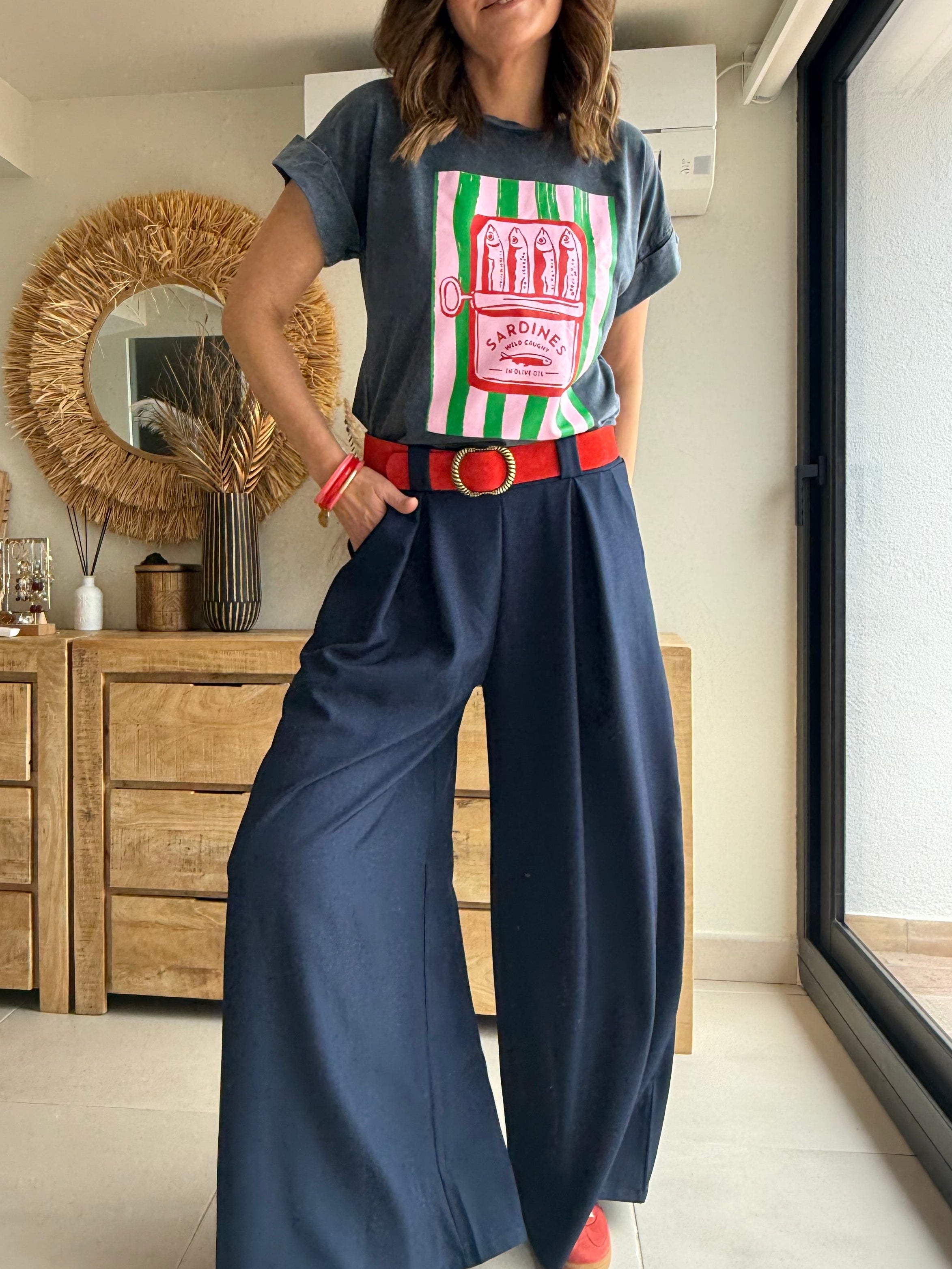 Camiseta de algodón con ilustración de sardinas de inspiración mediterránea, divertida y muy veraniega. Su corte relajado y manga vuelta la hacen cómoda y fácil de combinar con jeans, pantalones fluidos o faldas. Una camiseta con personalidad que levanta cualquier look.