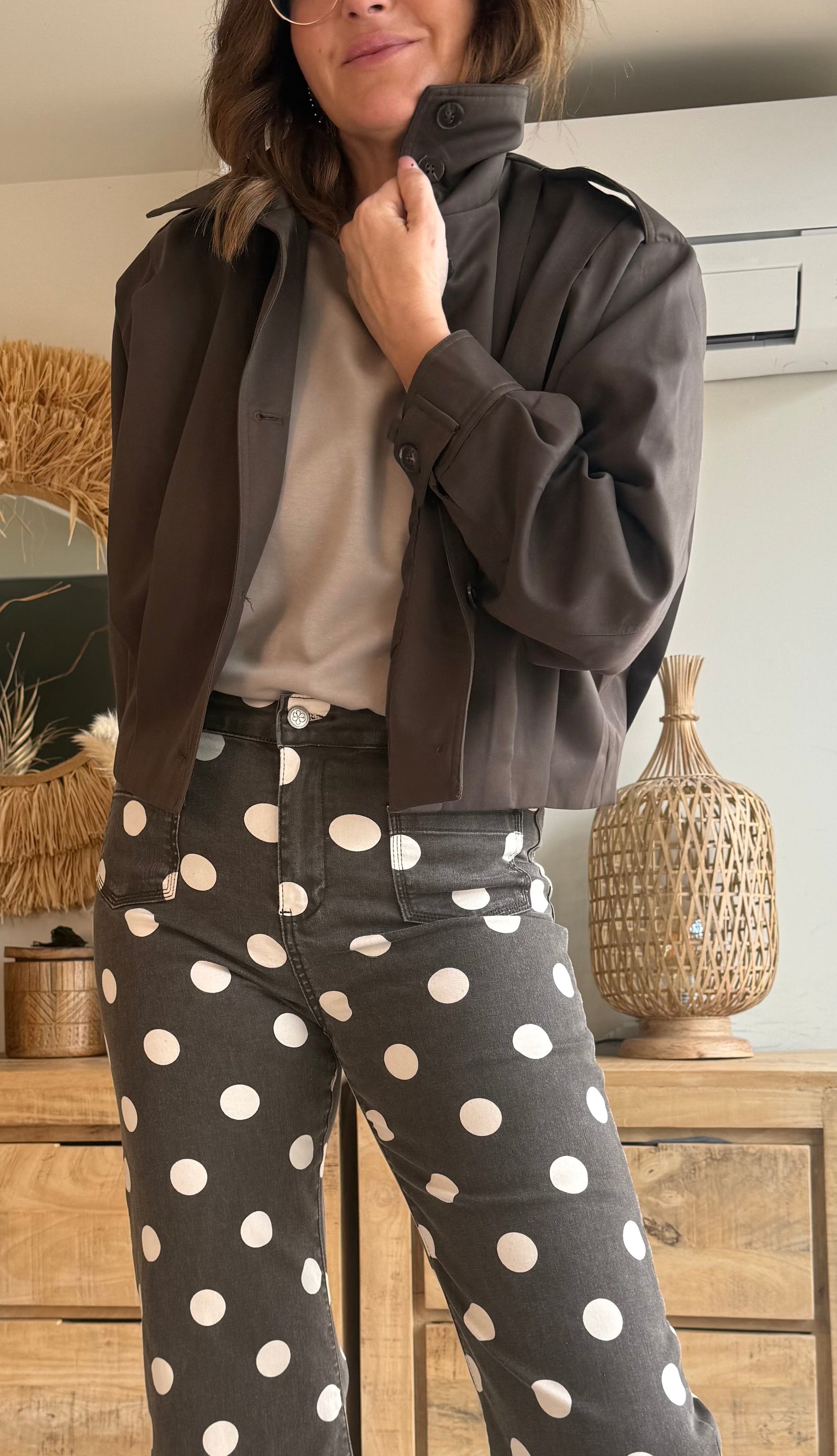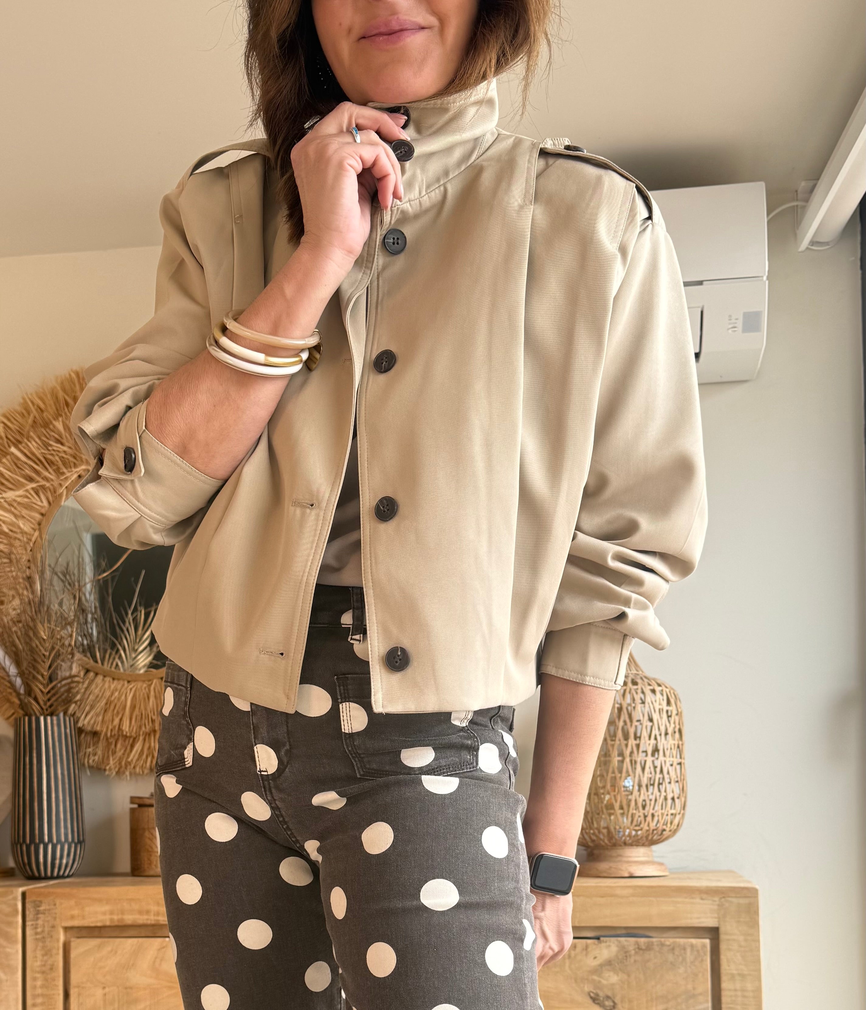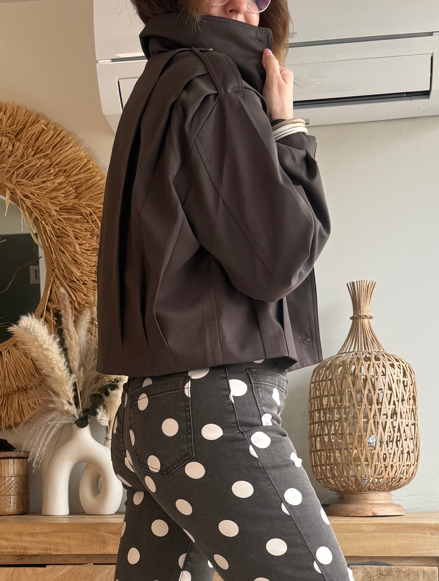 Tiene cuello alto que puedes llevar abierto o subido, botones frontales y detalle en hombros que le aporta un aire sofisticado y actual. El corte ligeramente amplio la hace comodísima y muy favorecedora.