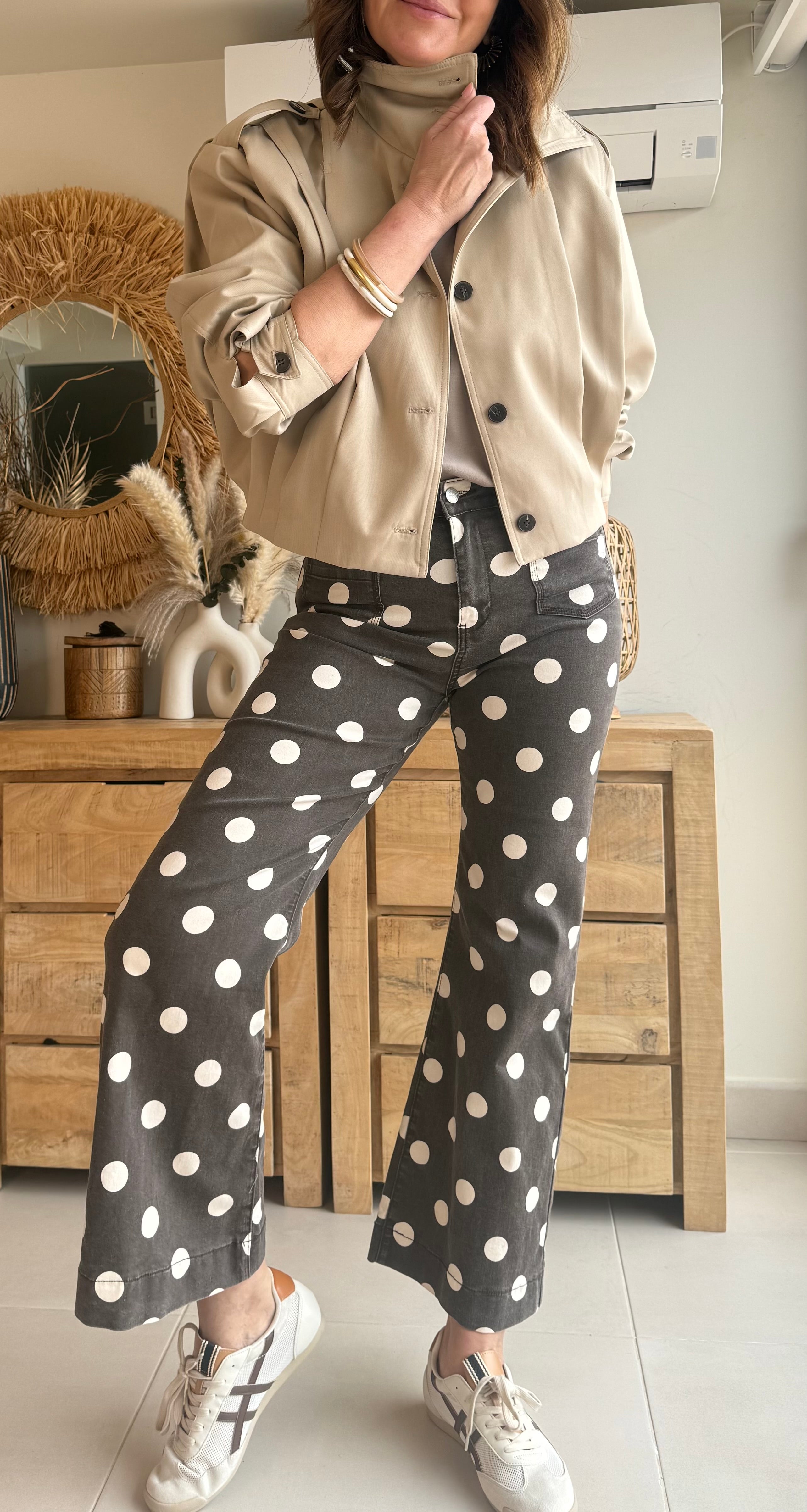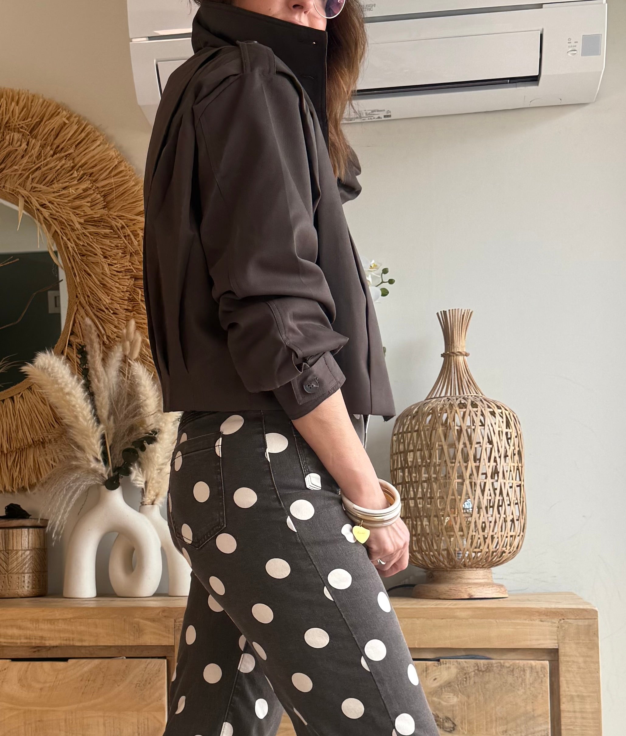 Chaqueta corta de líneas limpias y diseño estructurado, perfecta para elevar cualquier look del día a la noche. Su tejido es 100% poliéster de alta calidad, con una caída y un tacto tan suave que no parece poliéster en absoluto.