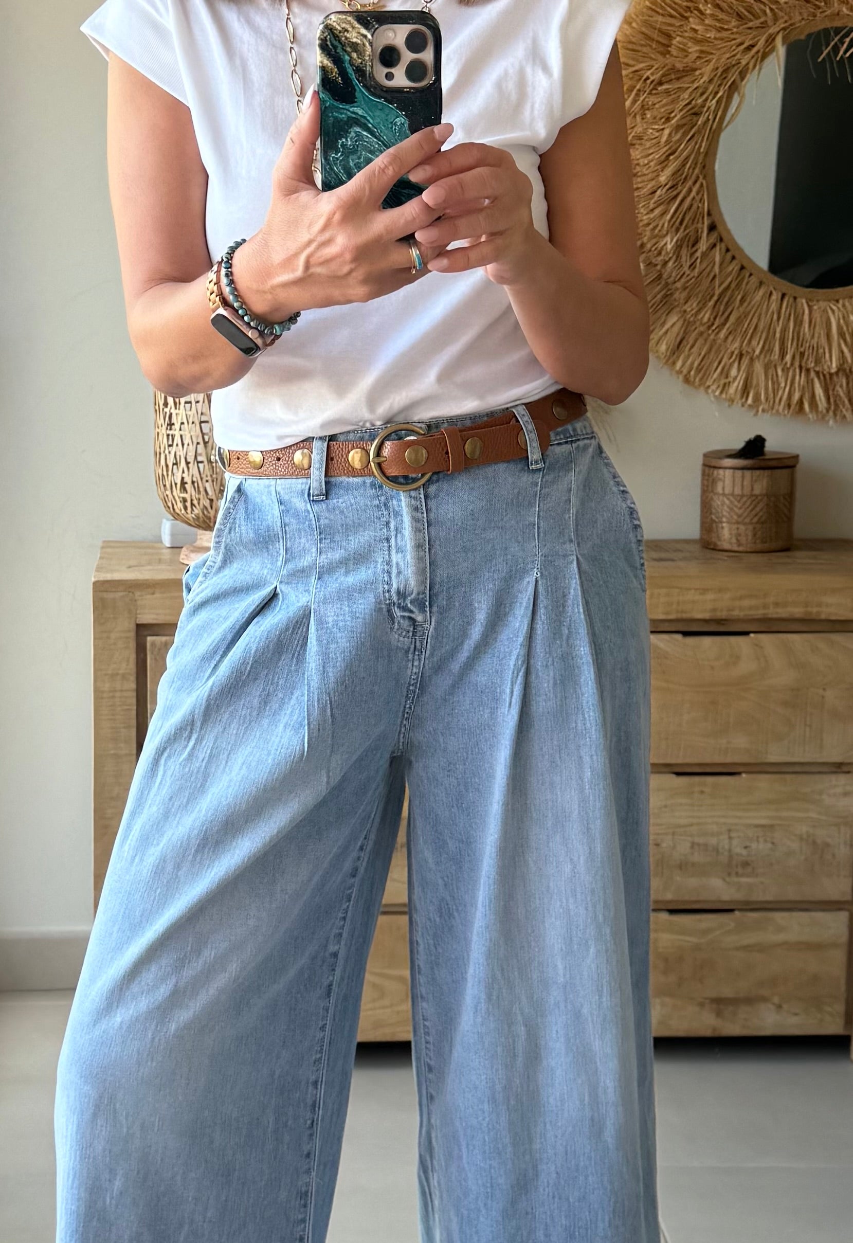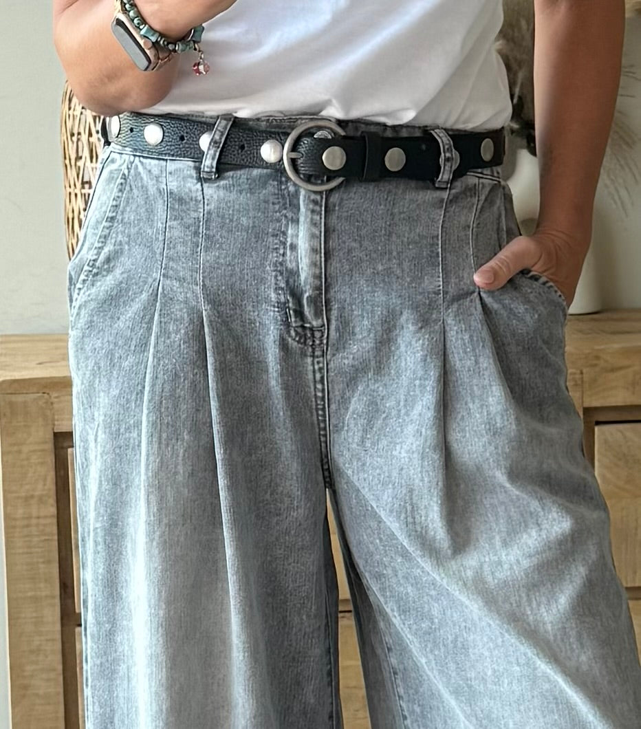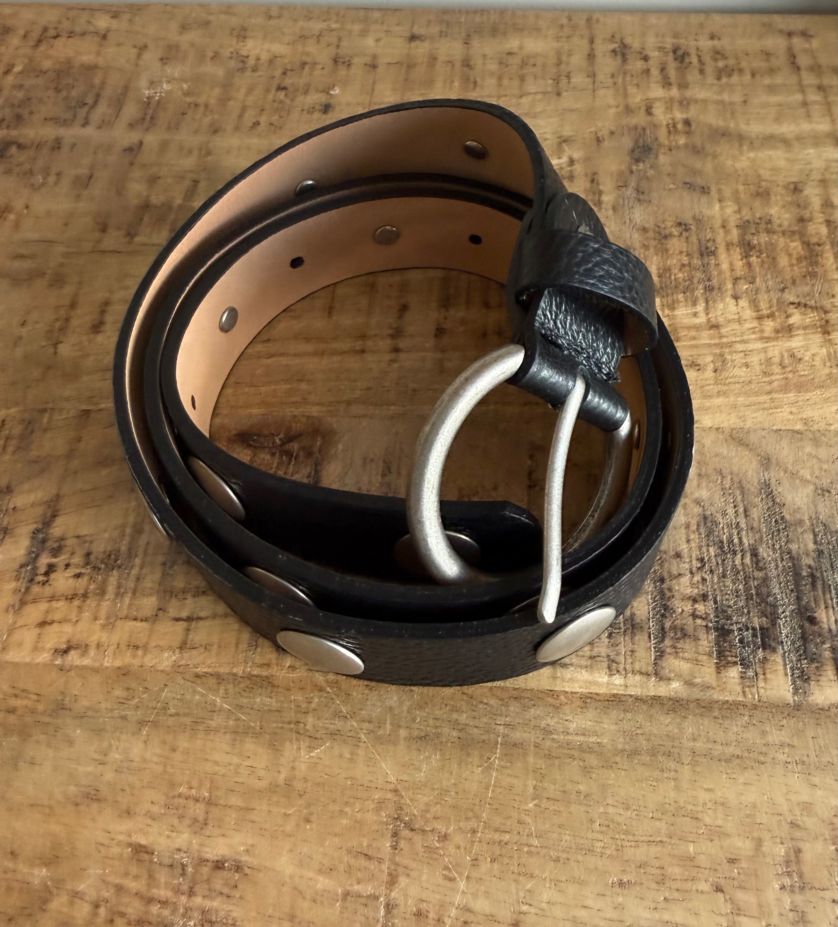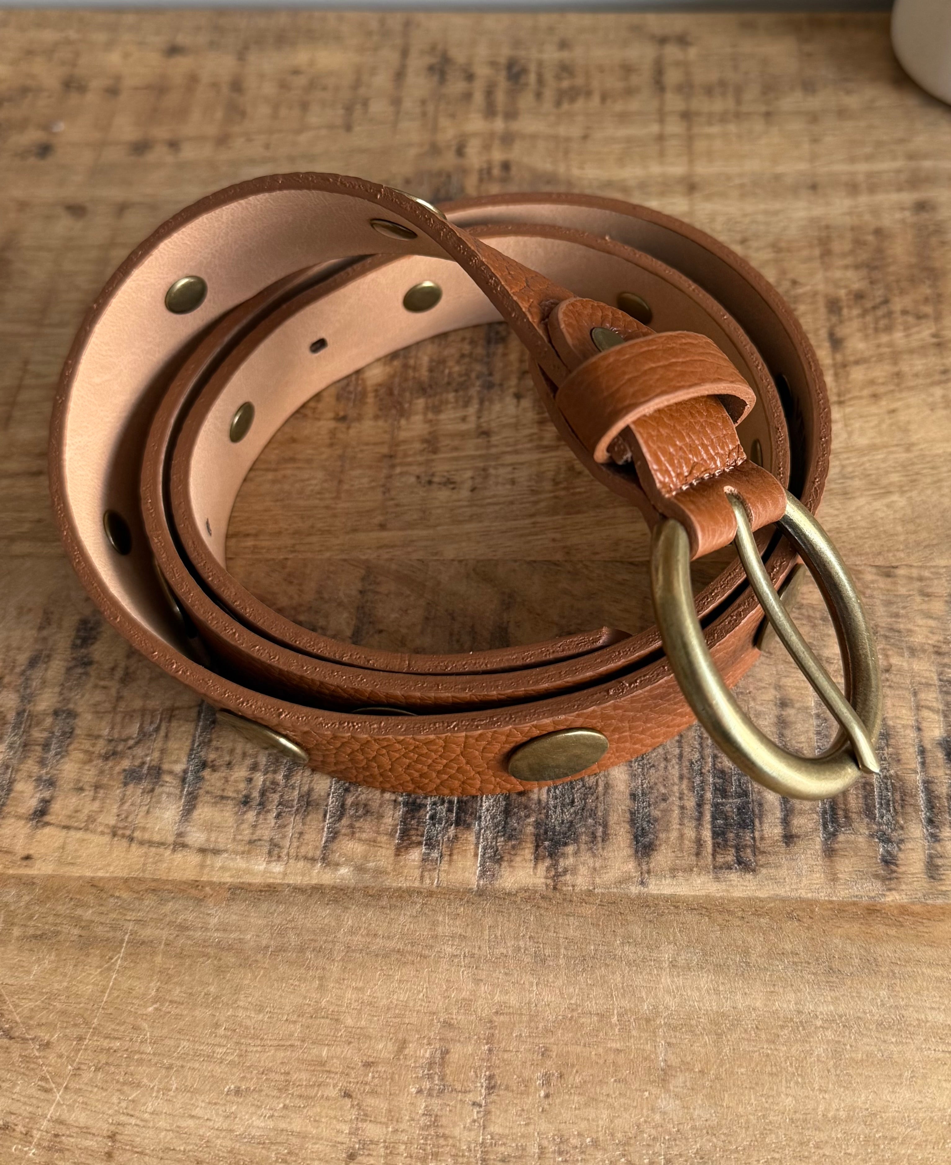 Cinturón de piel auténtica con acabado artesanal y detalles de remaches metálicos que aportan personalidad sin recargar.