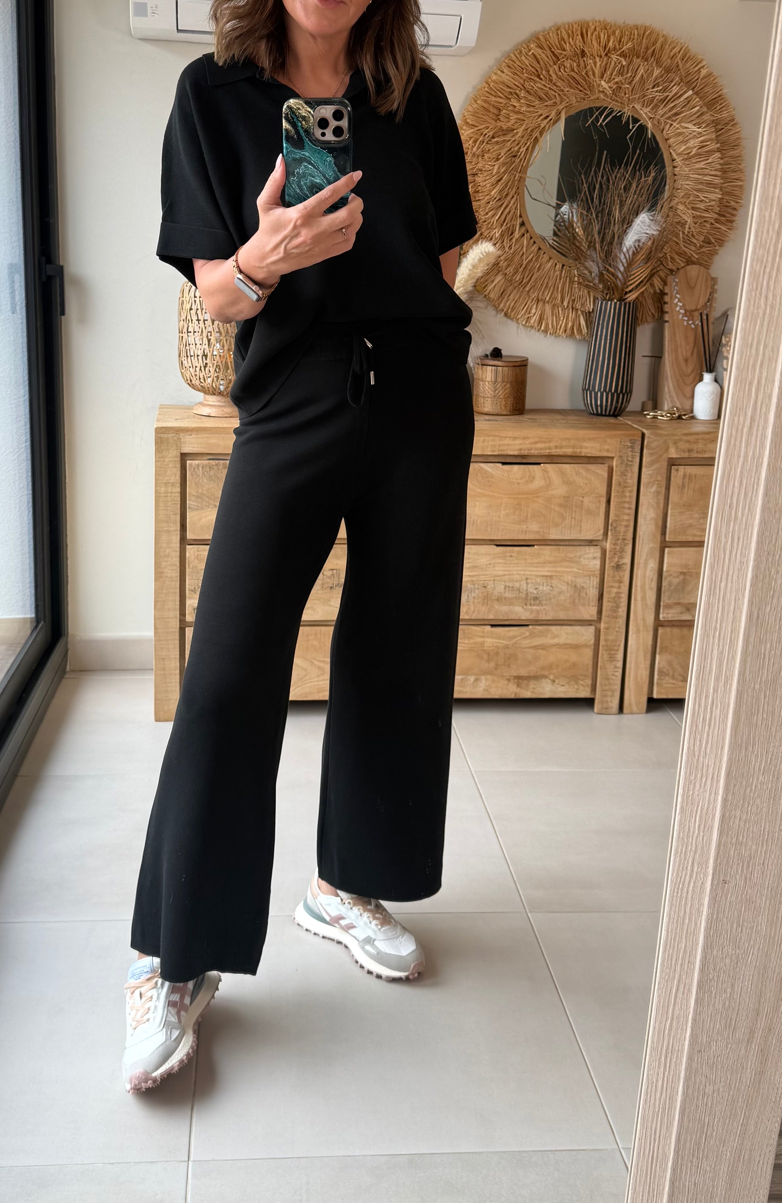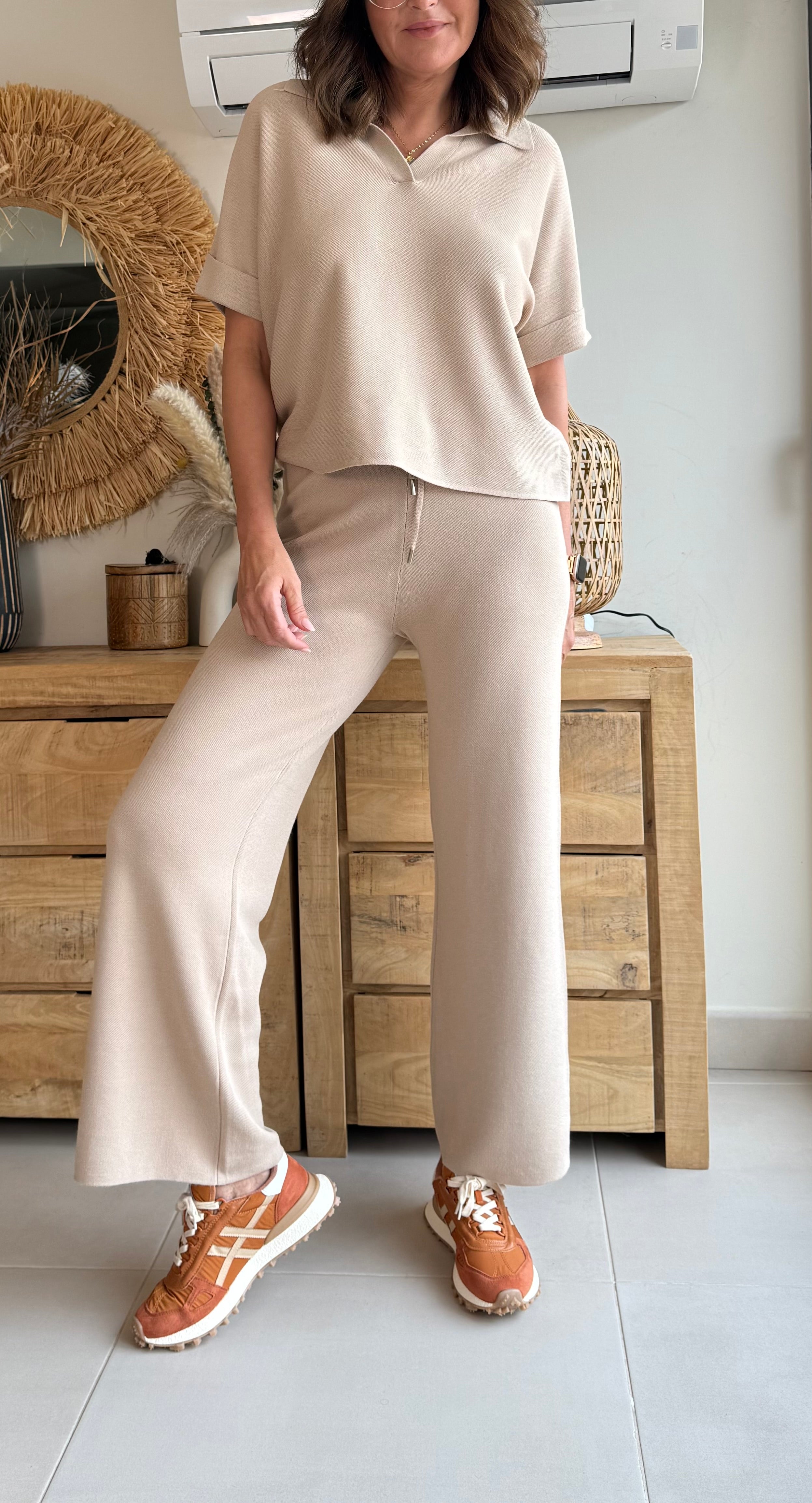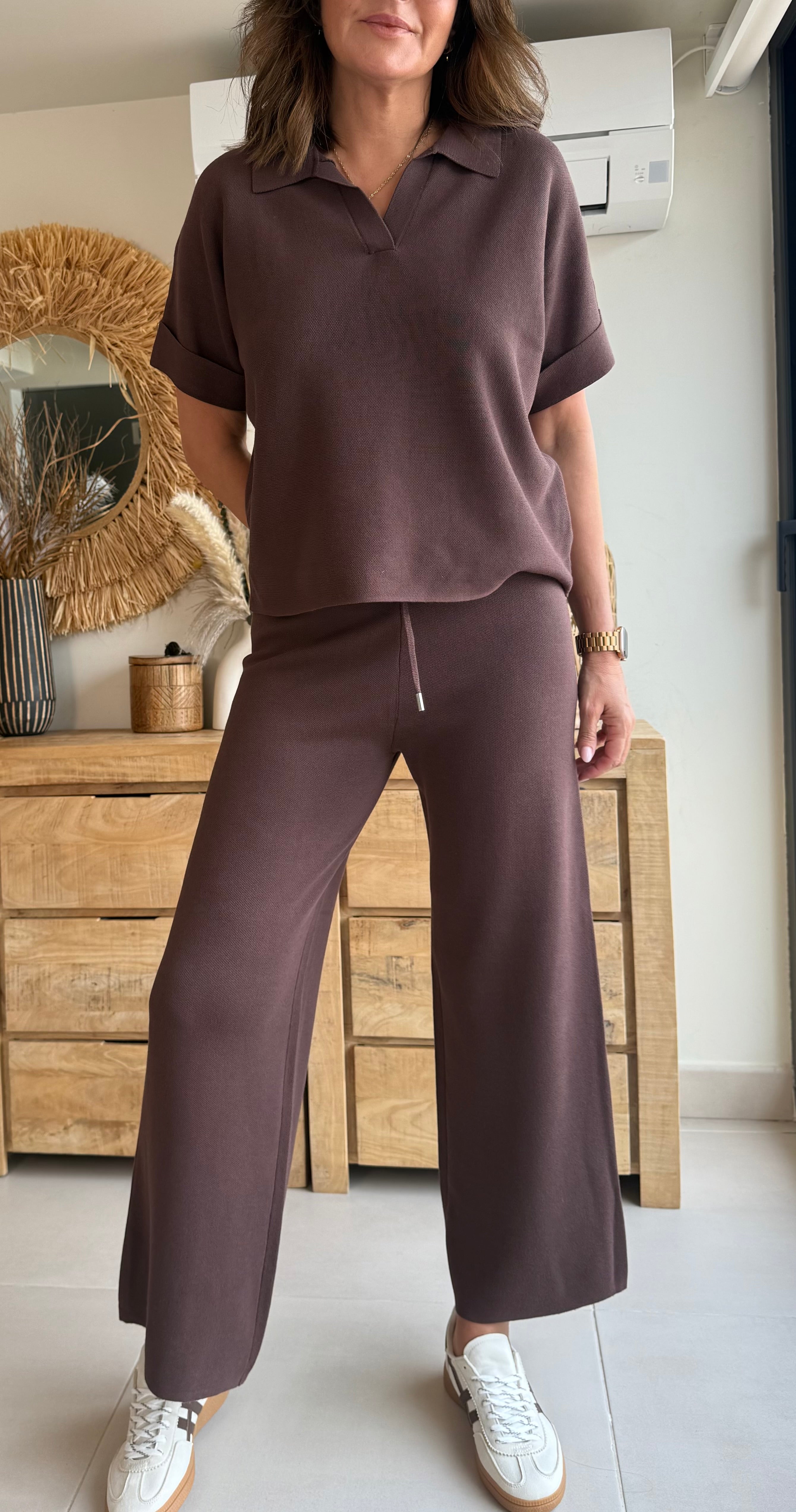 Conjunto de dos piezas en punto suave tipo polo, perfecto para ir cómoda sin renunciar al estilo.