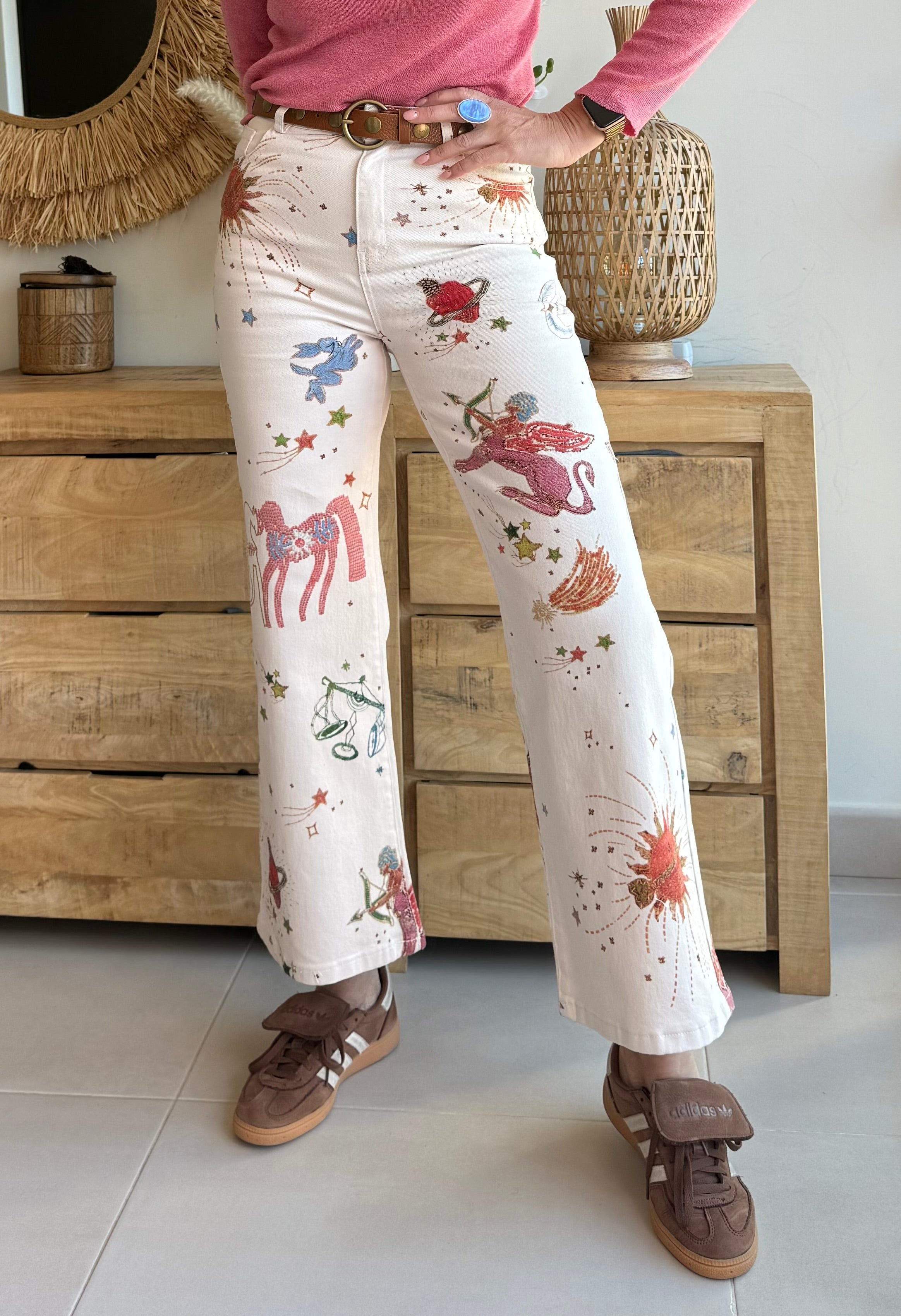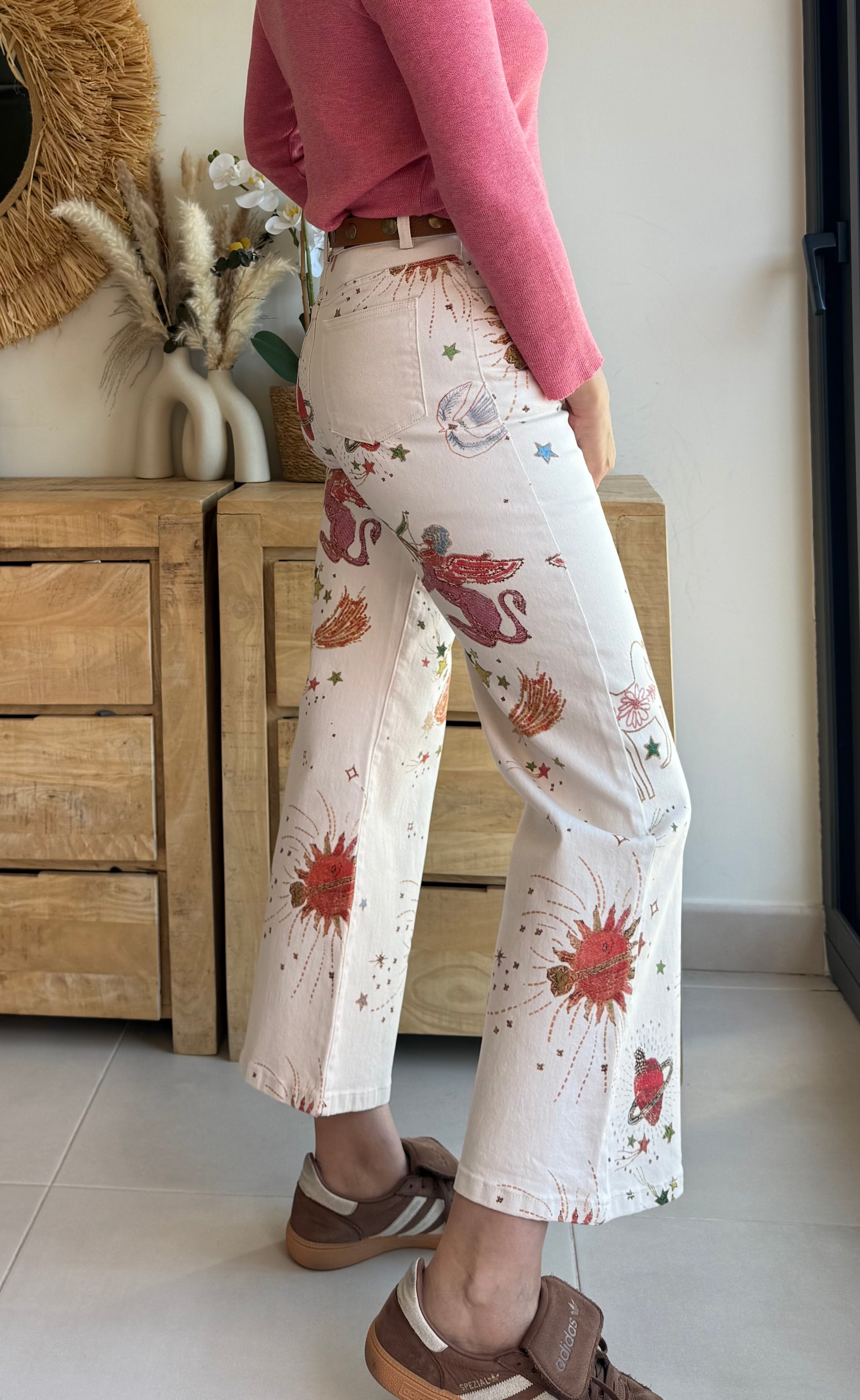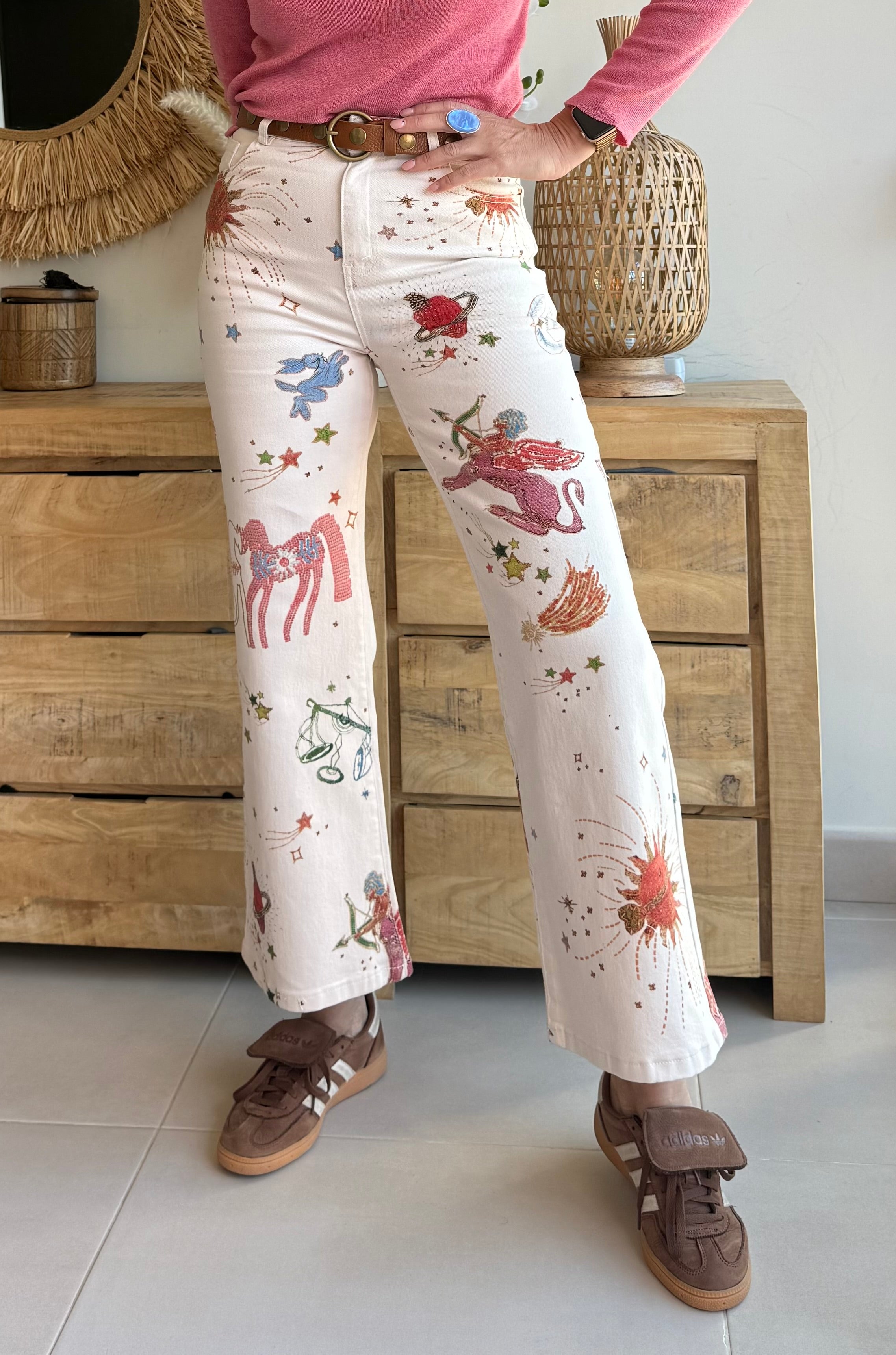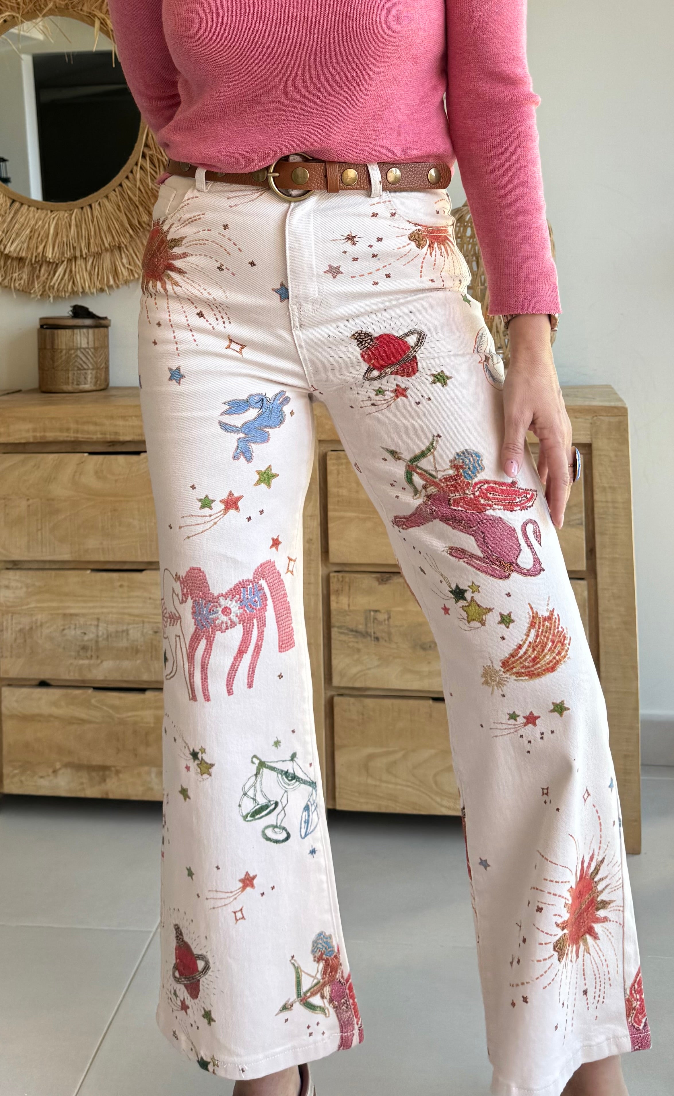 Jean estampado de corte recto y ligeramente acampanado, con tiro medio-alto que estiliza y define la silueta.