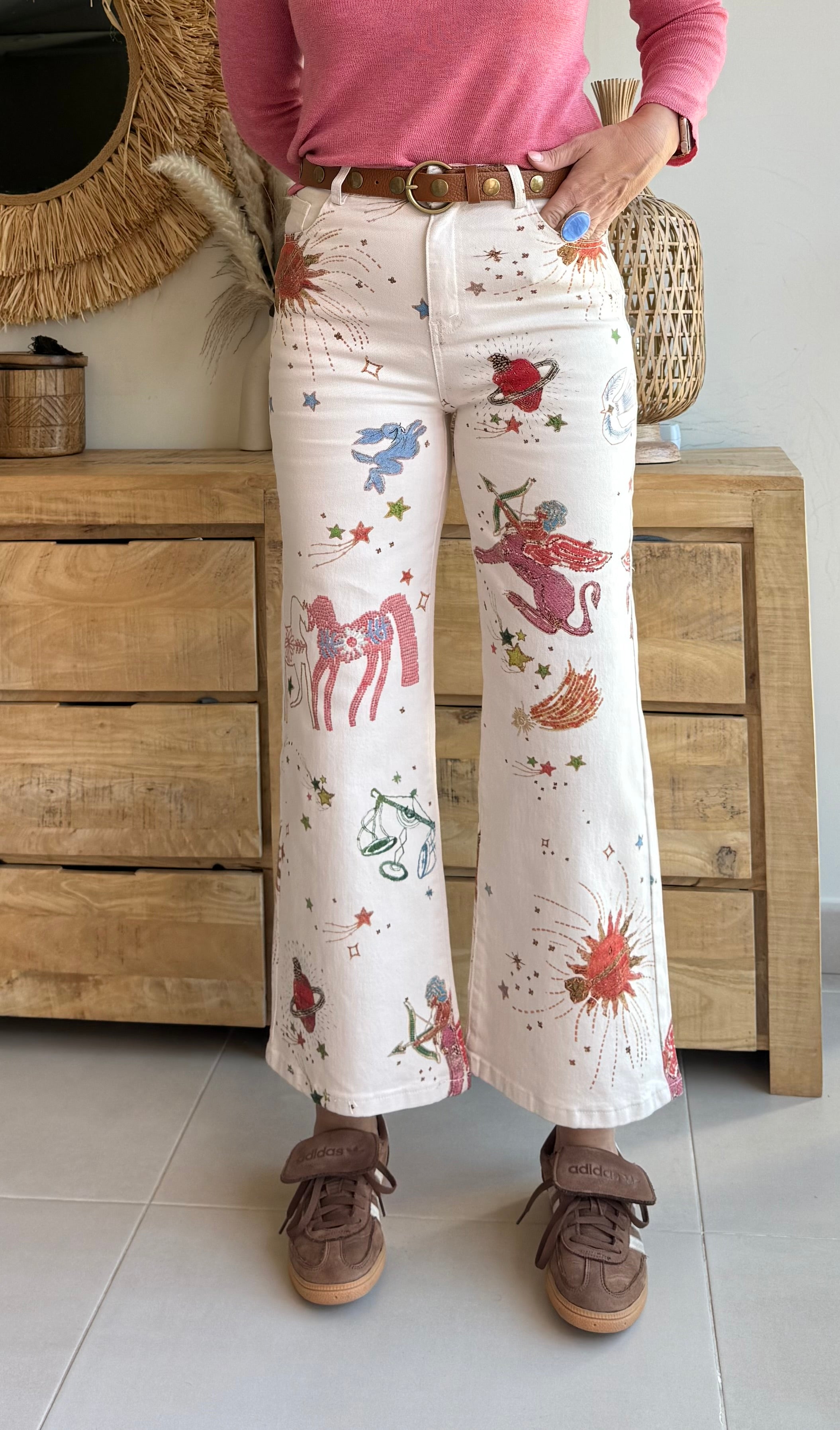 Su diseño está inspirado en el universo y los signos del zodiaco, con ilustraciones bordadas en tonos rojo, verde y azul sobre base cruda. Una pieza especial y diferente que convierte cualquier look básico en algo único.