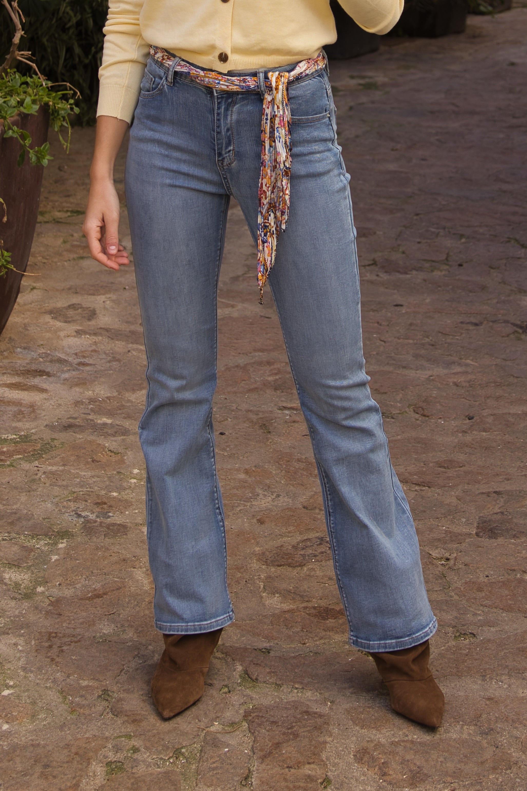 Tejano acampanado de tiro medio con bajo ligeramente flare que estiliza la pierna y equilibra la silueta. Tejido elástico muy cómodo que se adapta al cuerpo sin marcar. Incluye pañuelo estampado para llevar en la cintura y darle un toque especial. Disponible en denim azul y en blanco.