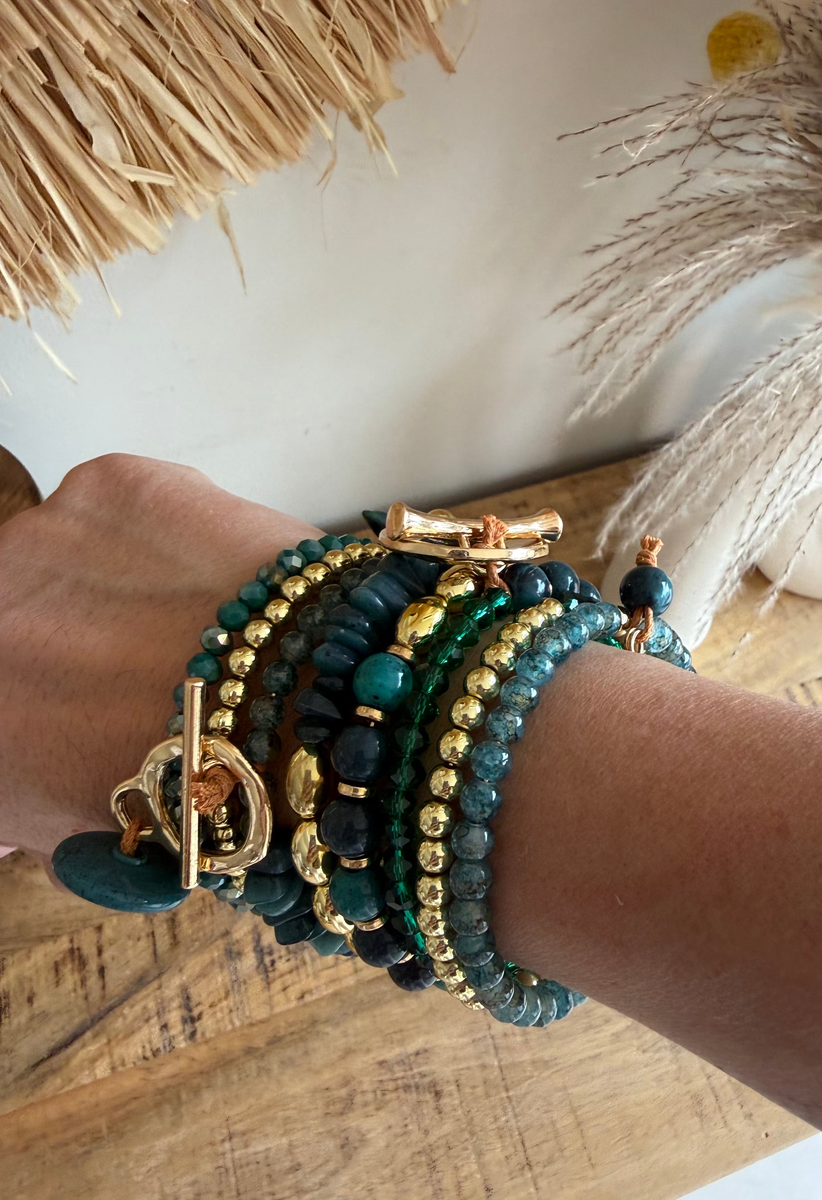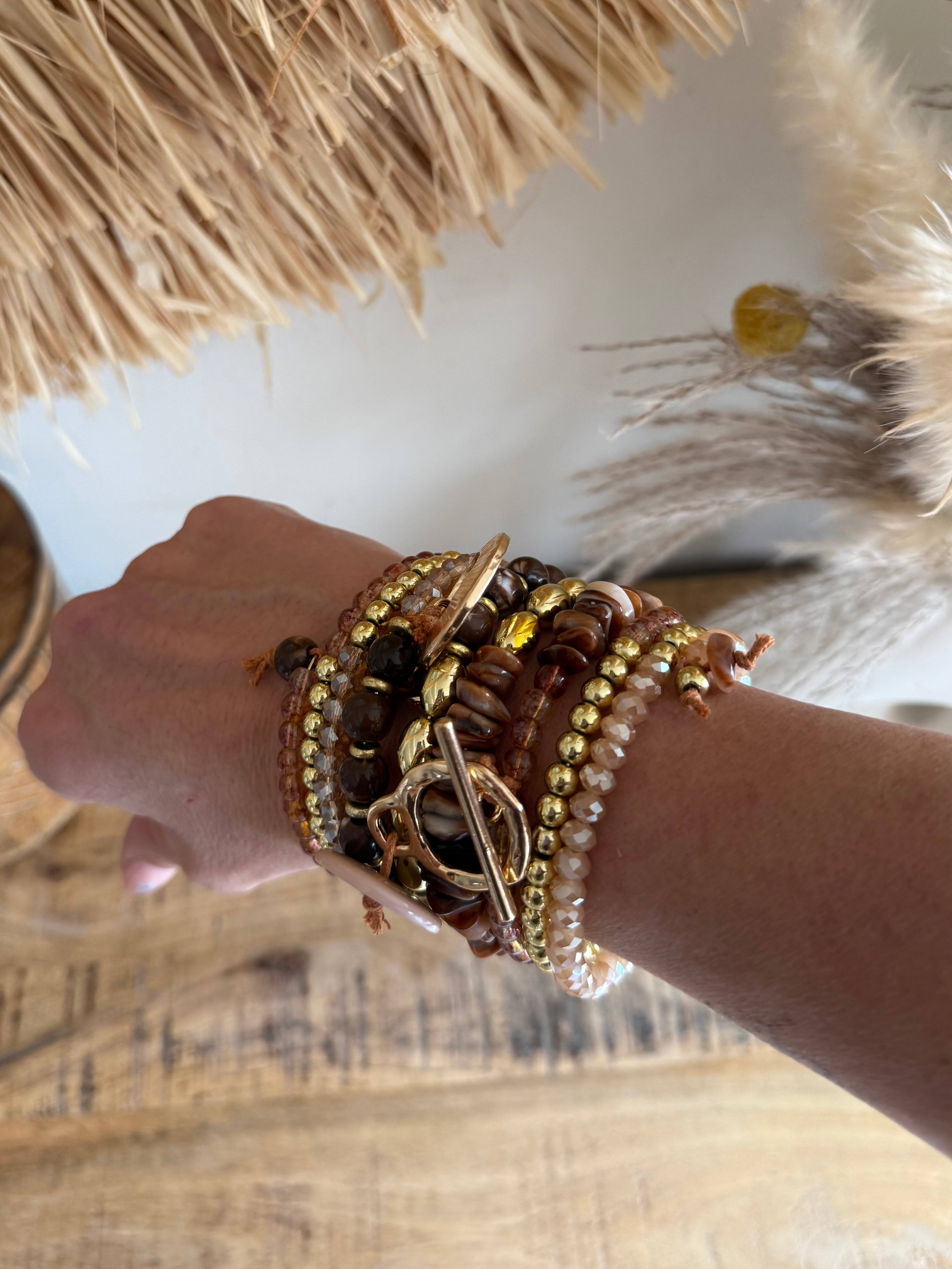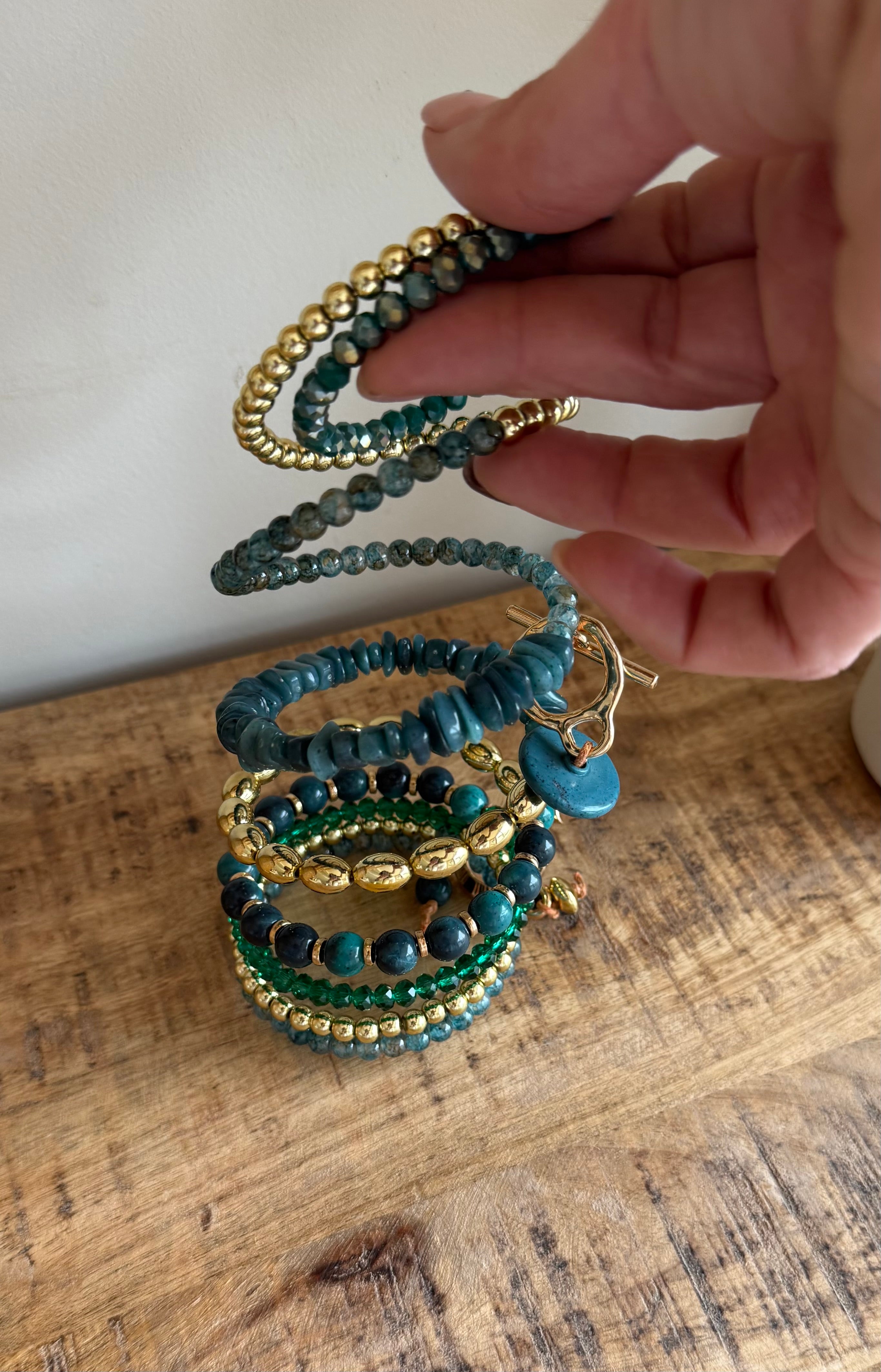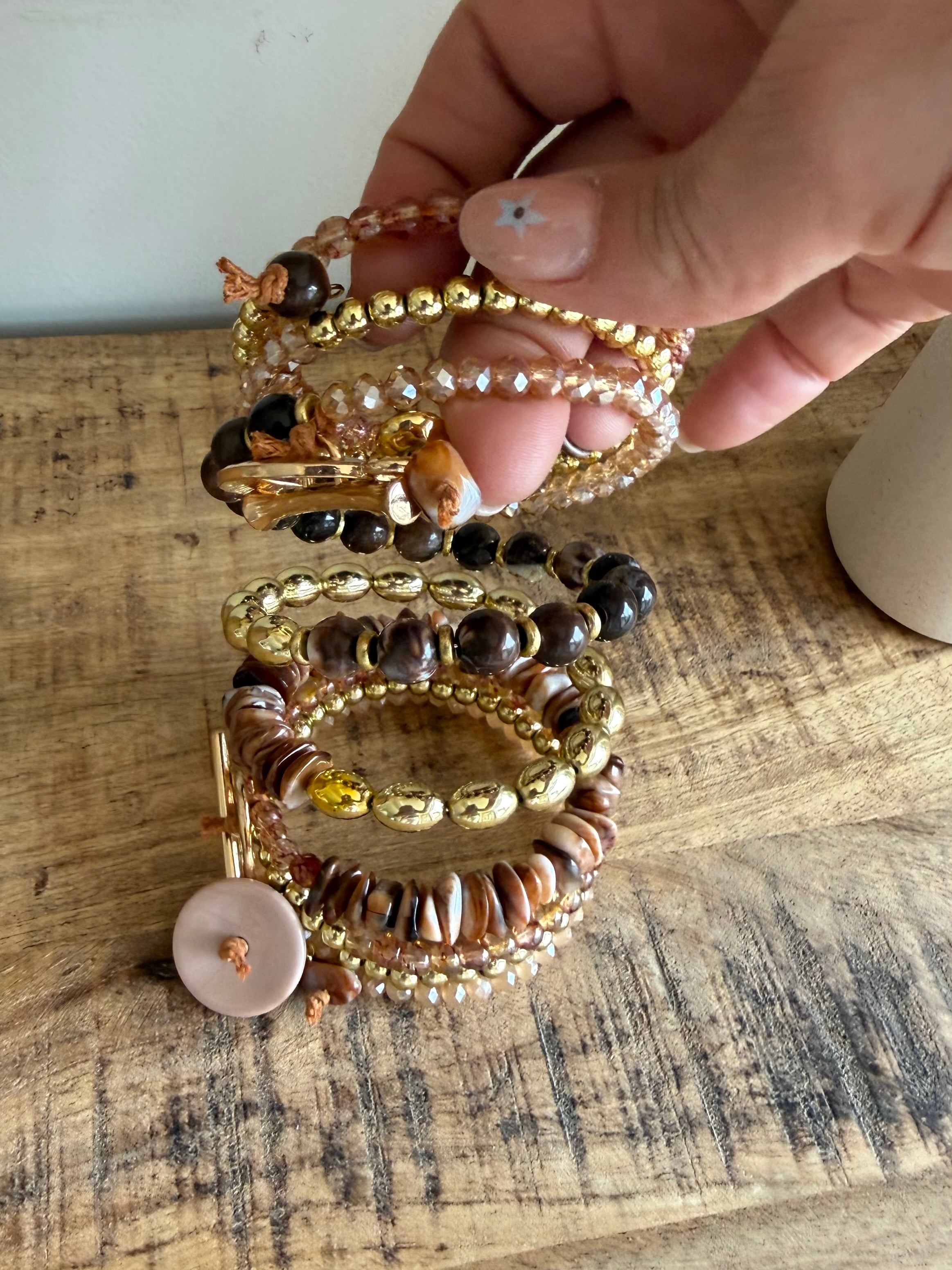 Pulsera enrollable de estilo boho elaborada con múltiples cuentas en tonos naturales y dorados que aportan luz y personalidad. Combina diferentes texturas y piedras con cierre decorativo dorado que le da un toque especial. Flexible y muy cómoda, ideal para llevar sola o combinada y elevar cualquier look con un aire sofisticado y artesanal.