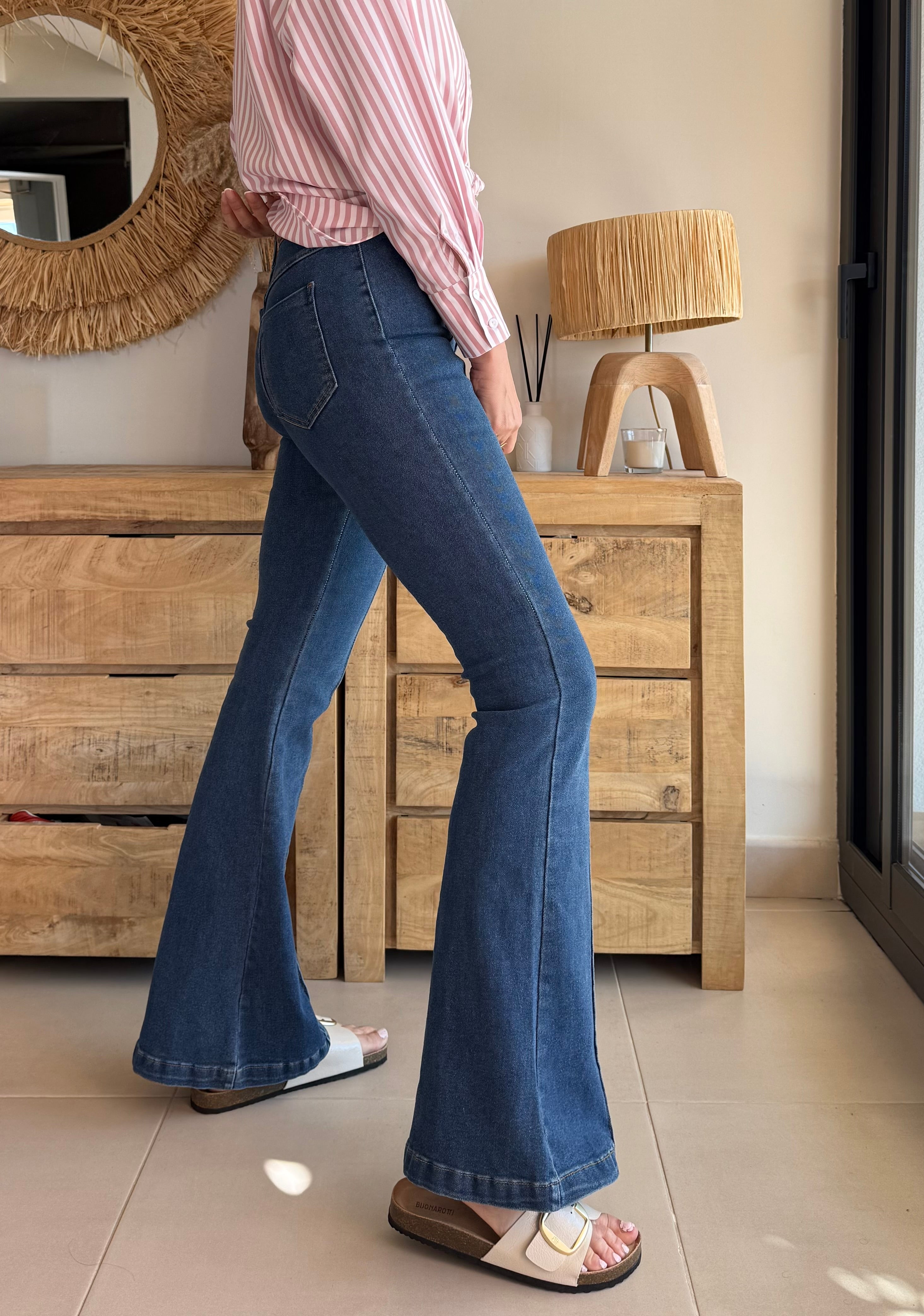 Nuestro jean de campana de cintura alta es de esos que sientan como un guante y estilizan sin esfuerzo.
