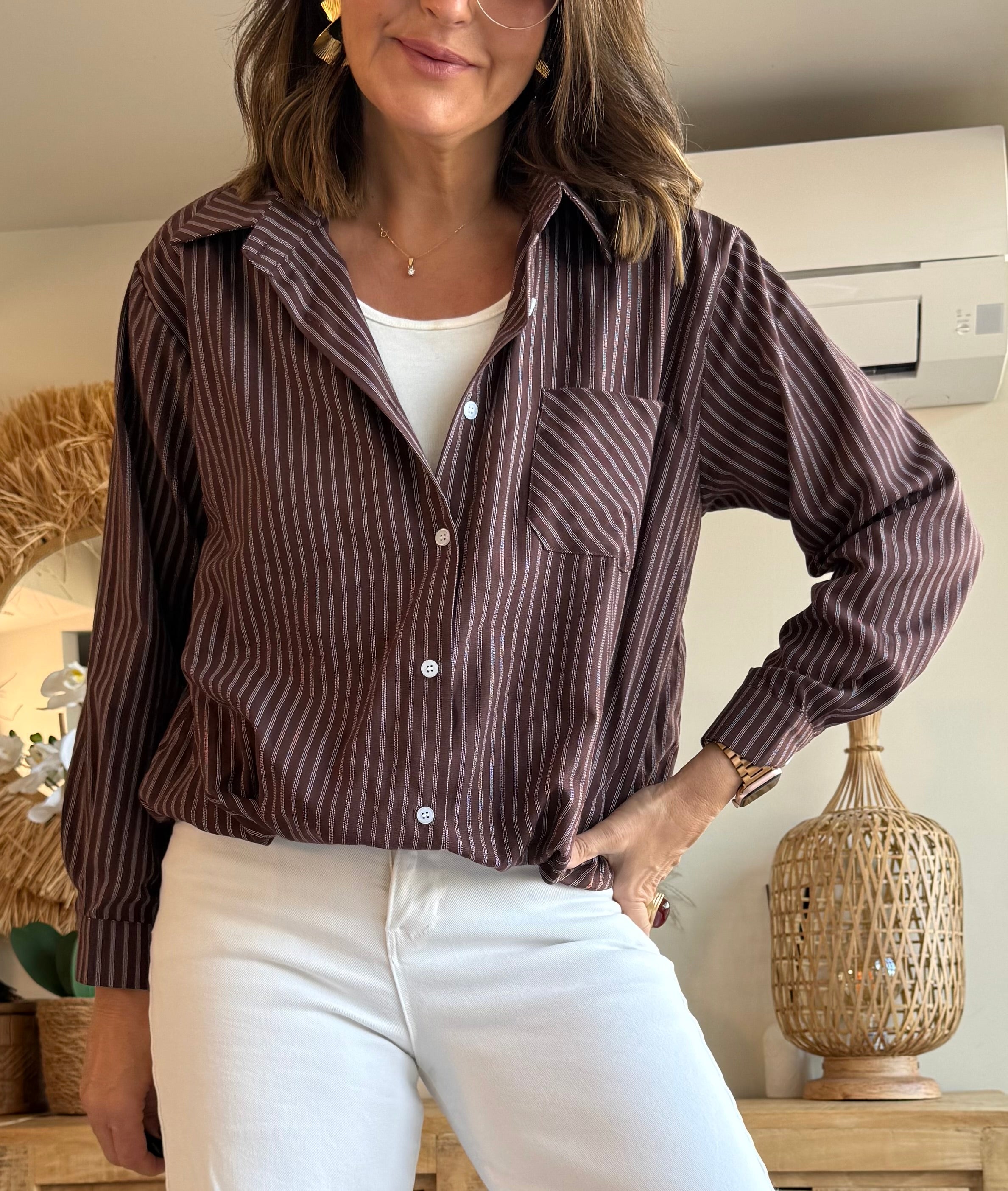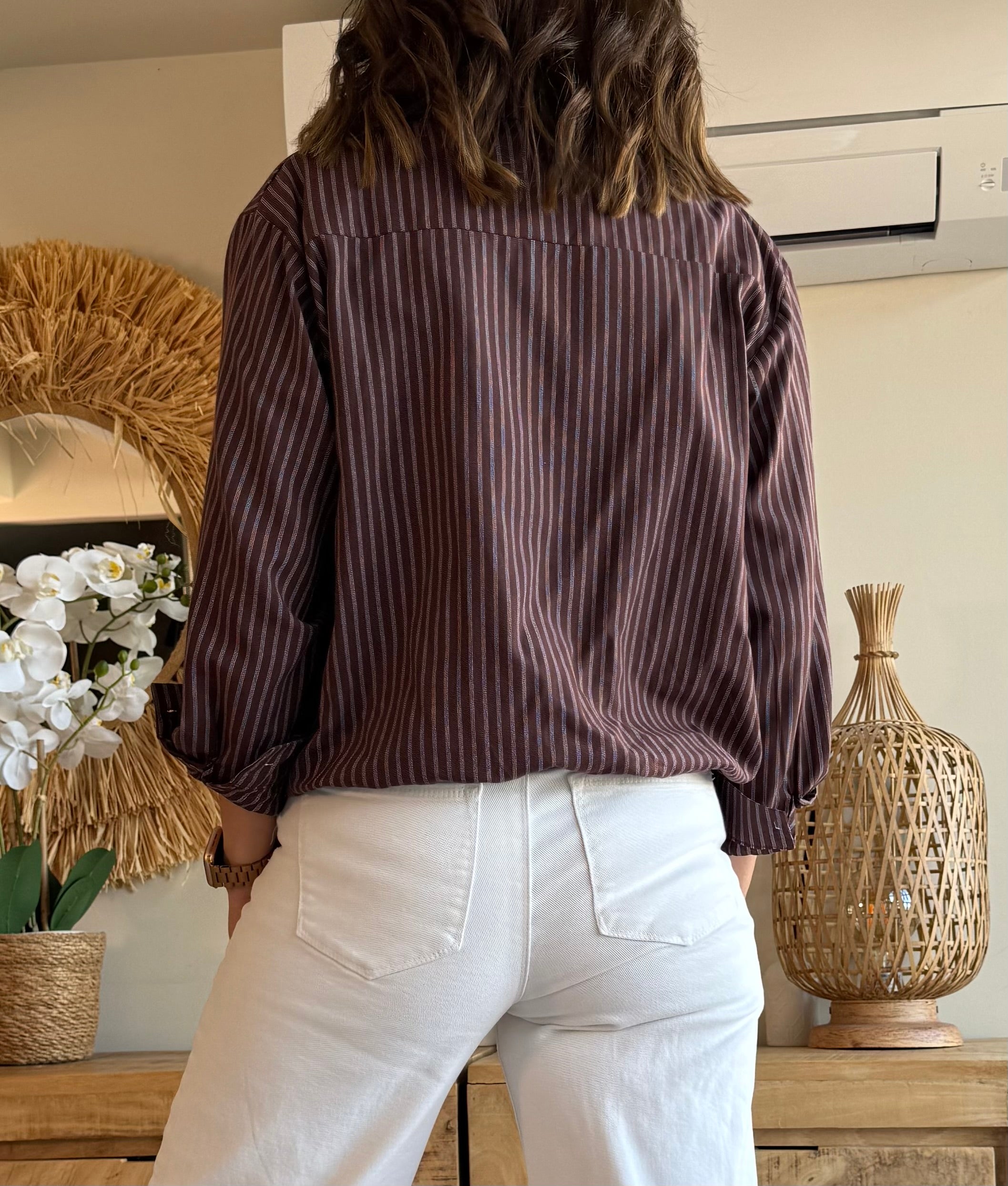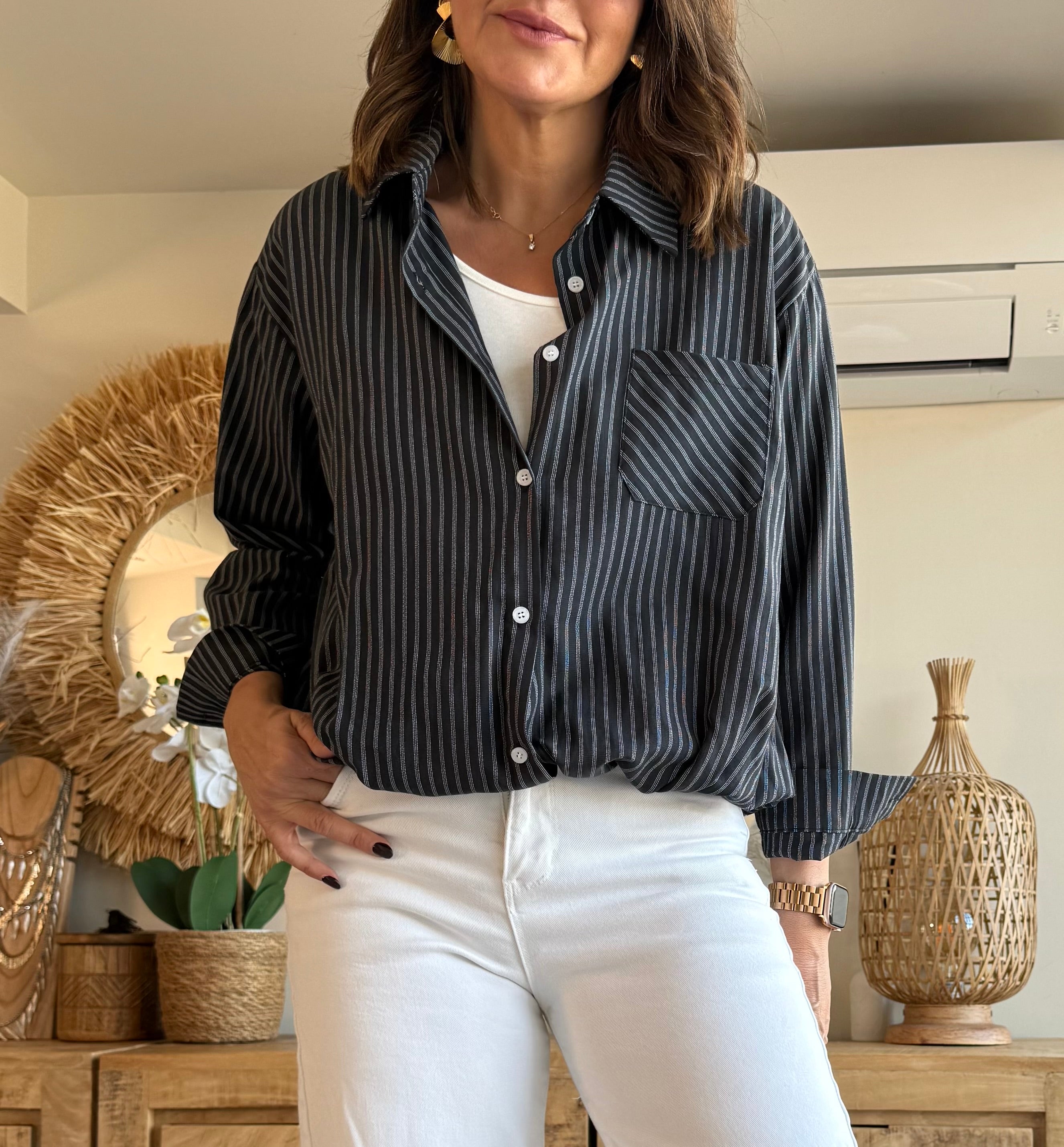 Camisa fluida de rayas con efecto doble. Lleva incorporada una camiseta interior blanca cosida al bajo, que crea un efecto de superposición muy favorecedor sin necesidad de ajustar ni meter por dentro.