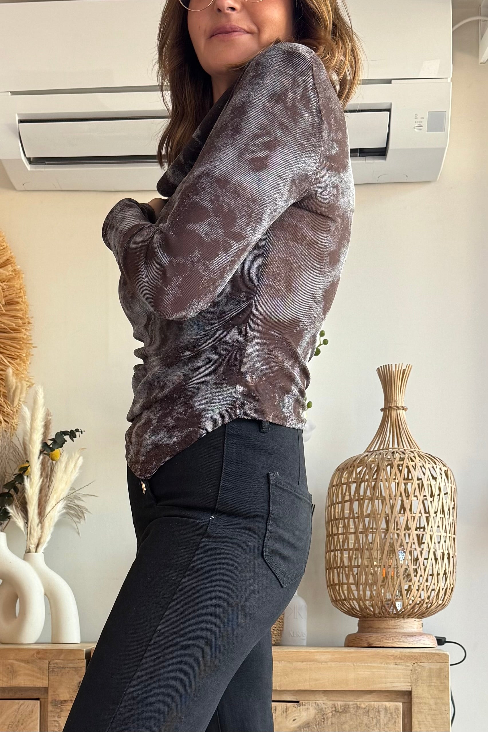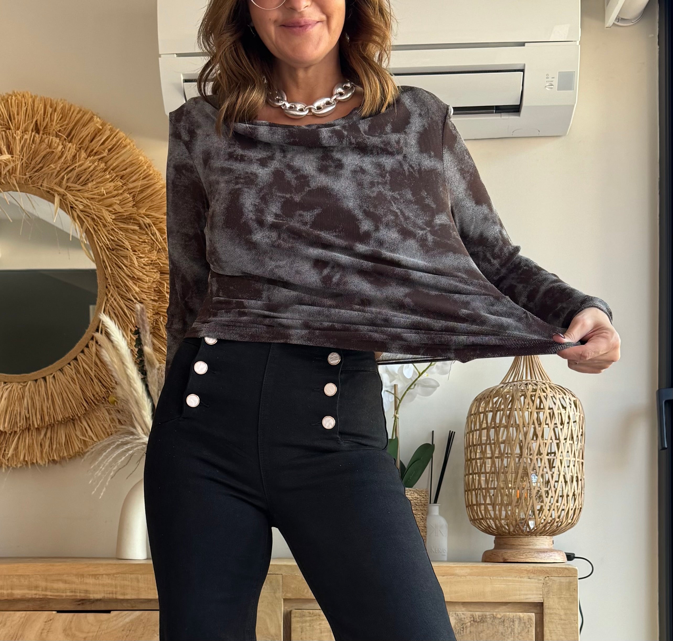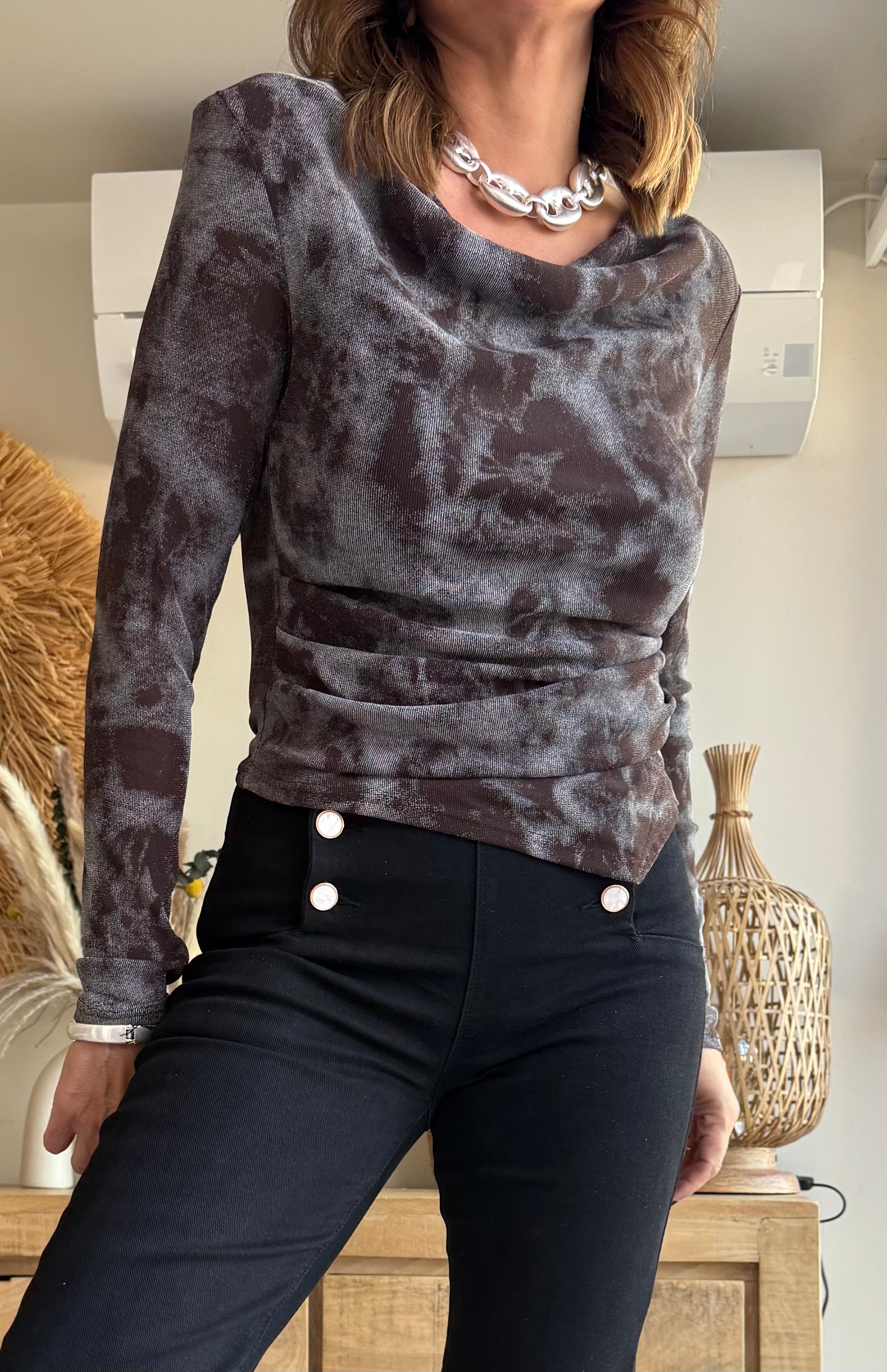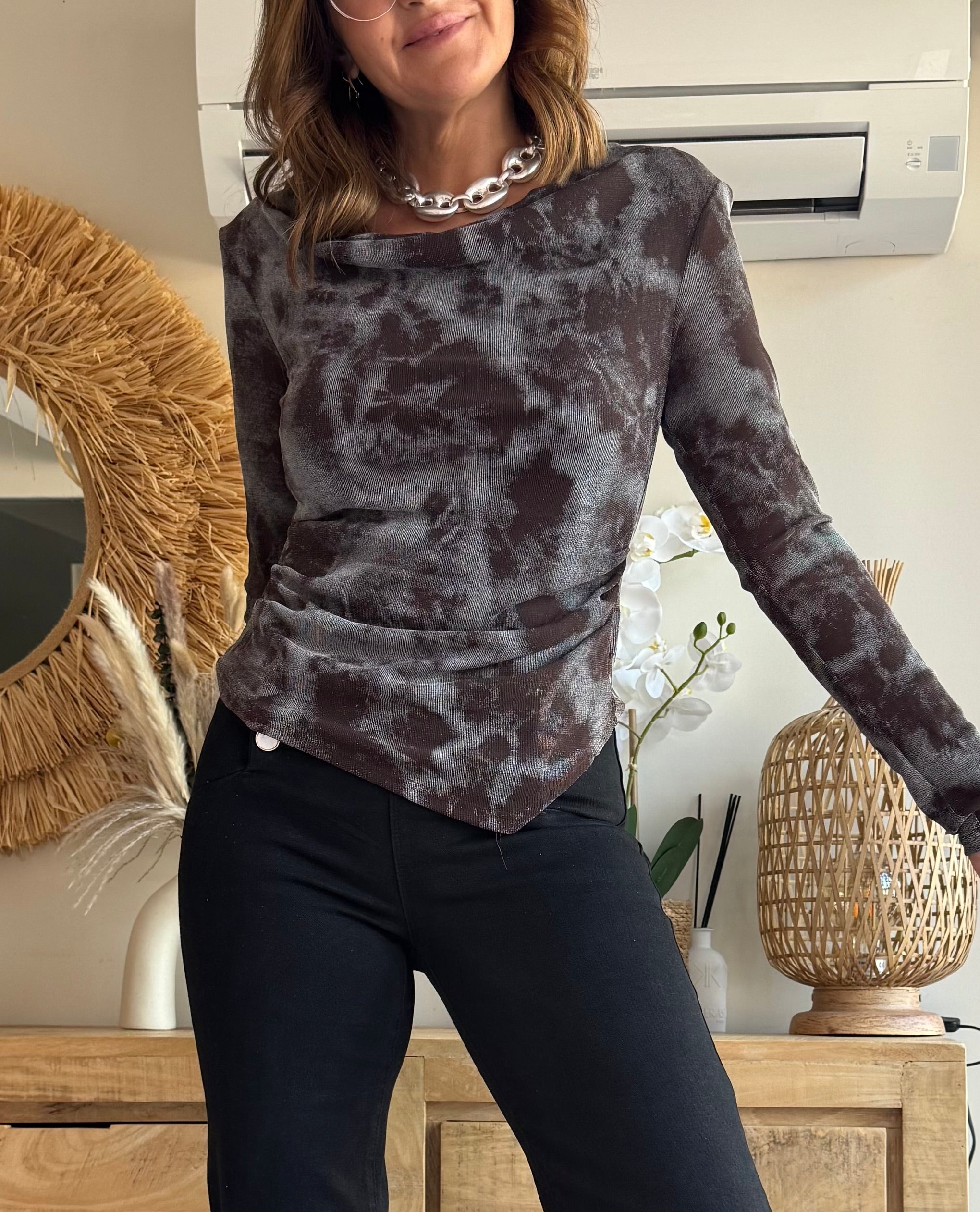 Camiseta de tejido superelástico con ligero efecto drapeado en la cintura y sutiles hombreras que estilizan la figura. Su cuello amplio y suave caída le dan un toque moderno y favorecedor.