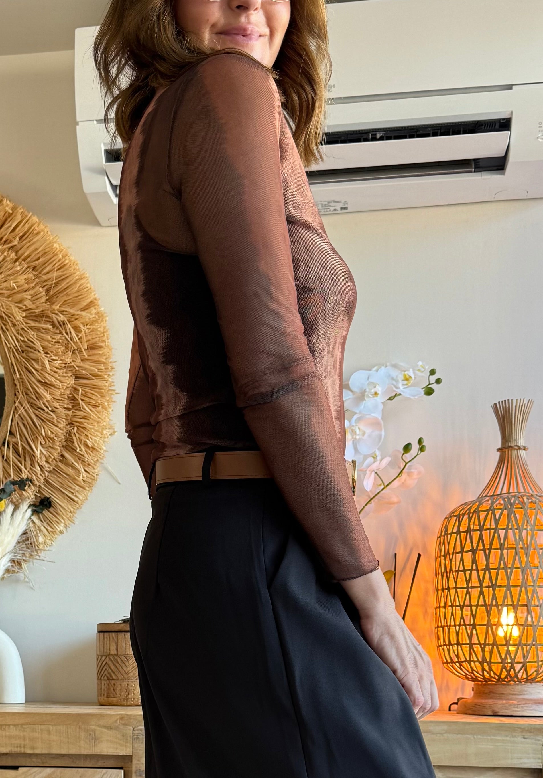 La Camiseta  Mesh es una de esas prendas que transforman cualquier look. Confeccionada en tejido elástico y semitransparente, se adapta al cuerpo con comodidad y realza la silueta sin marcar.