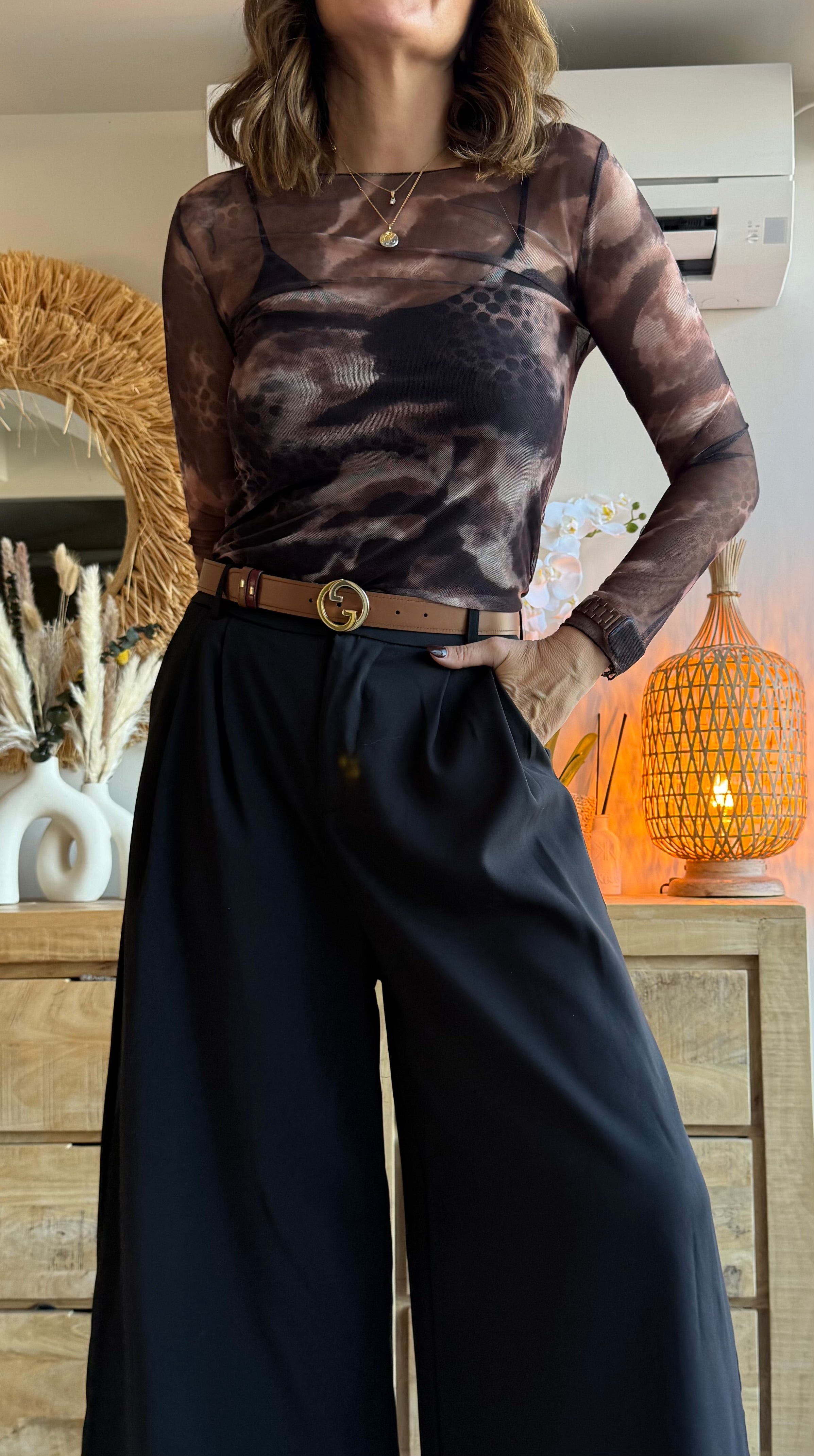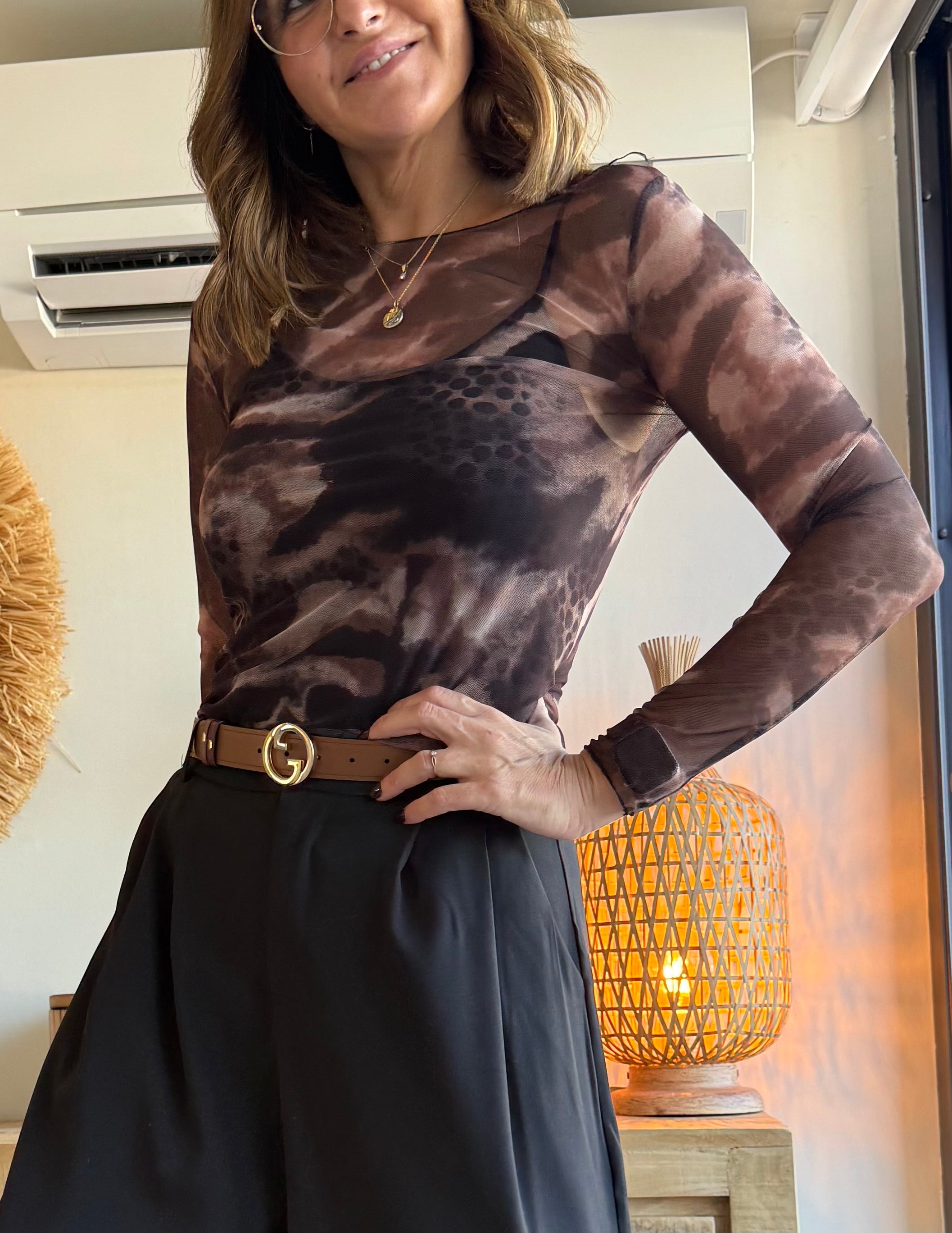 Su estampado en tonos tierra y marrones le da un toque moderno y elegante, ideal para combinar con básicos o superponer con tops y bralettes.