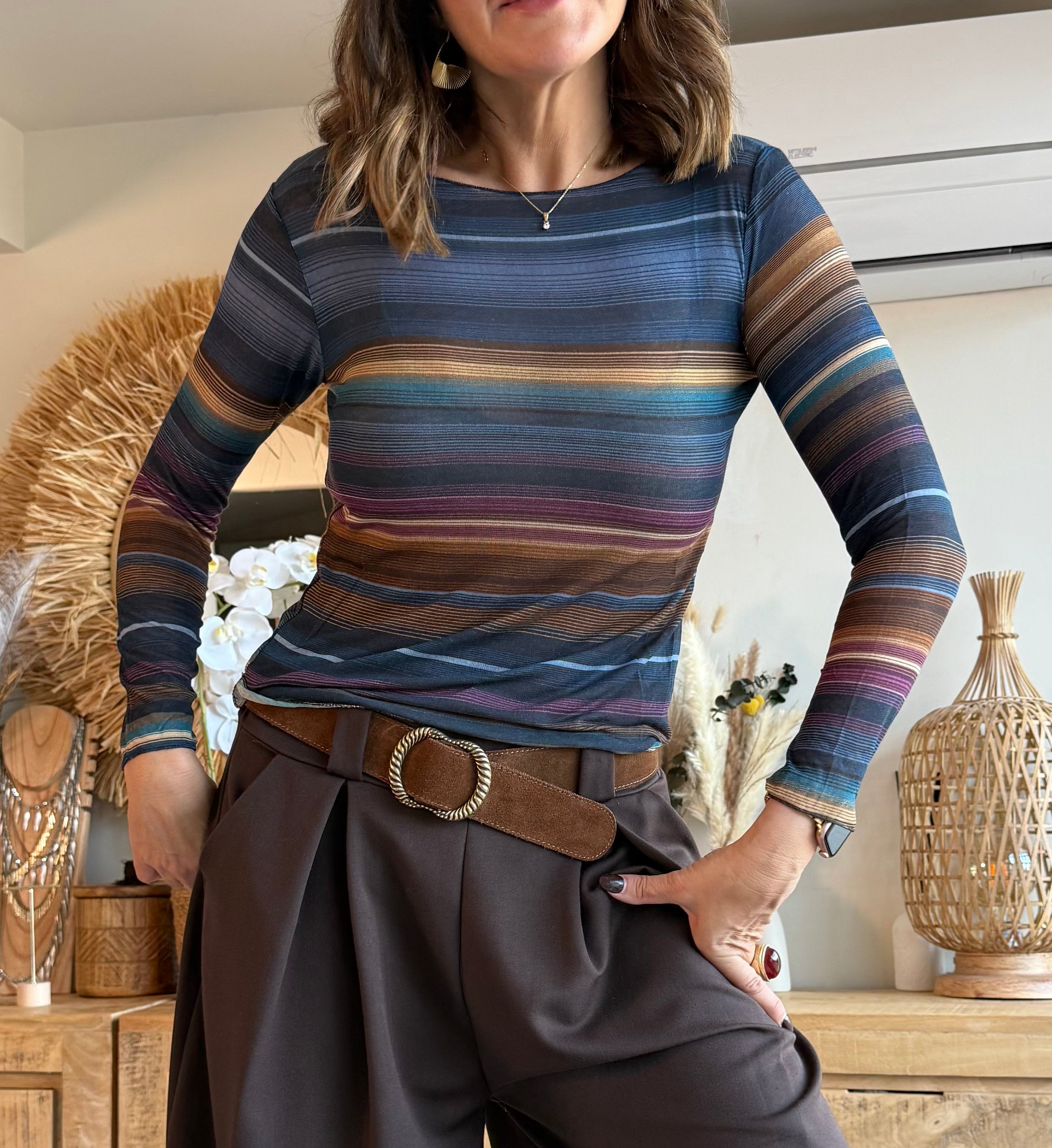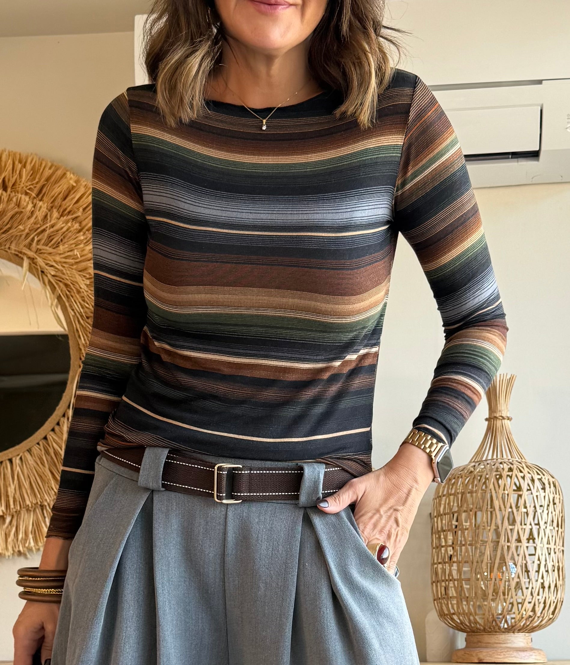 Camiseta de punto fino con estampado de rayas en tonos cálidos, confeccionada en un tejido suave y elástico con un toque de cashmere. Su corte ajustado y cómodo se adapta perfectamente al cuerpo, ideal para combinar con pantalones de pinzas o de polipiel.