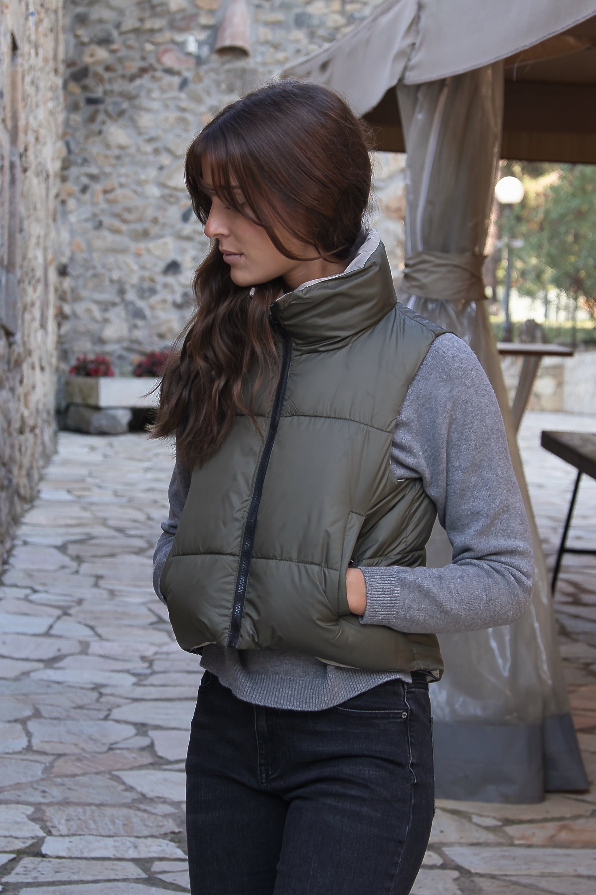 Un chaleco dos en uno ideal para tus looks de diario. Su diseño reversible te permite lucirlo por el lado liso en colores actuales —camel, khaki o negro— o por el interior en gris claro, perfecto para un estilo más neutro y suave.