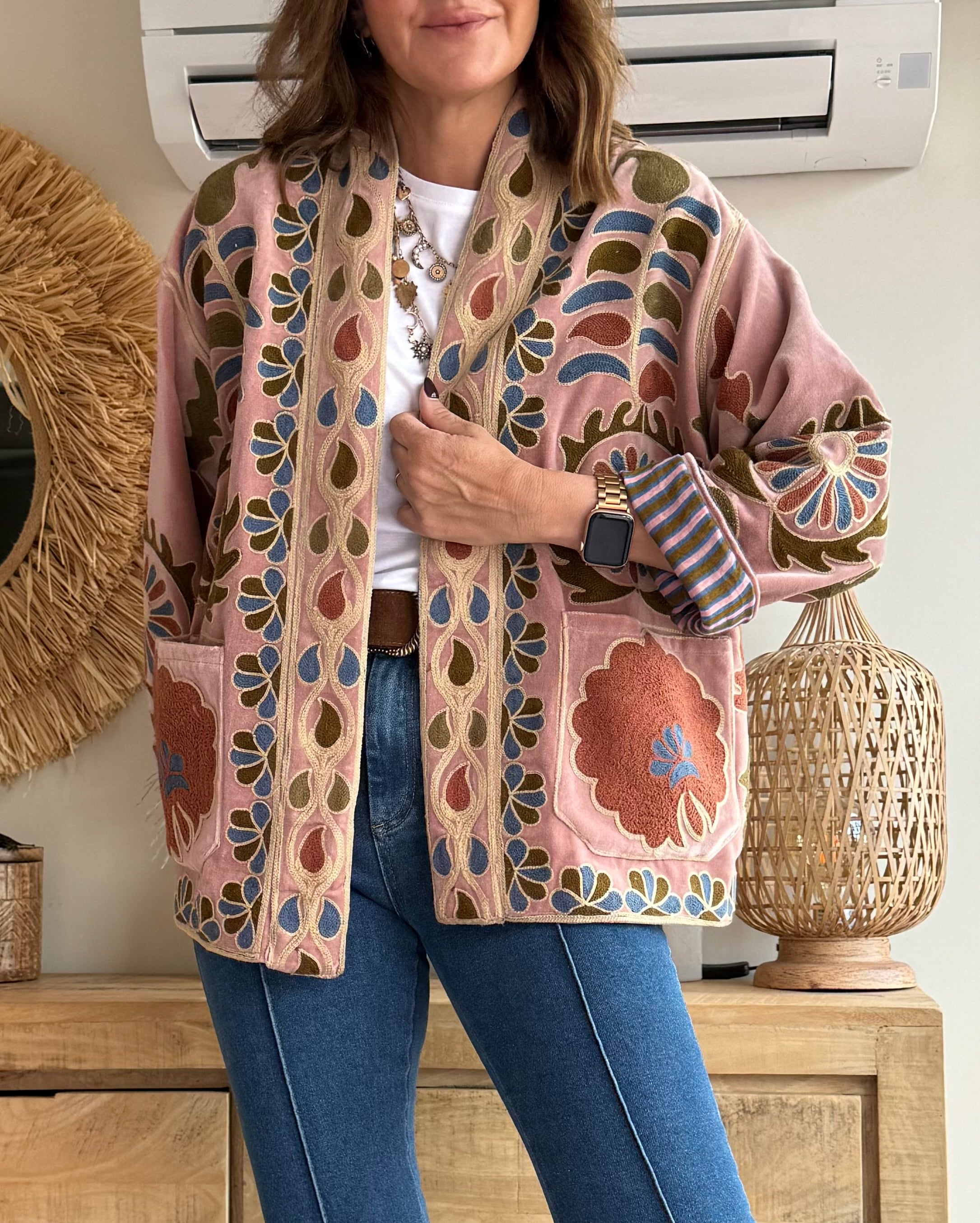 Chaqueta tipo kimono en terciopelo con bordados artesanales en tonos tierra, azul y burdeos. Una prenda especial, llena de textura y color, ideal para dar un toque único a tus looks.