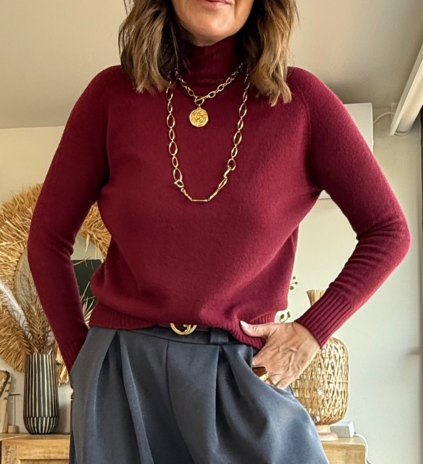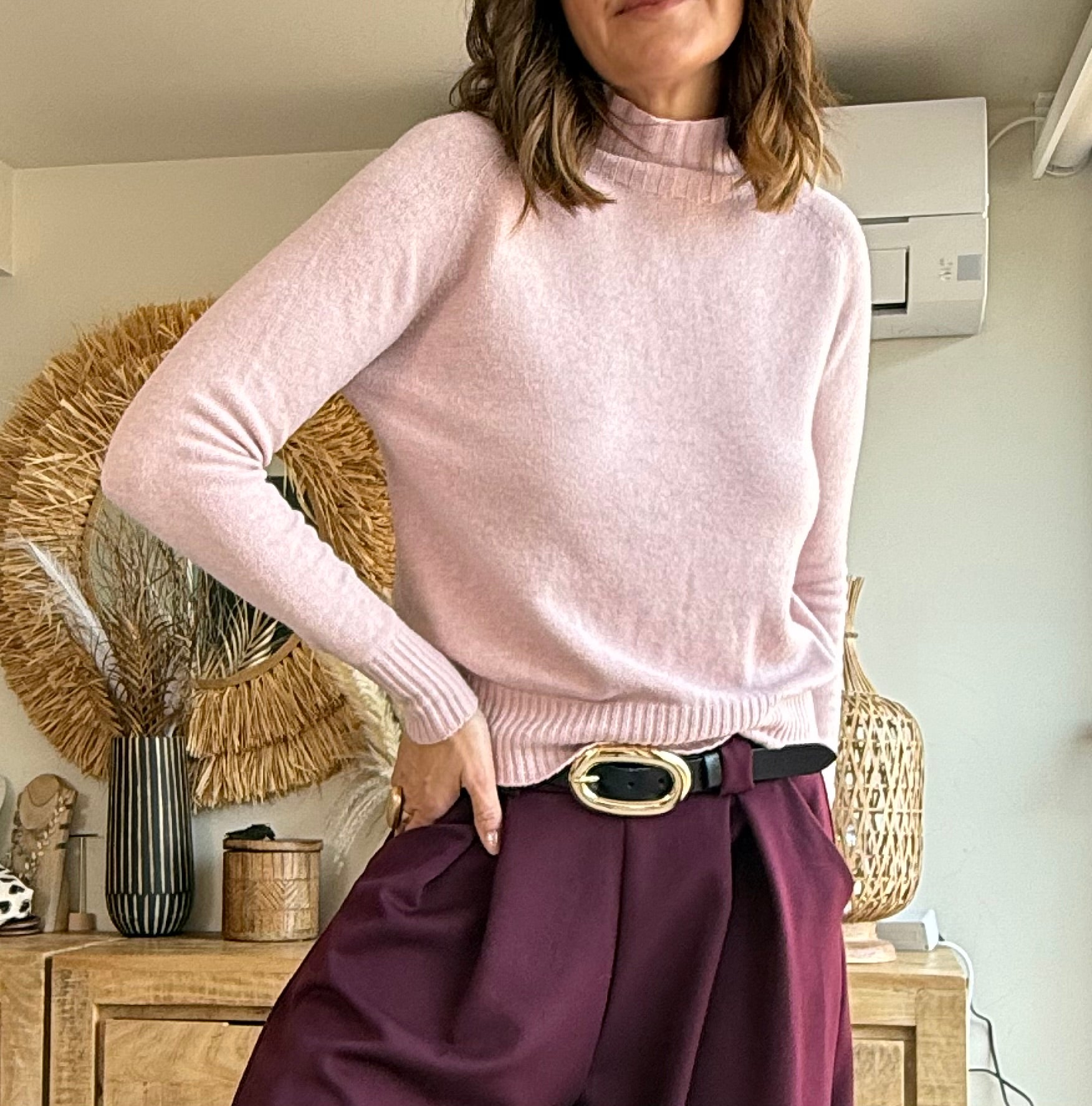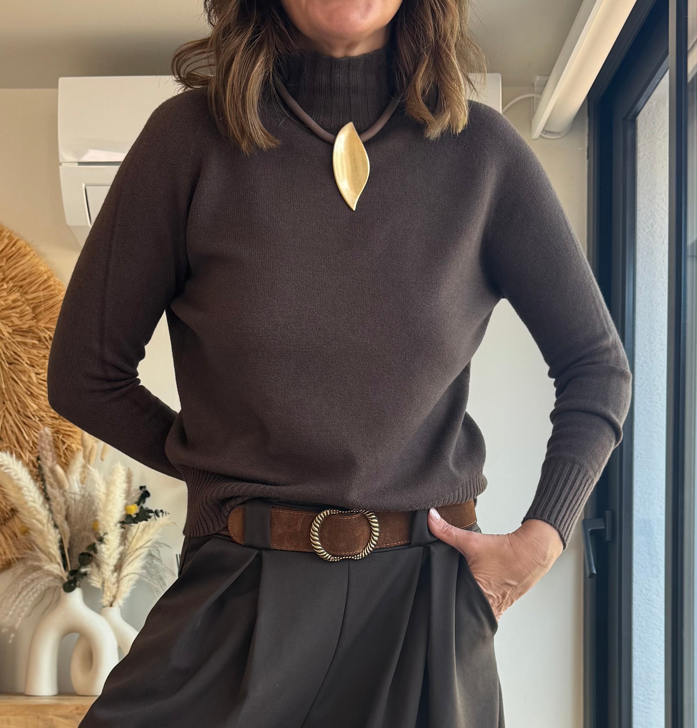 El Jersey Cuello Alto Cashmere Soft es ese básico especial que te salva cualquier look. Su tacto es extremadamente suave gracias a su mezcla ligera con cashmere, que aporta calidez sin pesar y una sensación muy agradable sobre la piel.