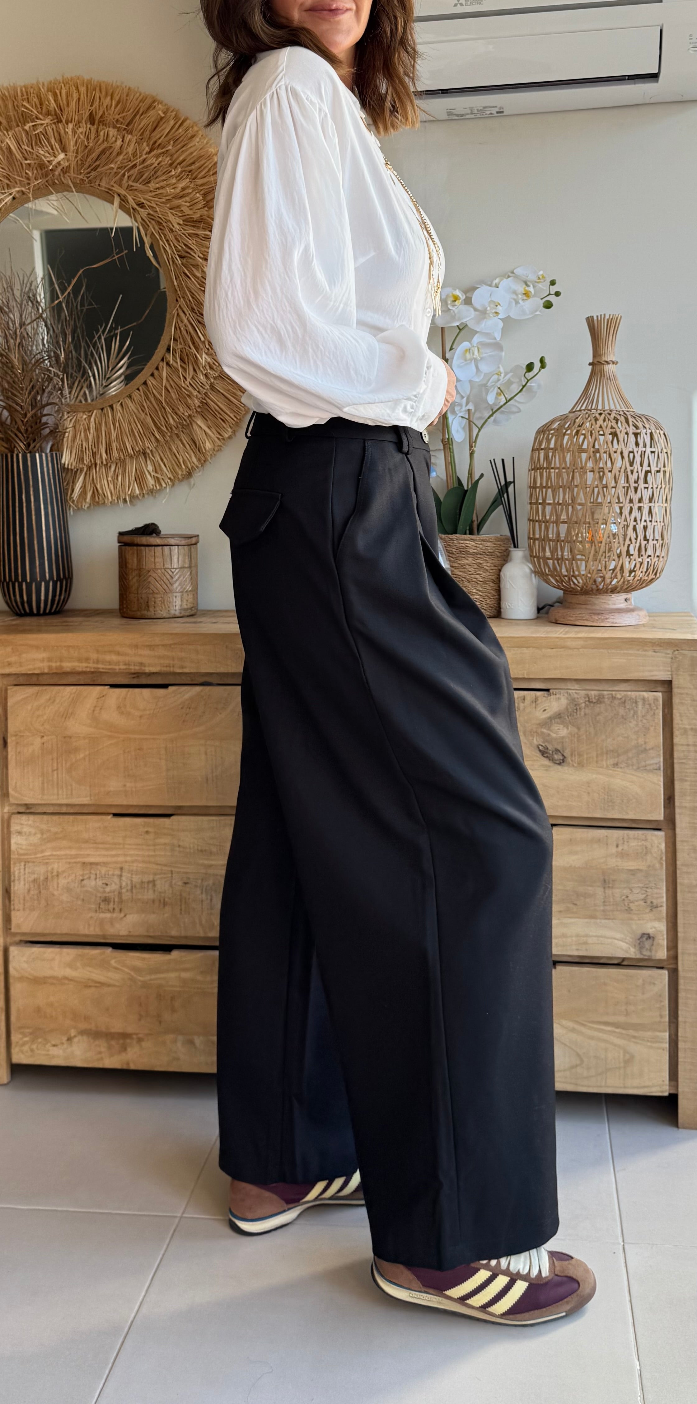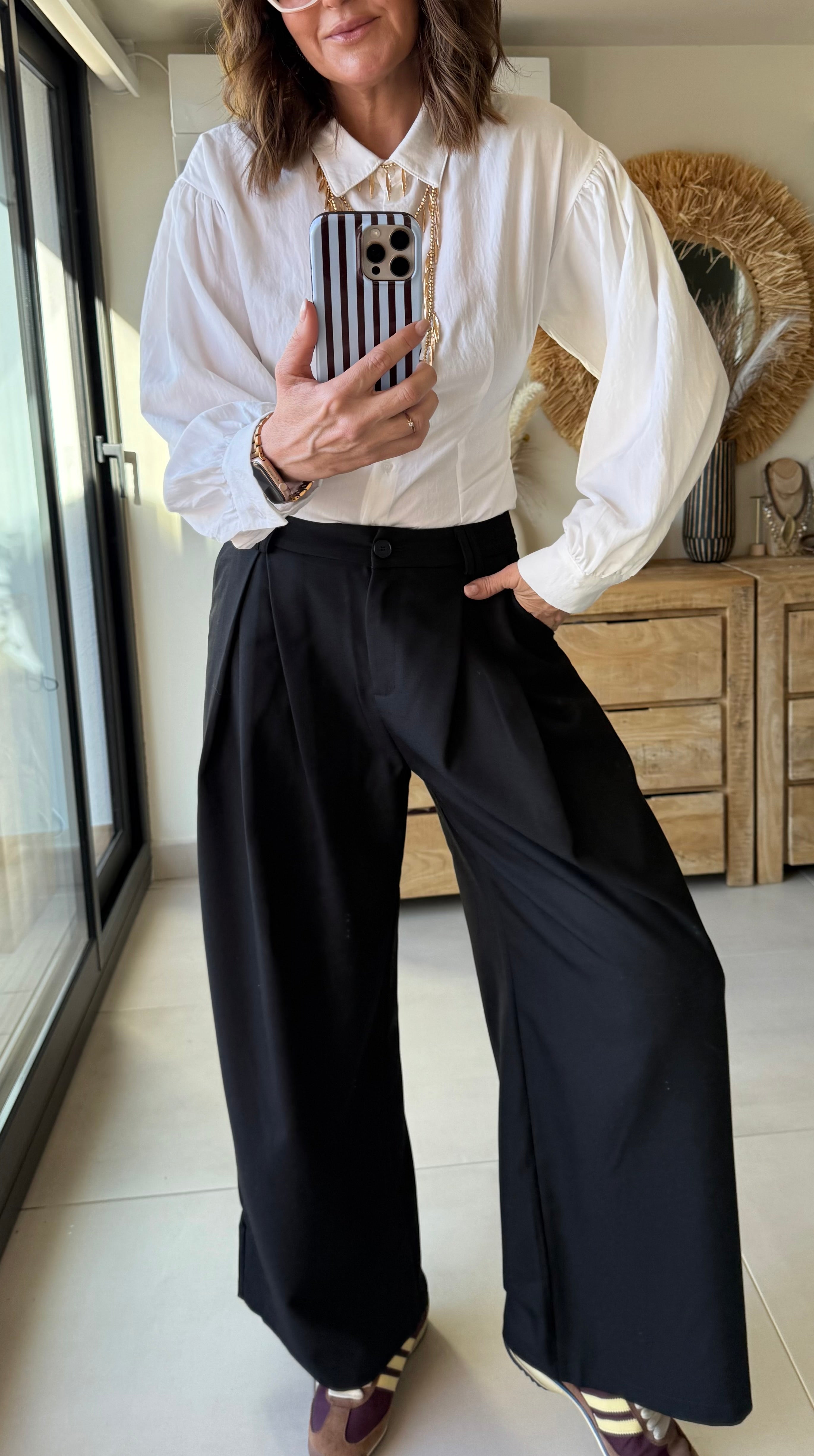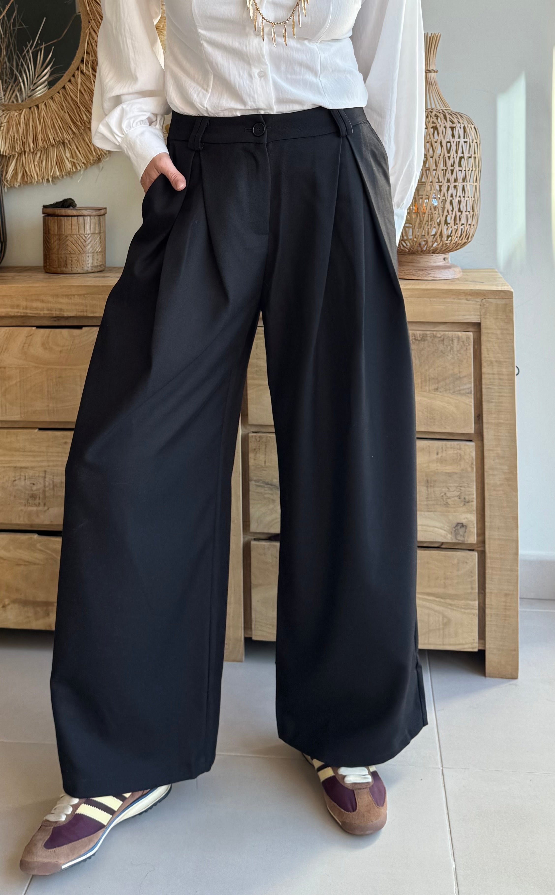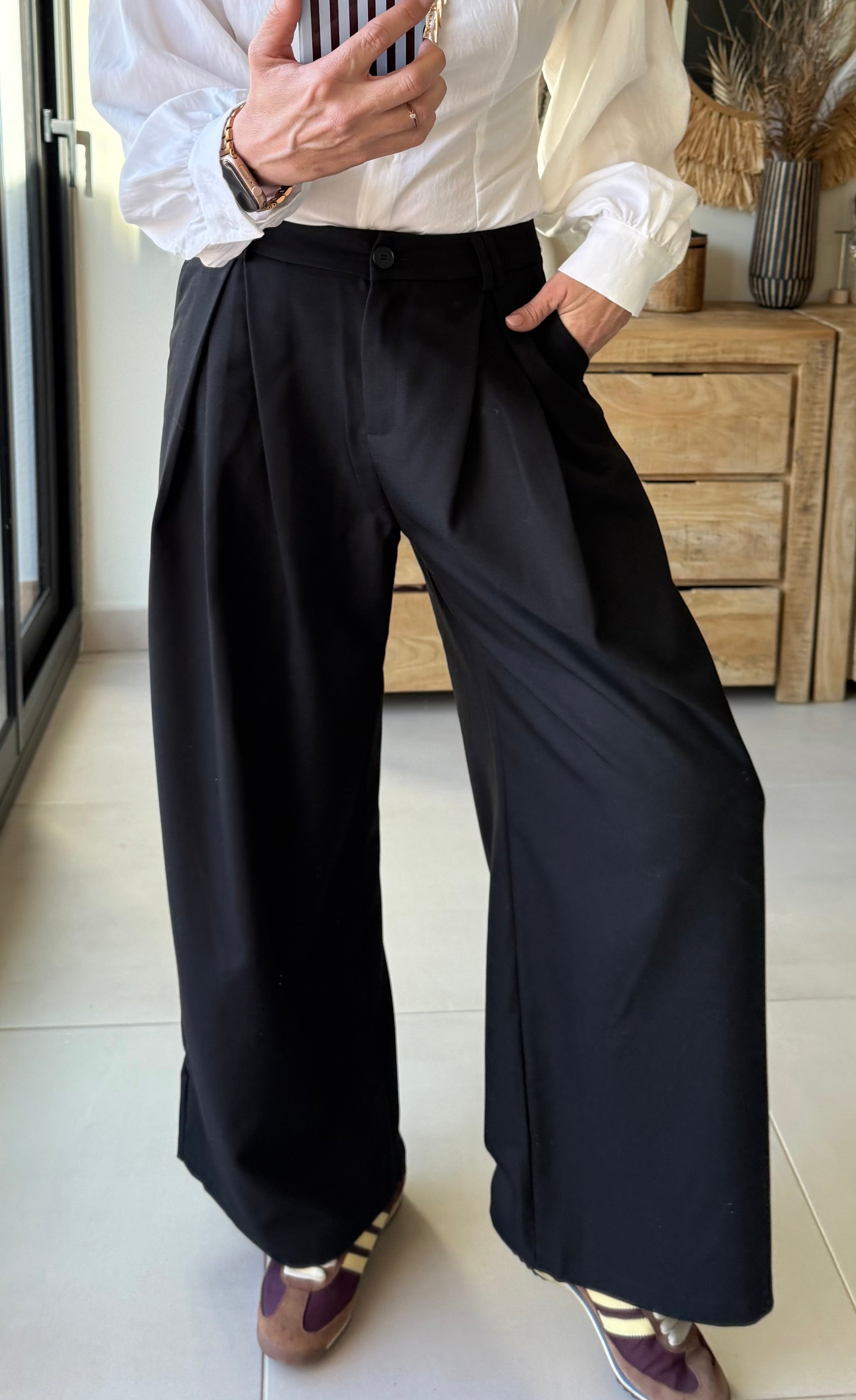 Pantalón palazzo negro con pinzas delanteras, talle medio-alto y caída amplia que estiliza un montón.