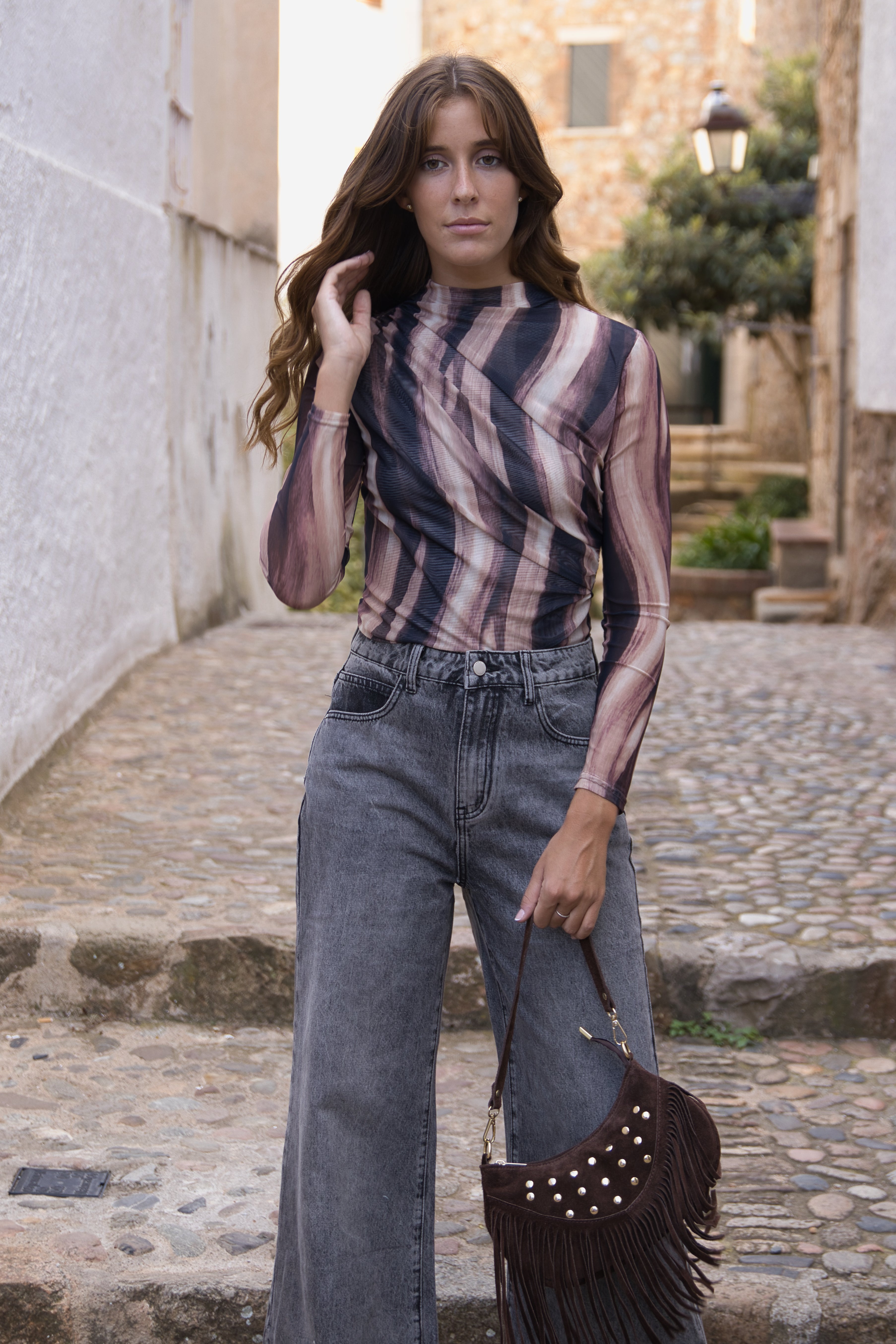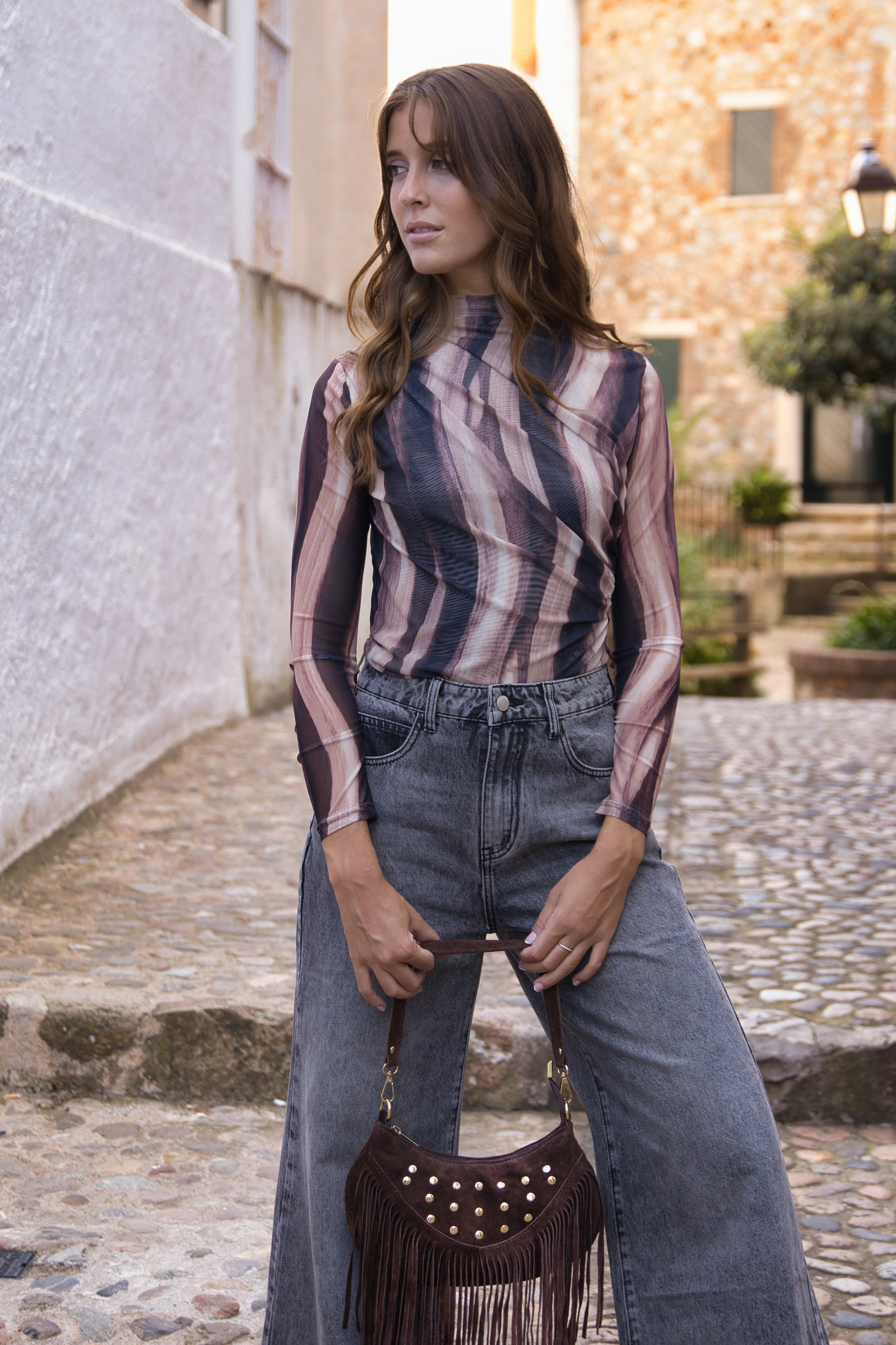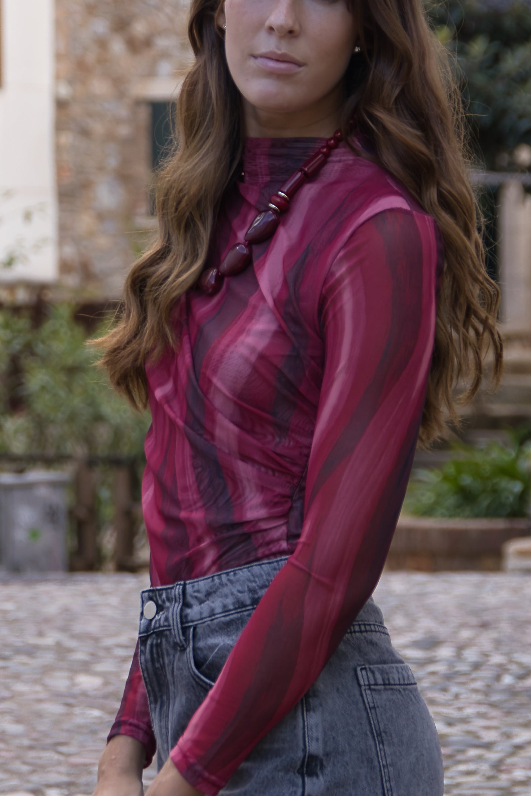 Body de gasa semitransparente con estampado efecto acuarela en tonos vibrantes. De manga larga, cuello alto y diseño ajustado que estiliza la figura. Disponible en tres colores (rojo, azul y marrón). Perfecto para llevar con blazer, chaleco o solo para un look sofisticado y diferente.Es muy elastico.
